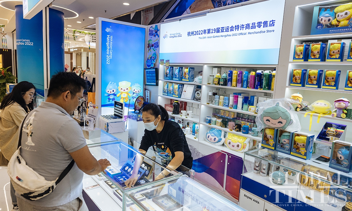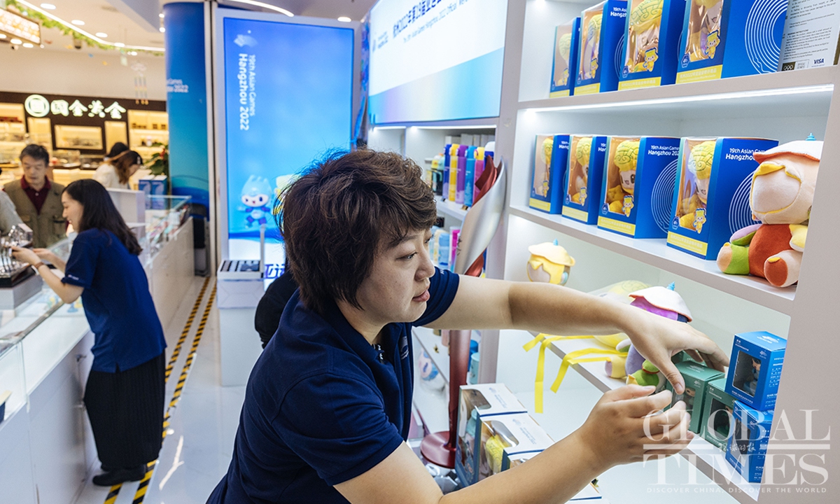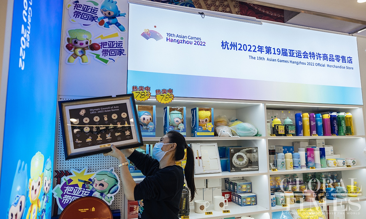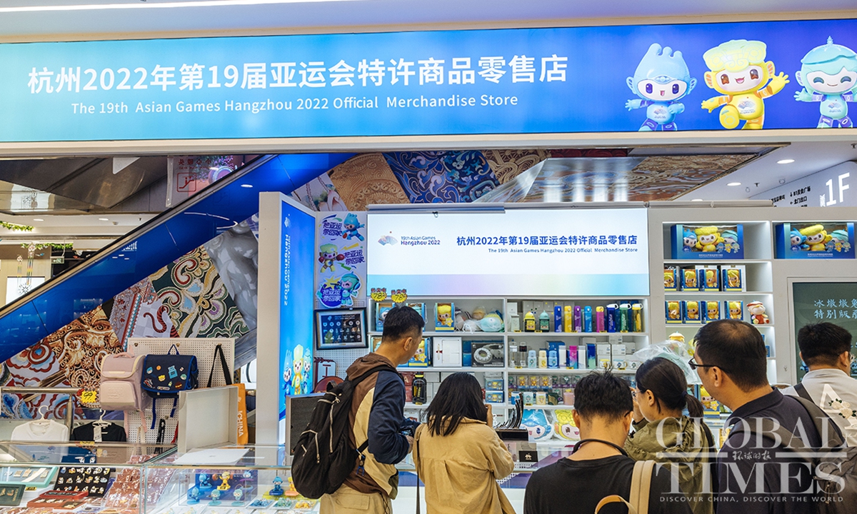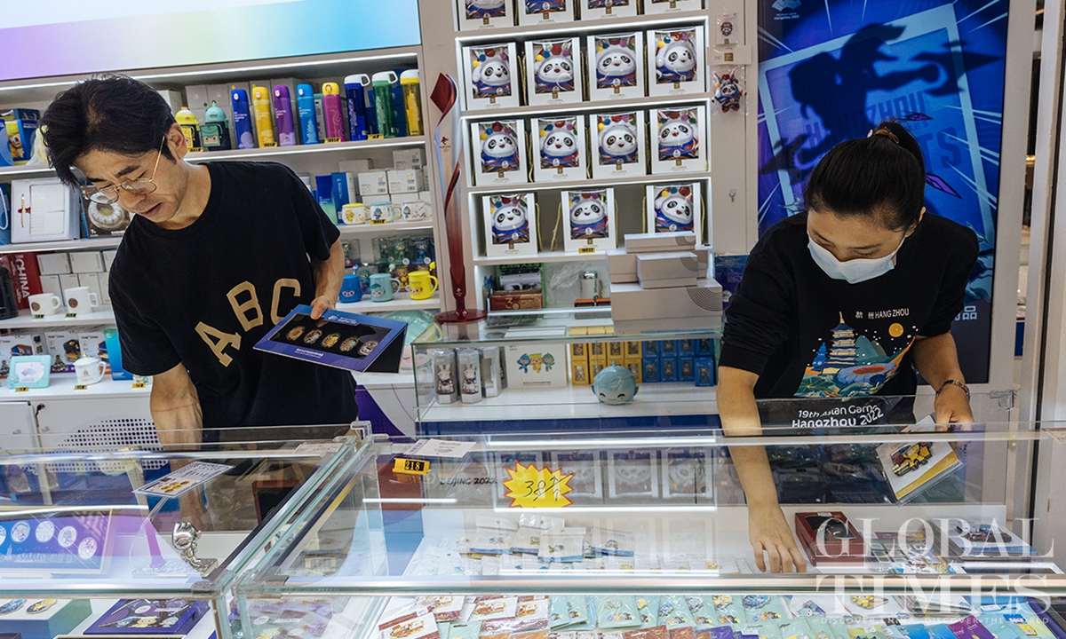 The lighting ceremony of the main torch tower for the 19th Asian Games in Hangzhou, Zhejiang Province, has wowed the world. Four exclusive merchandise items, featuring the tower's design, were unveiled on September 25, the only licensed products of the kind for the sports gala. Each set comes with limited edition numbers, certificates and anti-counterfeiting labels.(Photos:Li Hao/GT)