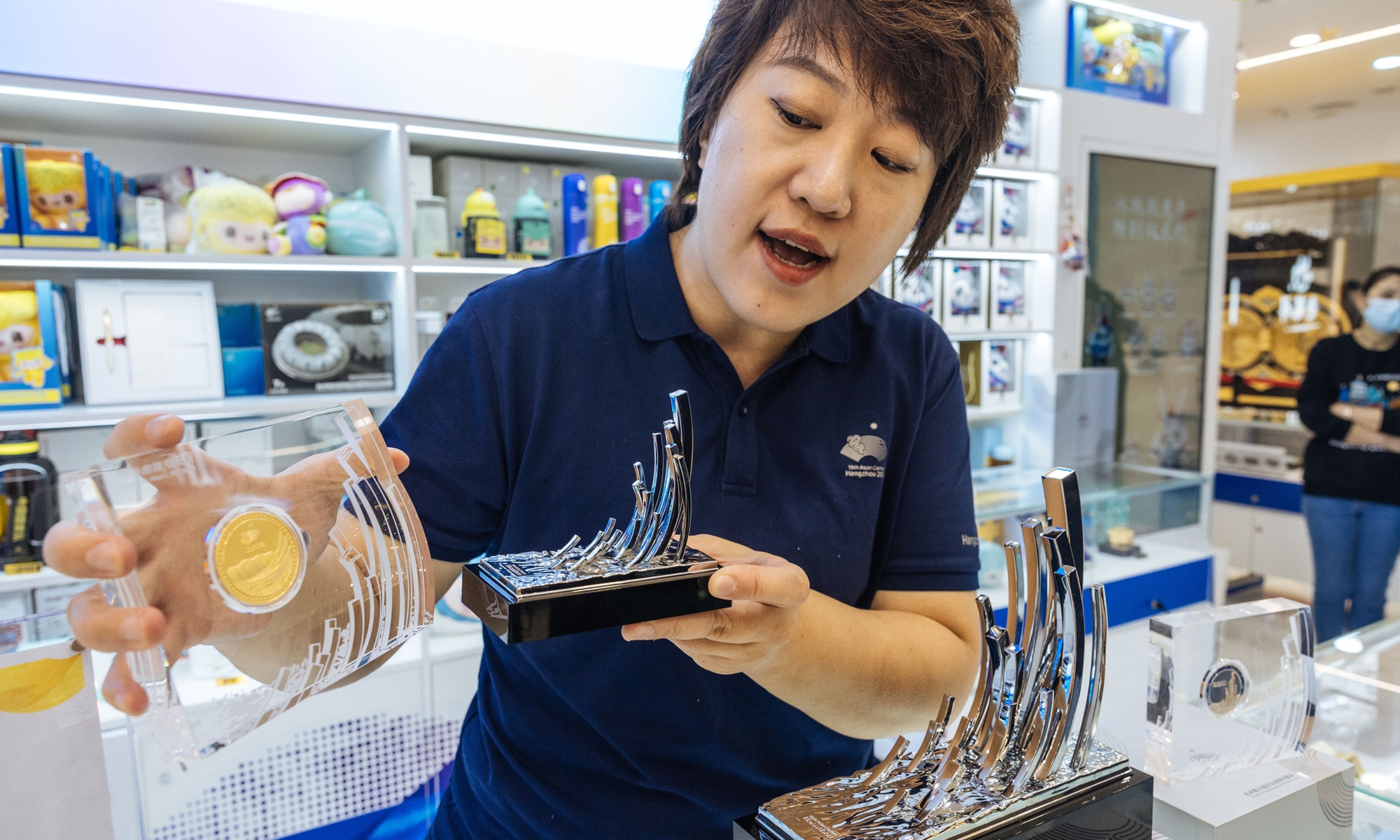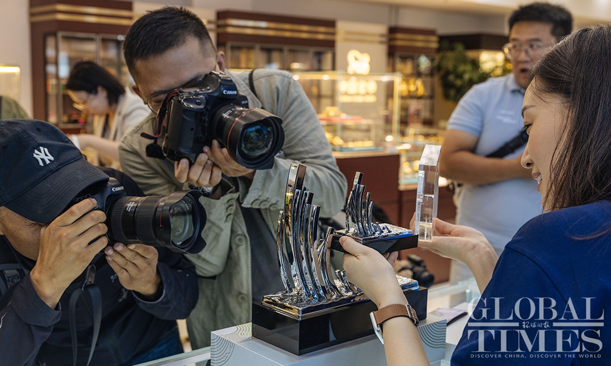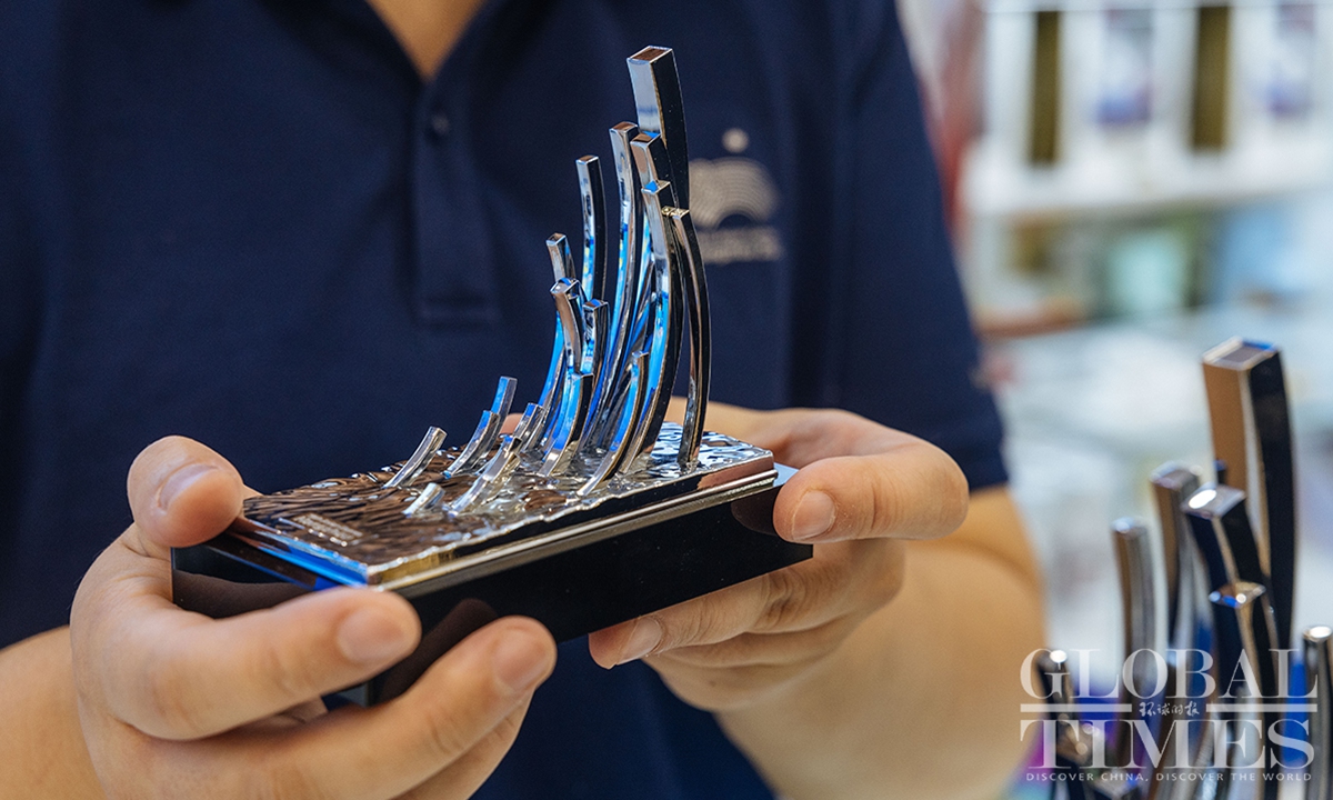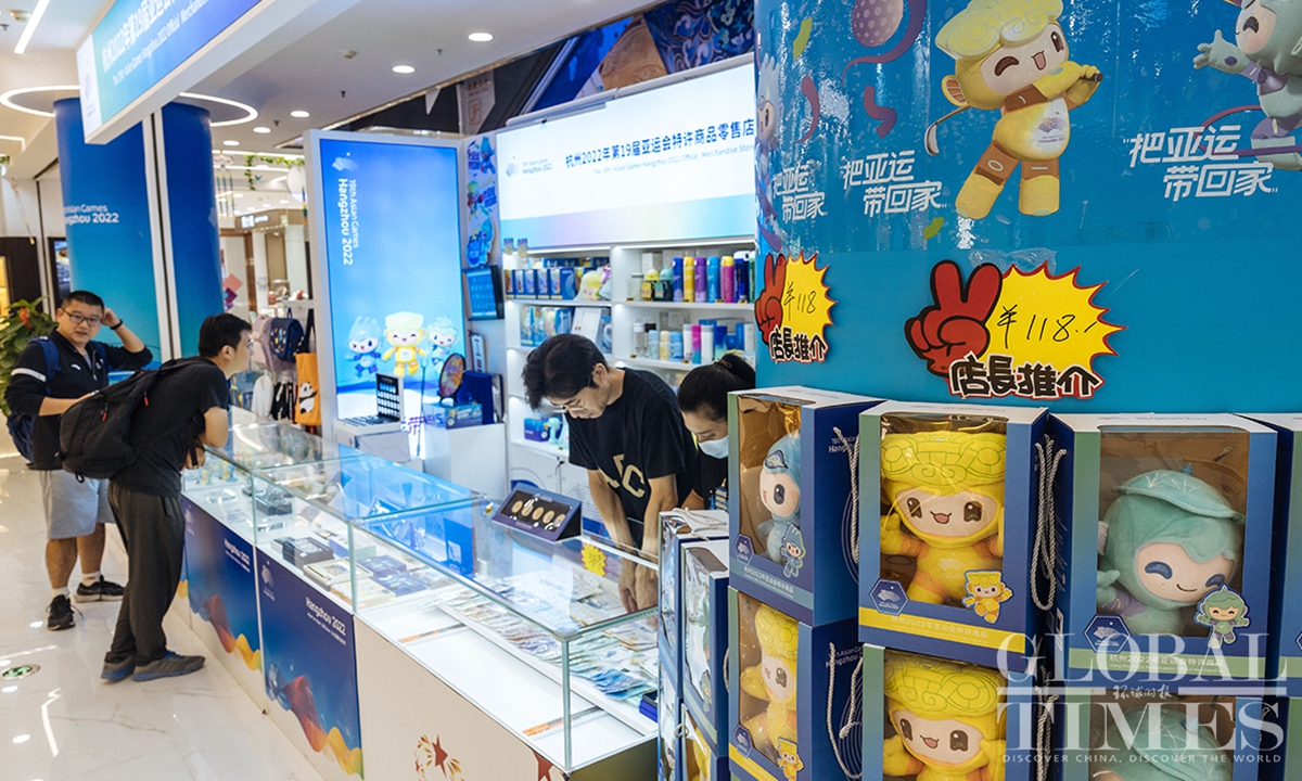 The lighting ceremony of the main torch tower for the 19th Asian Games in Hangzhou, Zhejiang Province, has wowed the world. Four exclusive merchandise items, featuring the tower's design, were unveiled on September 25, the only licensed products of the kind for the sports gala. Each set comes with limited edition numbers, certificates and anti-counterfeiting labels.(Photos:Li Hao/GT)