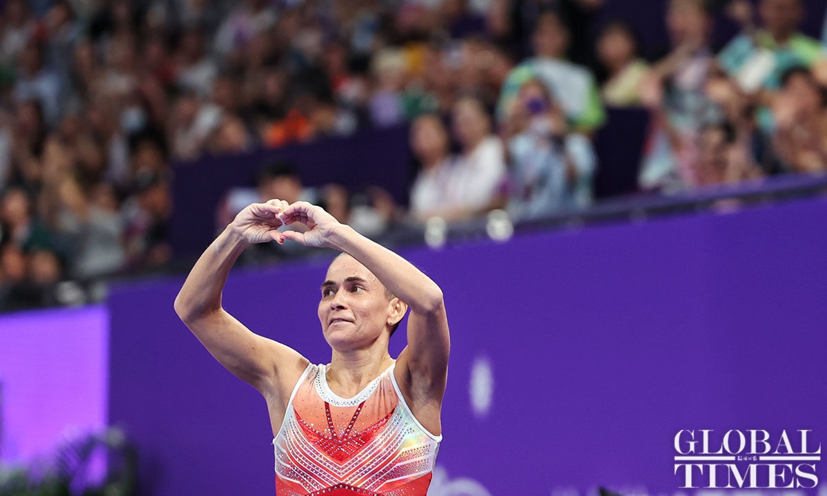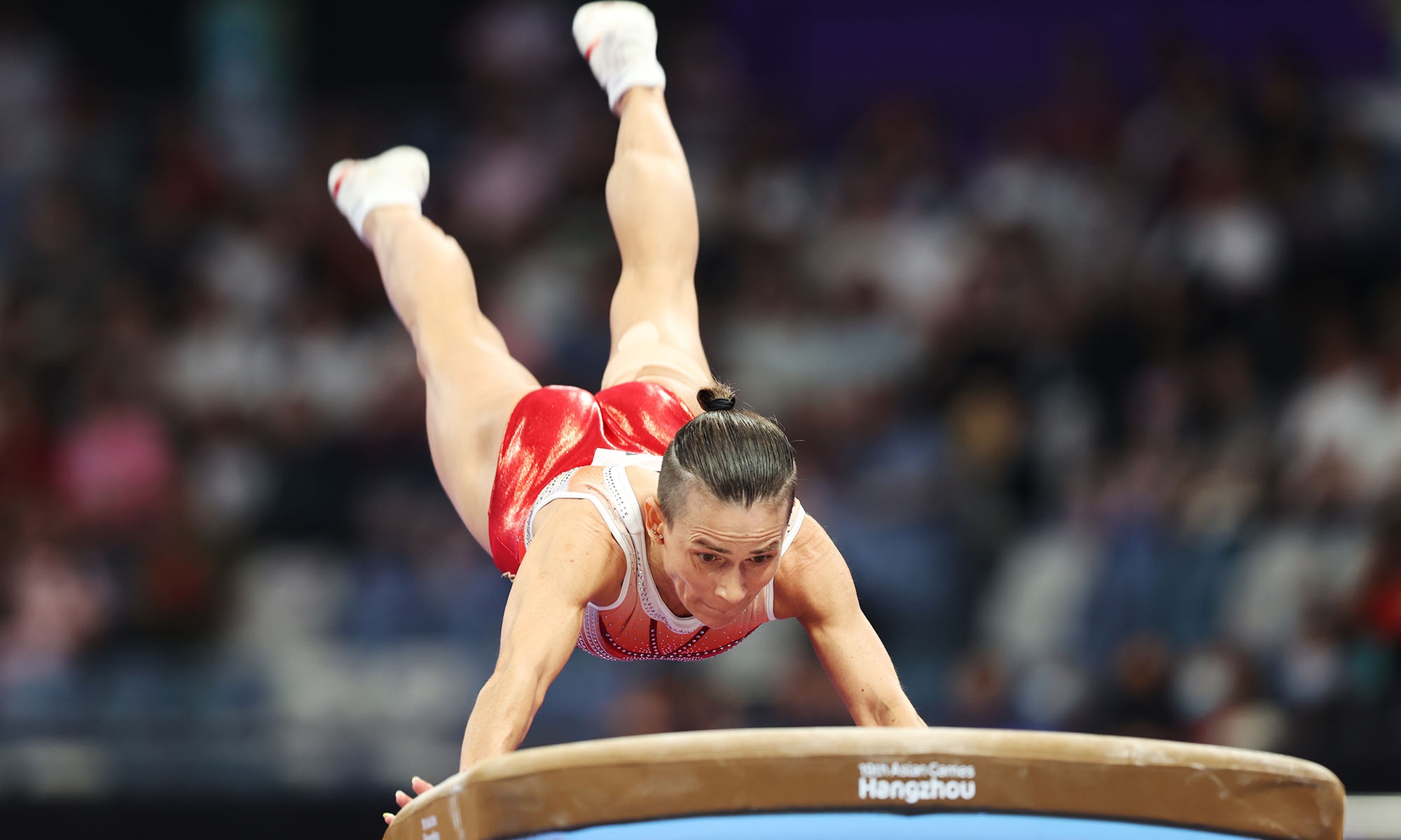 On September 25, Oksana Chusovitina, a 48-year-old gymnast from Uzbekistan, competed in the women's vault qualification round at the Hangzhou Asian Games. After vaulting the horse, she raised both hands above her head and made a heart gesture toward the audience.