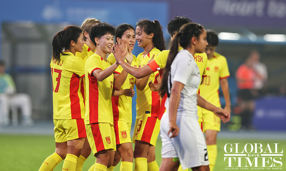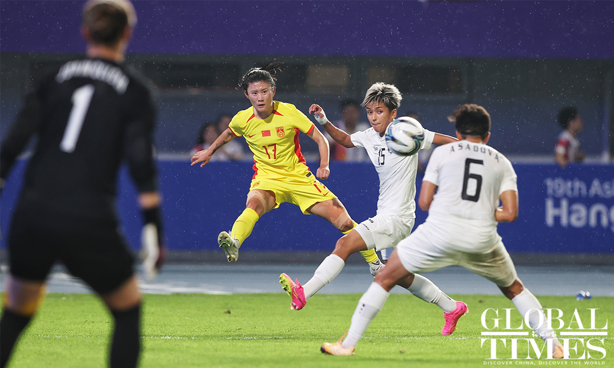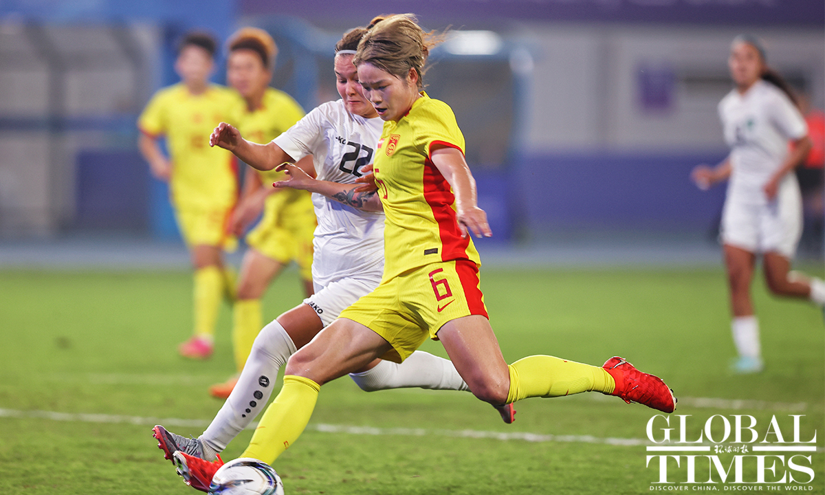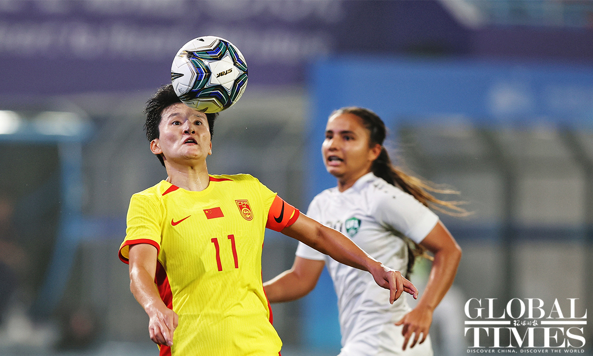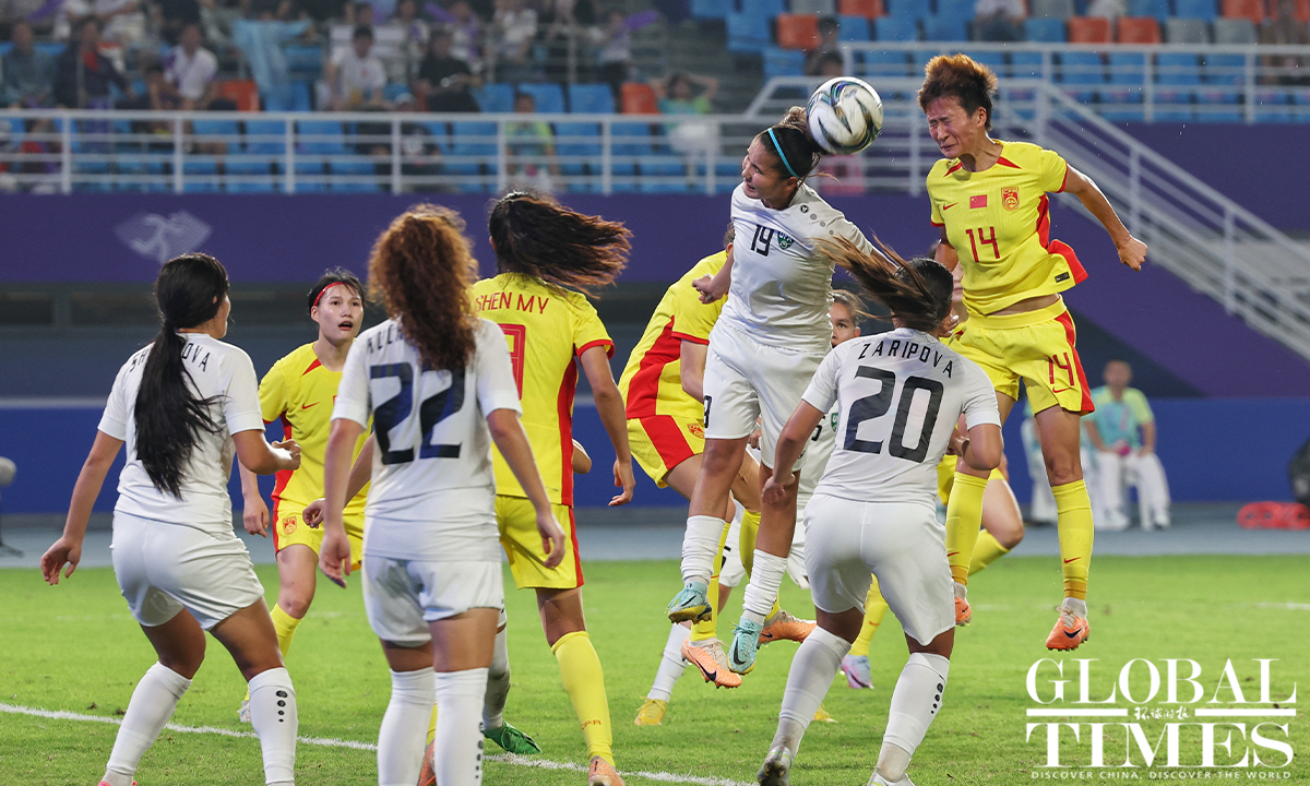 In the final round of Group A in the women's football competition at the Hangzhou Asian Games on September 28, the Chinese women's football team defeats Uzbekistan with a score of 6-0, securing the top spot in the group with two consecutive victories and smoothly advancing to the quarter-finals. They will face Thailand, the second-place team in Group B, in the quarter-finals. (Photos:Cui Meng/GT)