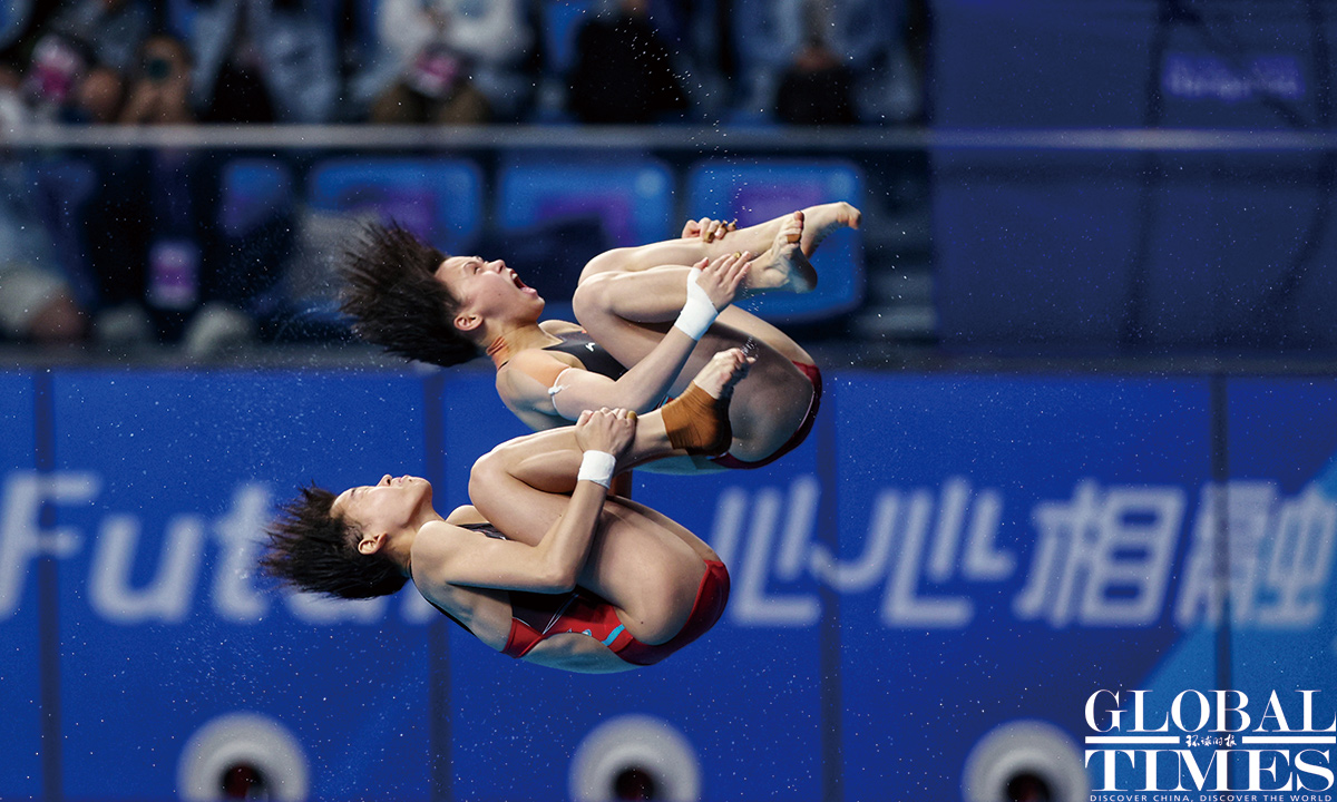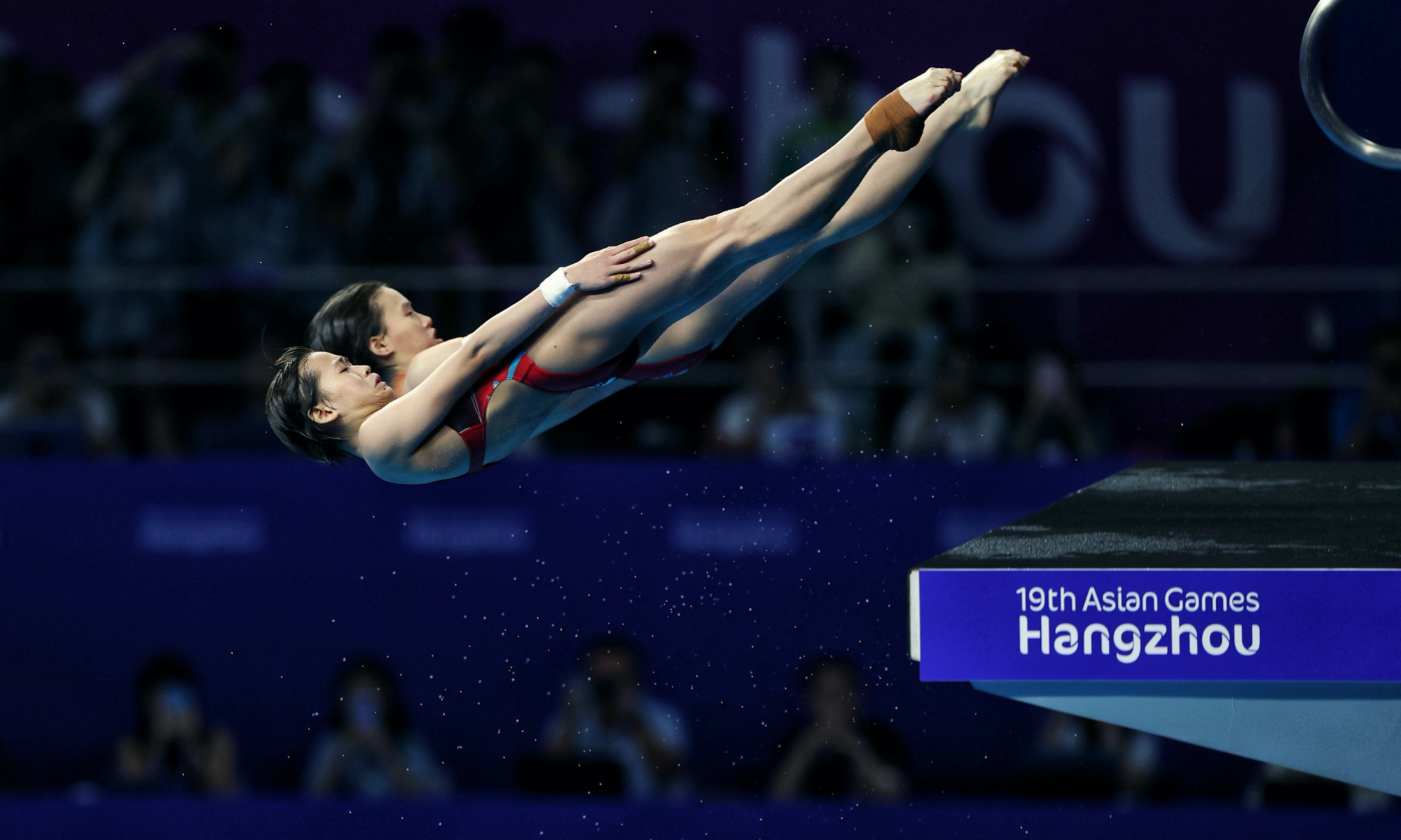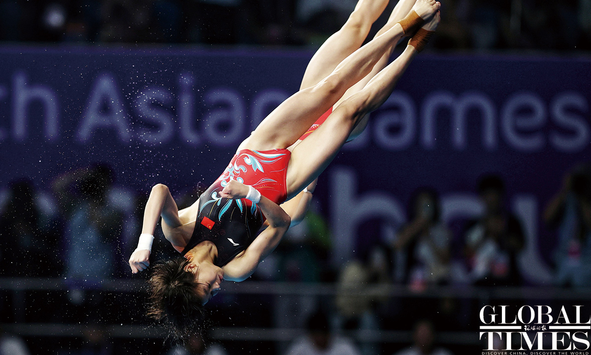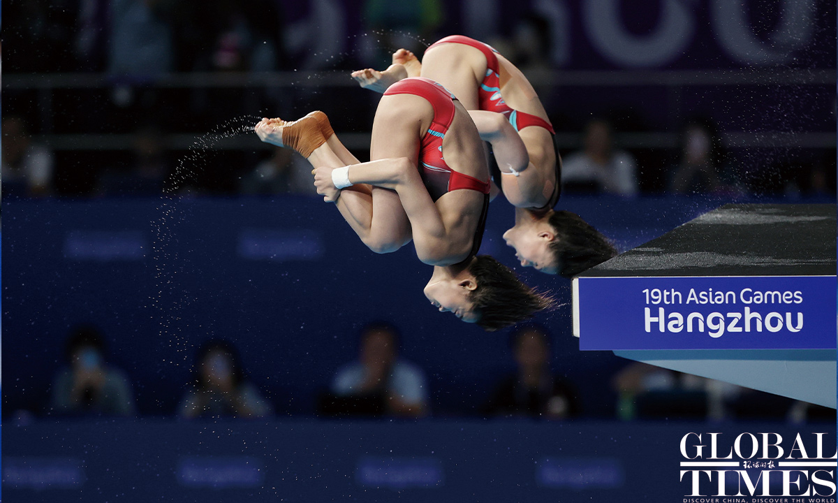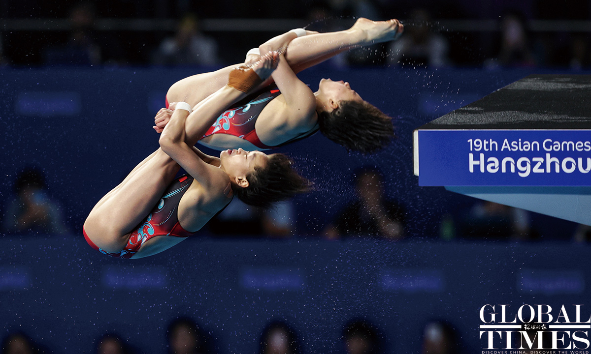 Chinese divers Quan Hongchan and Chen Yuxi from Team China won the gold medal in Women's Synchronised 10m Platform Final at the #Hangzhou Olympic Sports Centre Aquatic Sports Arena. #AsianGames Photos: Cui Meng/GT