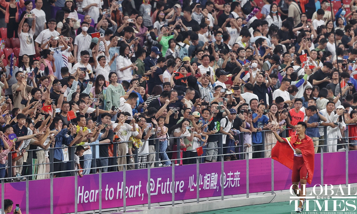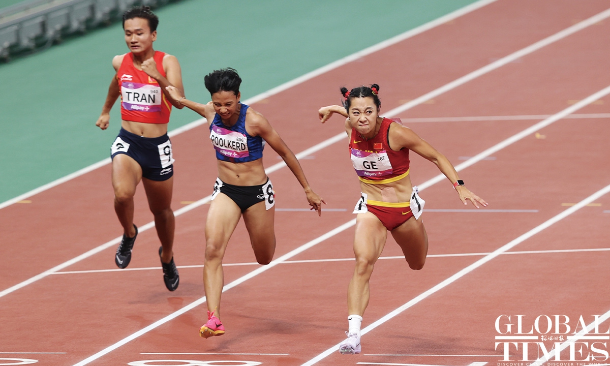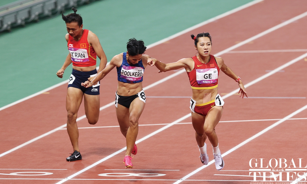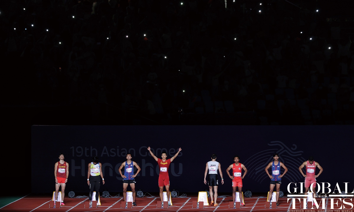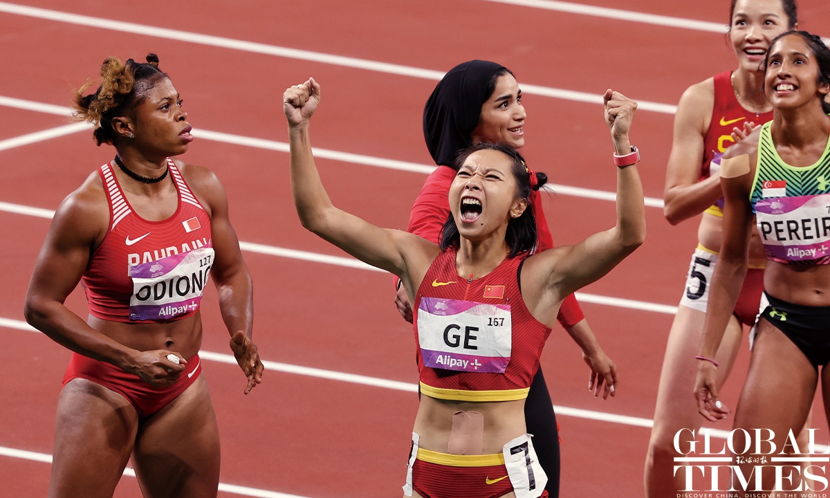 Chinese sprinter Ge Manqi claimed the women's 100m title and Xie Zhenye nailed the men's 100m gold at the 19th Asian Games in Hangzhou, East China's Zhejiang Province, on Sep 30, 2023. Photos: Cui Meng/GT