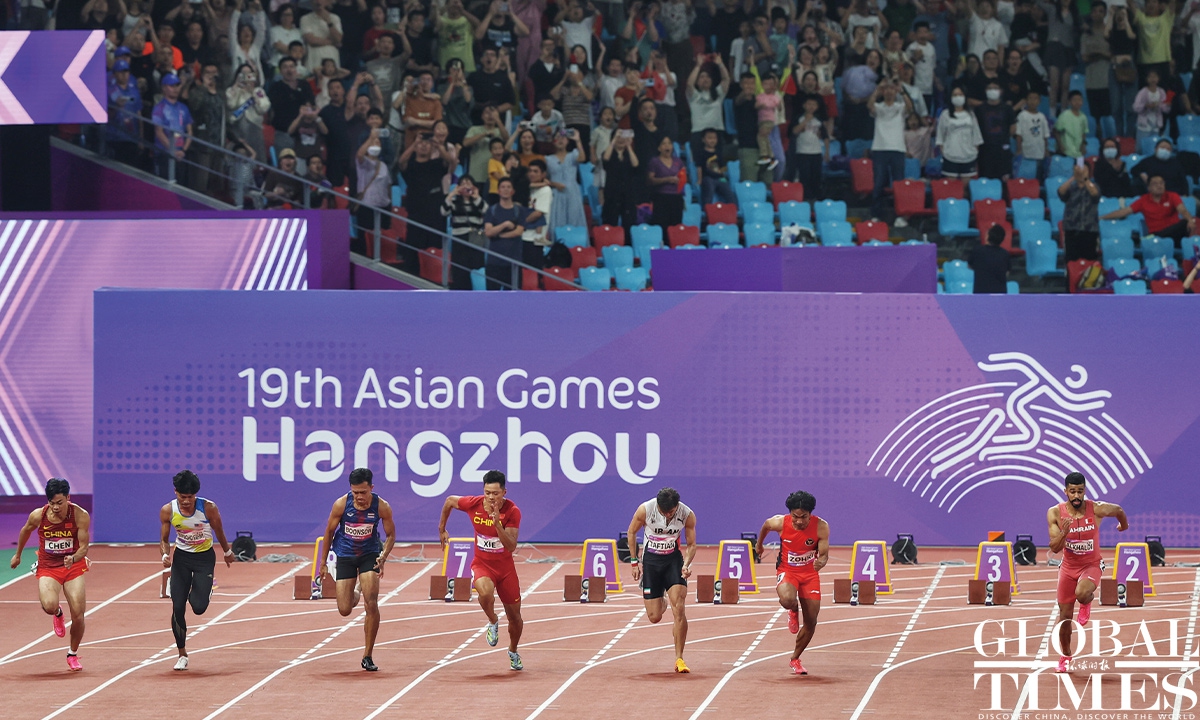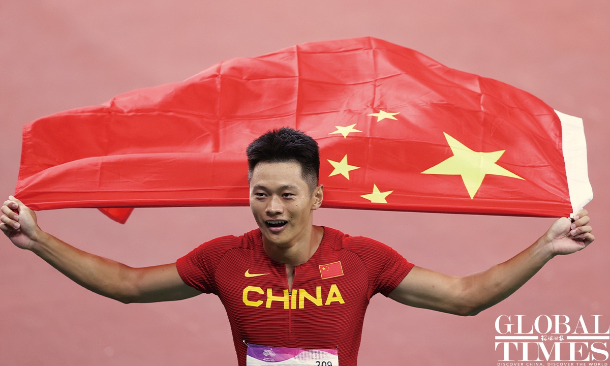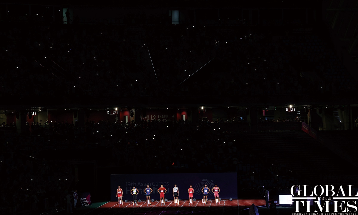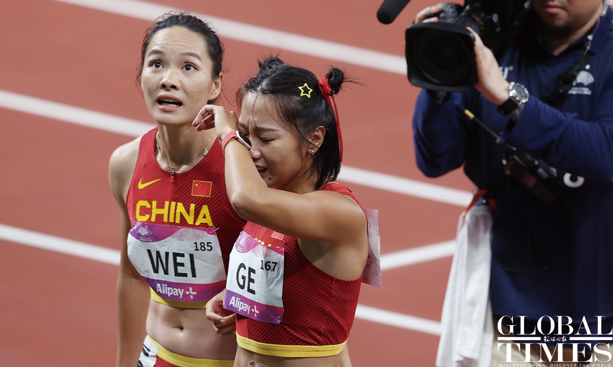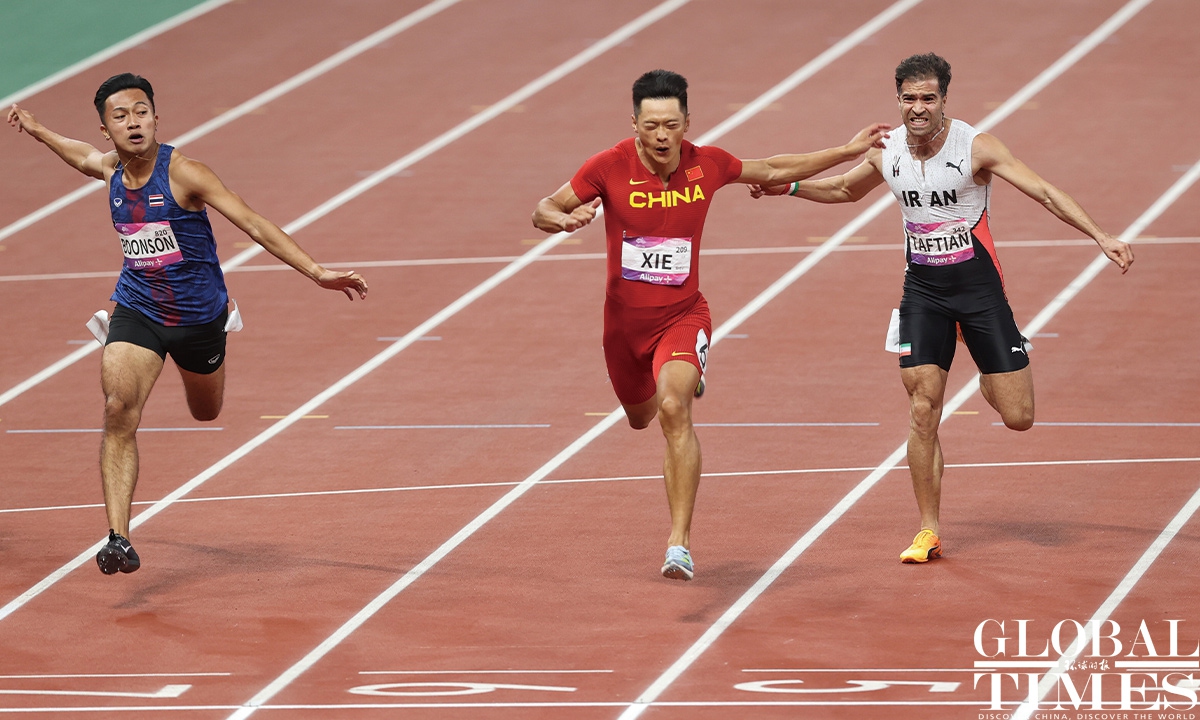 Chinese sprinter Ge Manqi claimed the women's 100m title and Xie Zhenye nailed the men's 100m gold at the 19th Asian Games in Hangzhou, East China's Zhejiang Province, on Sep 30, 2023. Photos: Cui Meng/GT