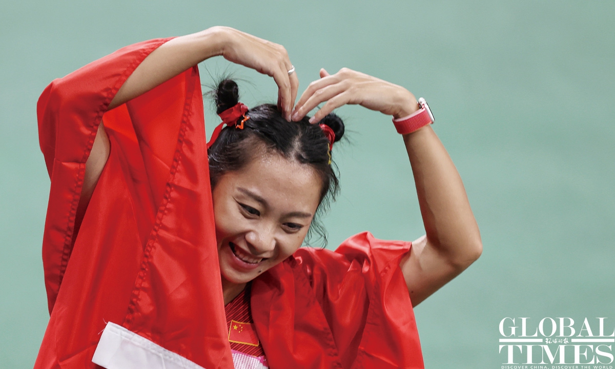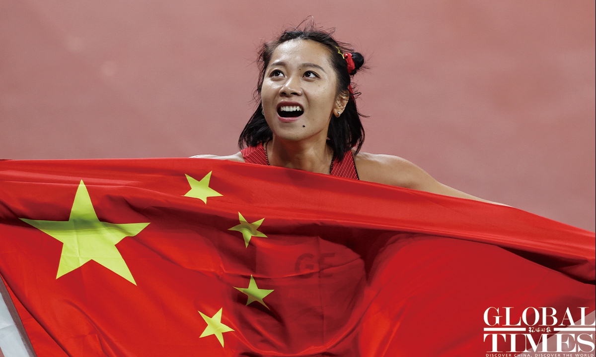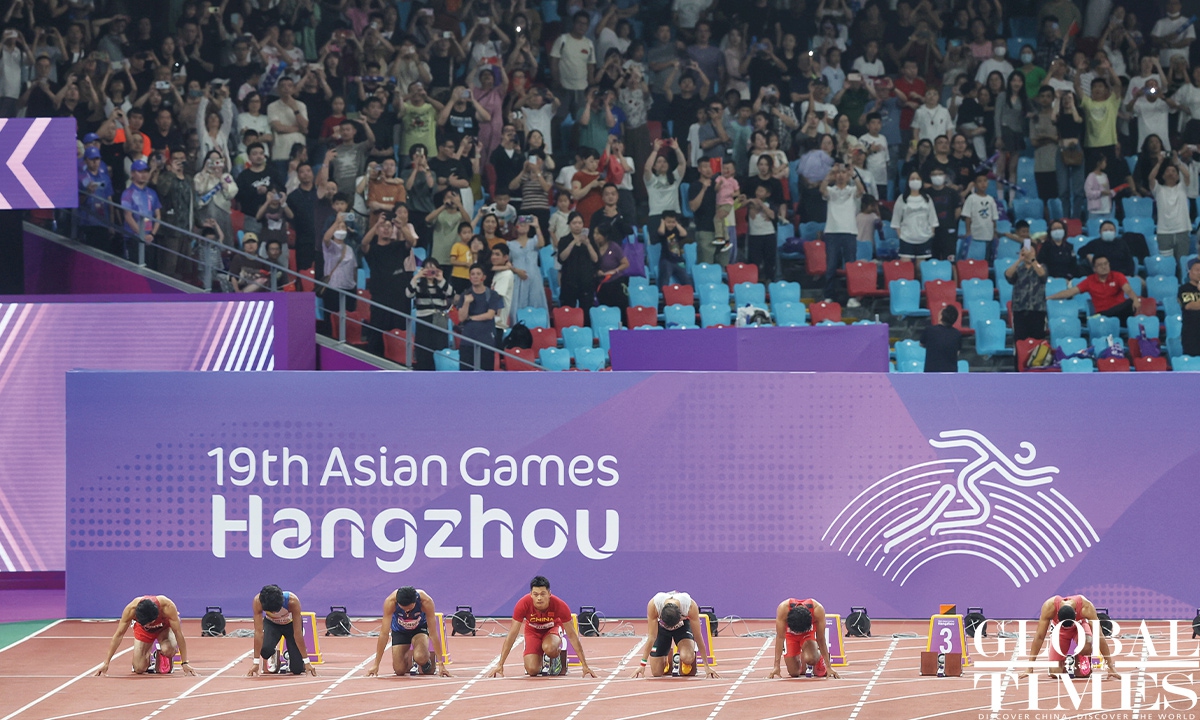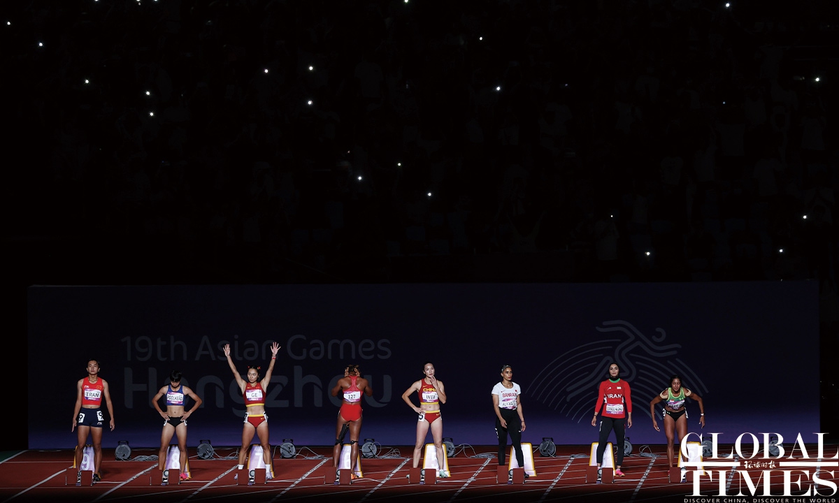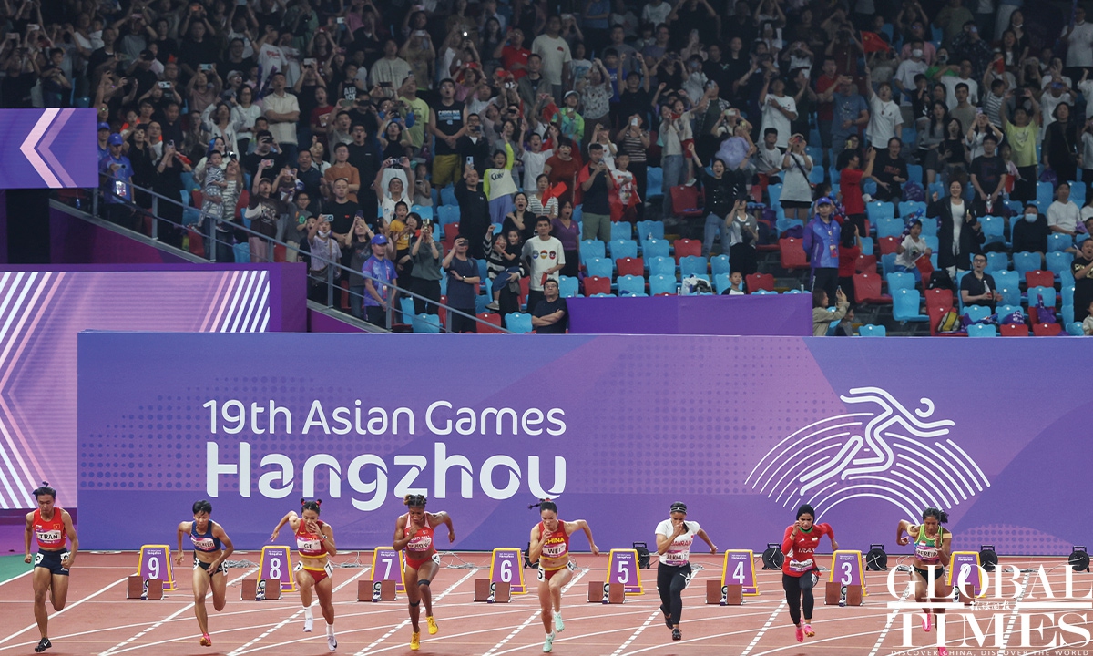 Chinese sprinter Ge Manqi claimed the women's 100m title and Xie Zhenye nailed the men's 100m gold at the 19th Asian Games in Hangzhou, East China's Zhejiang Province, on Sep 30, 2023. Photos: Cui Meng/GT