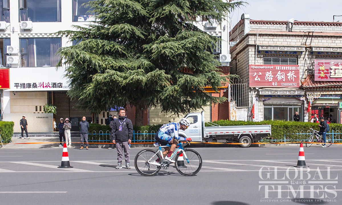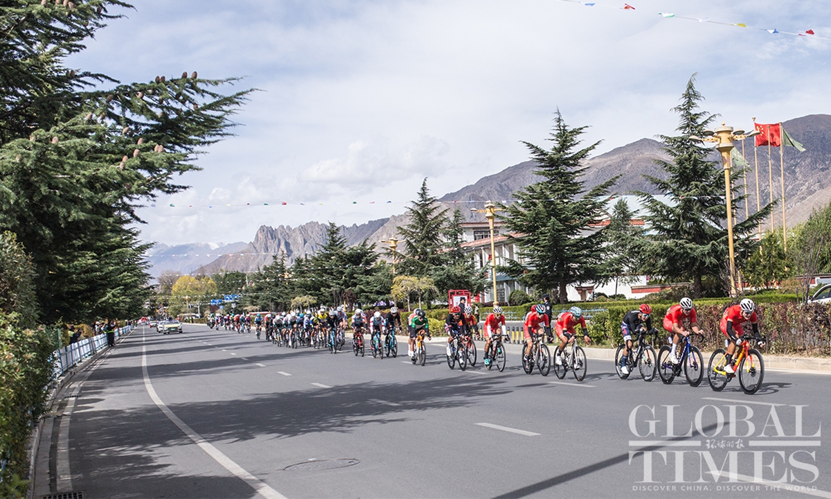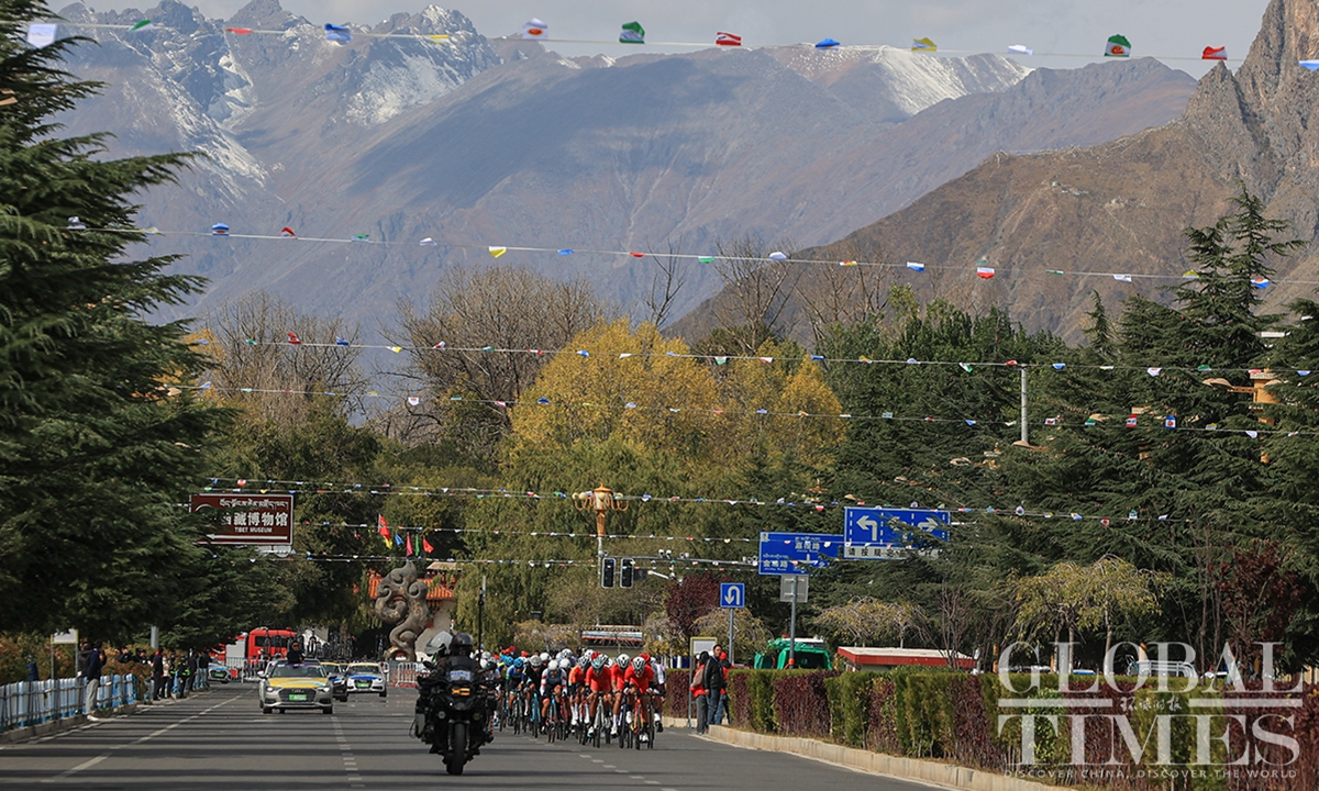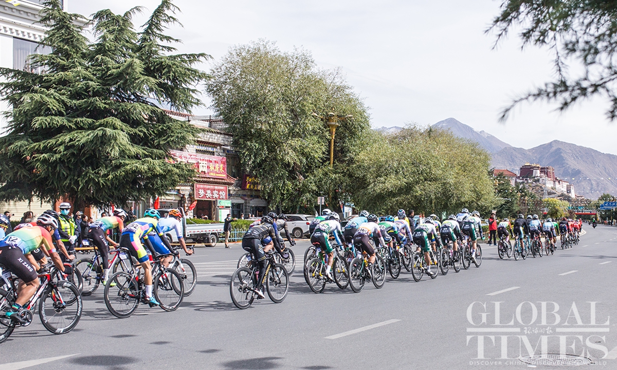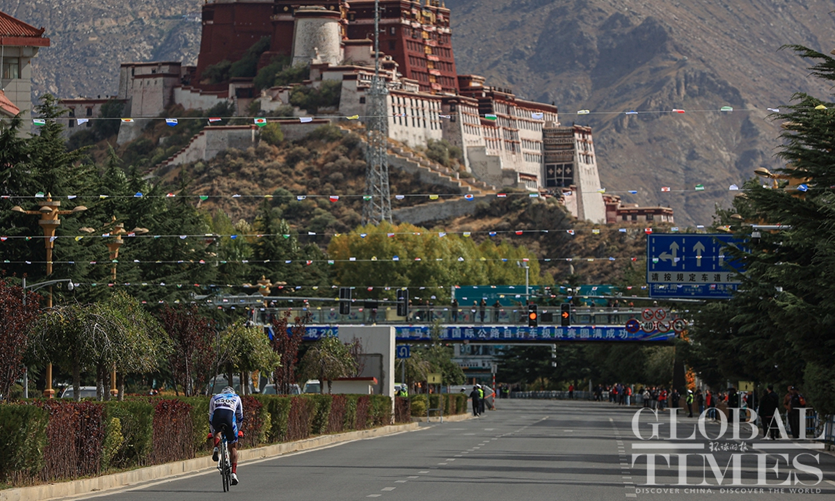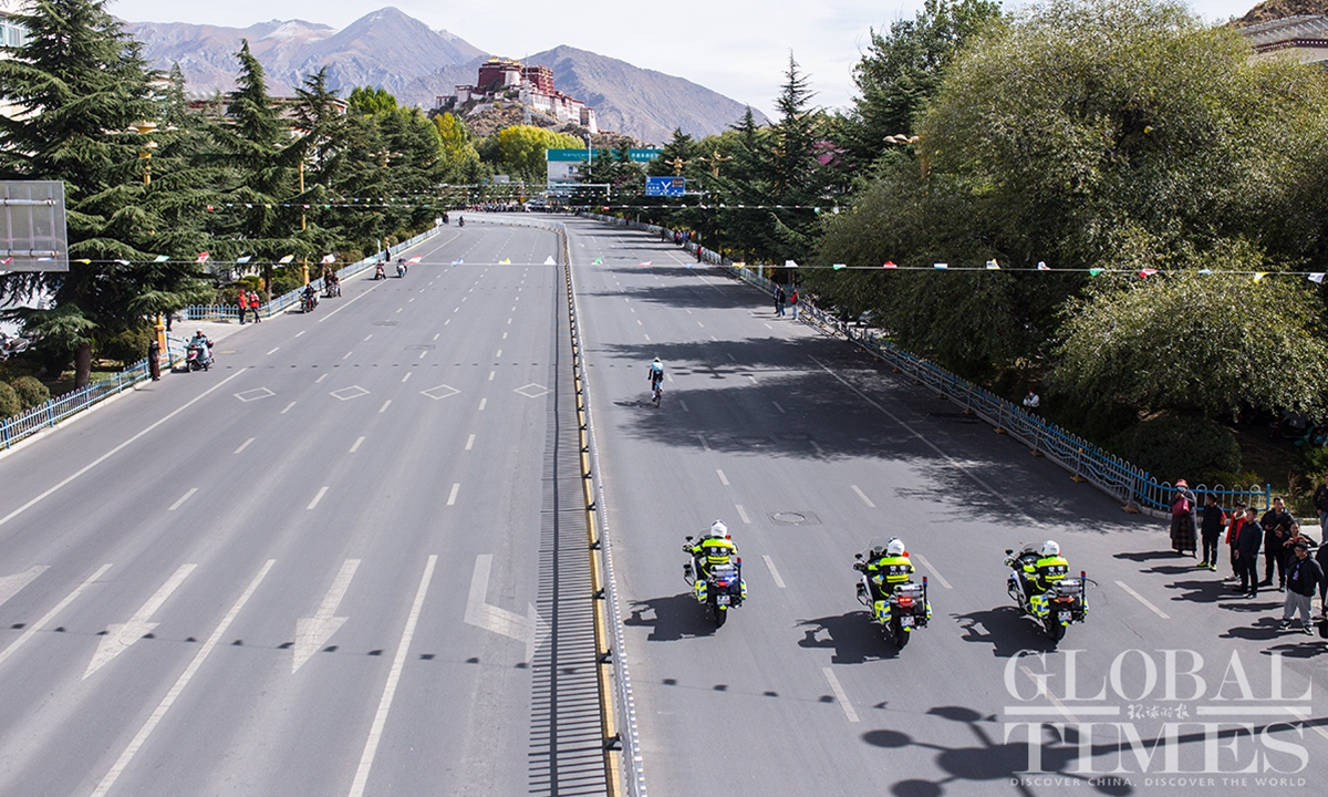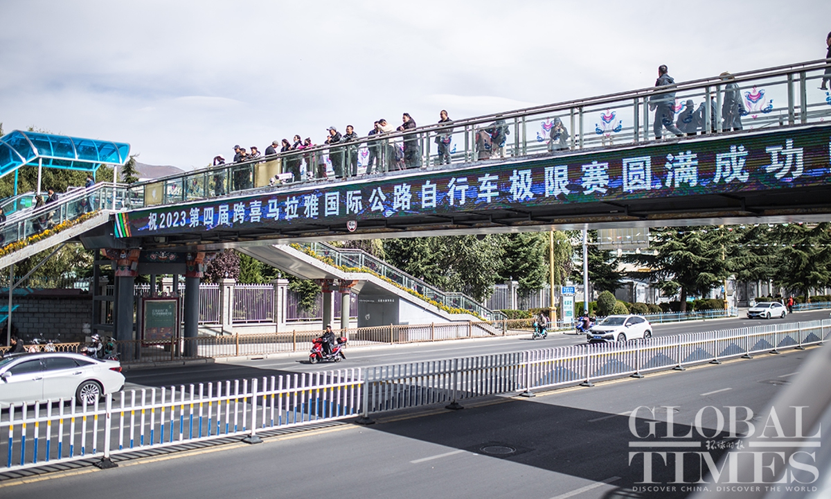 People watch the Fourth Trans-Himalaya International Extreme Cycling Race by the streets of Lhasa, capital city of Southwest China’s Xizang (Tibet) Autonomous Region on October 17, 2023. The competition took place from October 14-17 in Nyingchi, Xigaze, and Lhasa, with a total course distance of approximately 312.57 kilometers and altitude ranging from 2,988 meters to 4,034 meters. More than 100 athletes from 17 teams from both domestic and international locations joined the race.(Photos: Shan Jie and Yang Ruoyu/GT)
