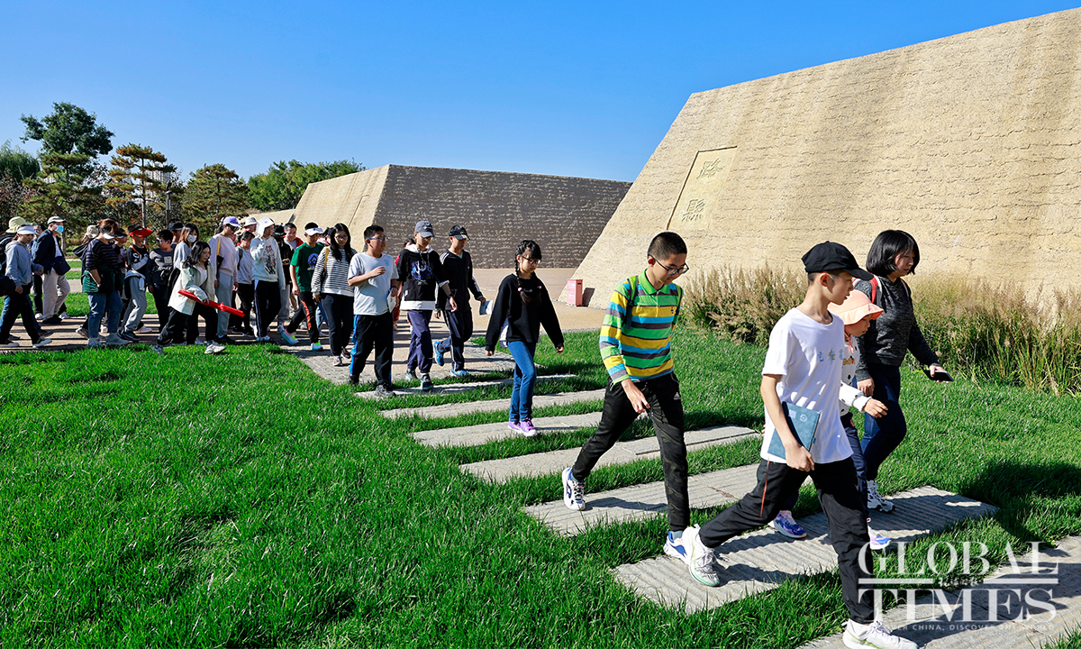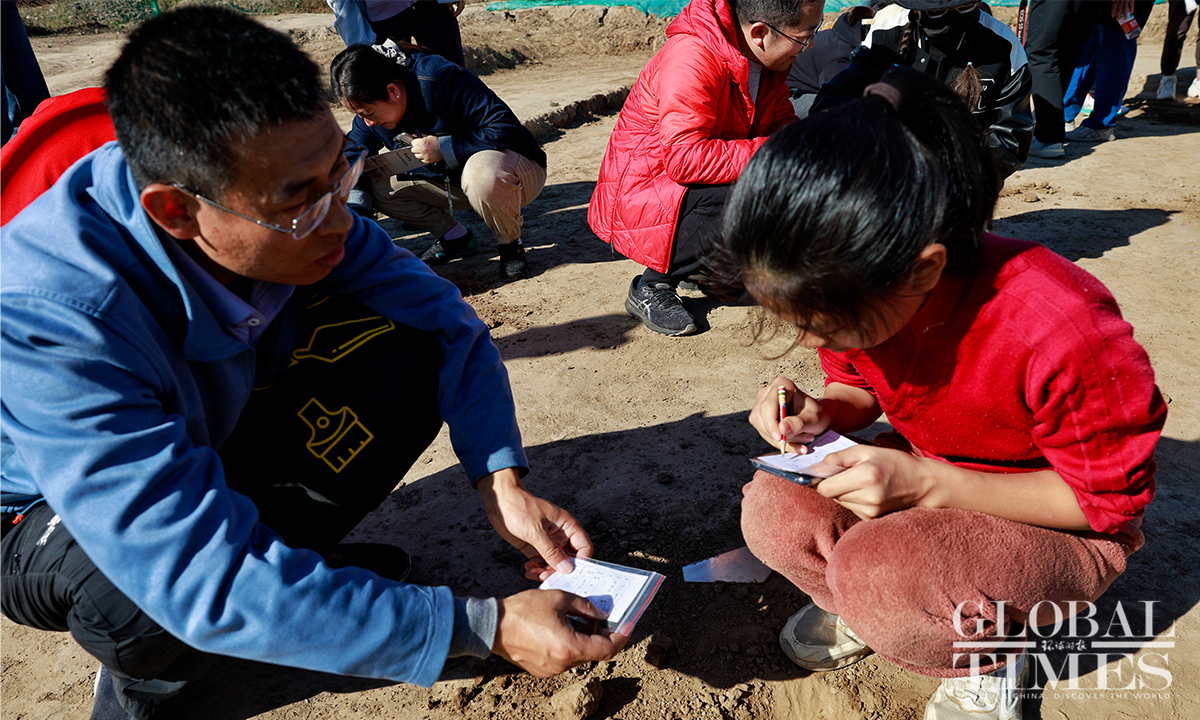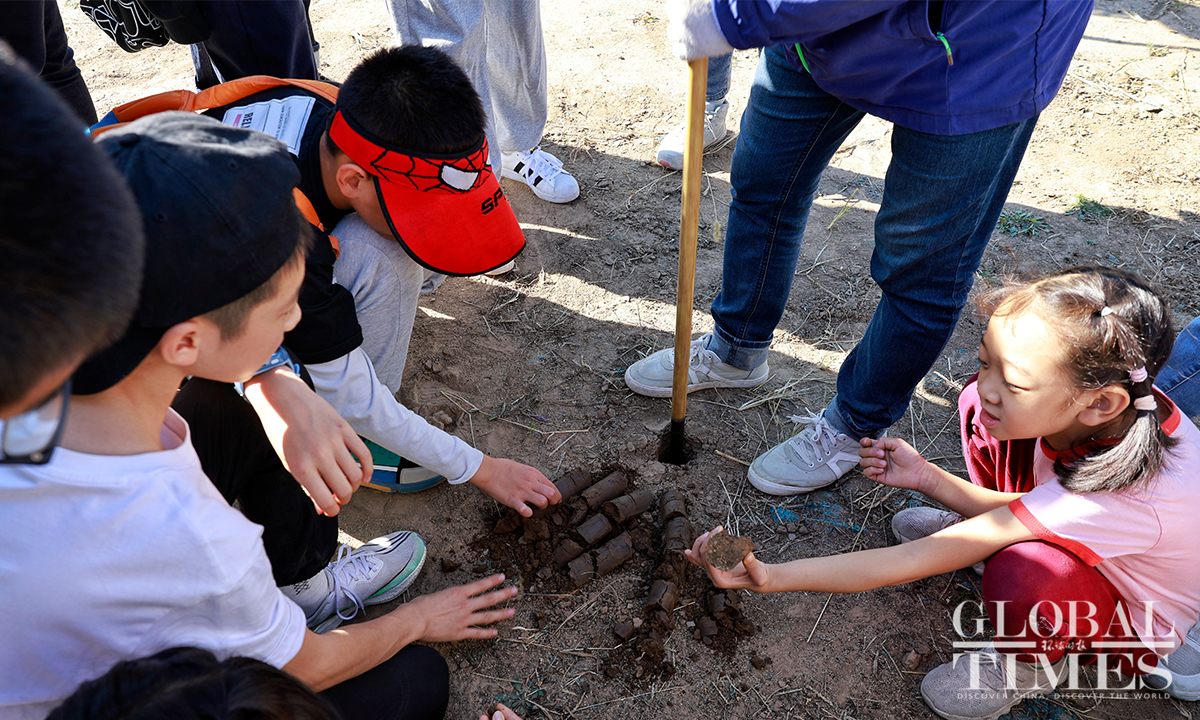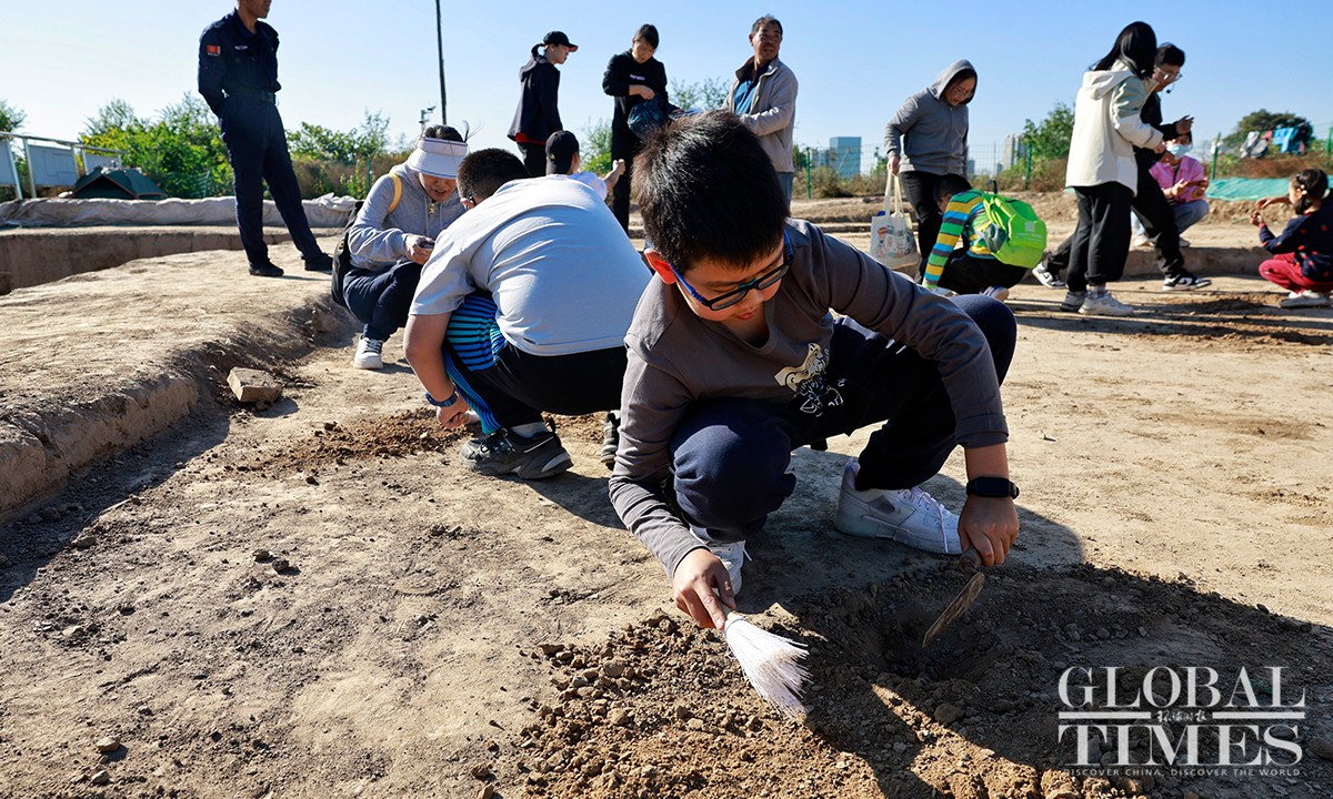 A family archaeology study tour is held at the ruins of ancient city of Luxian in Tongzhou District, Beijing, on October 21, 2023. The excavation of the ancient city began in 2016. Families can visit the excavation site and experience archaeological work under the guidance of professional staff. A bronze coin rubbing activity is also held, allowing visitors to "bring home" artifacts through rubbings. (Photos: Li Hao/GT)