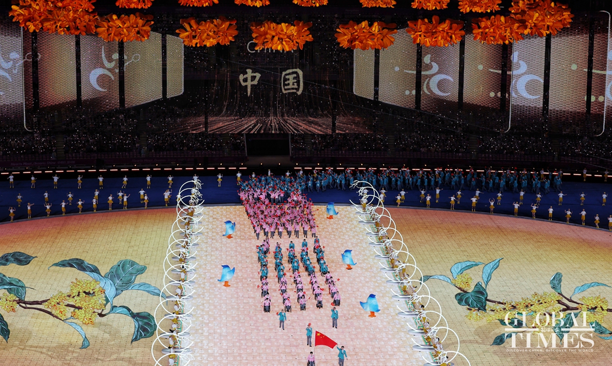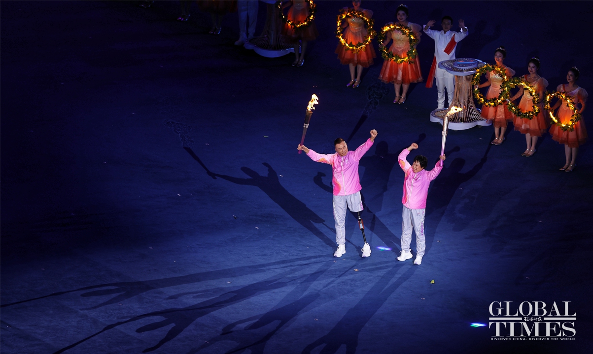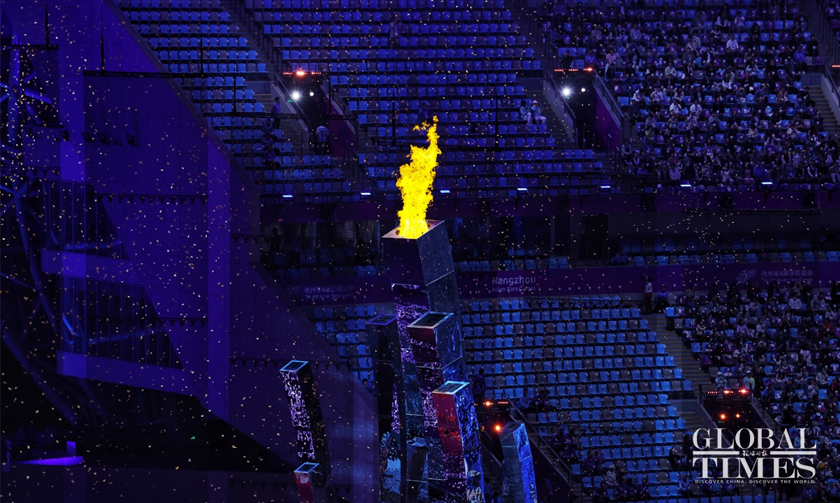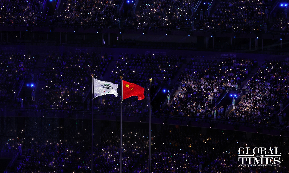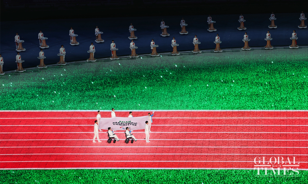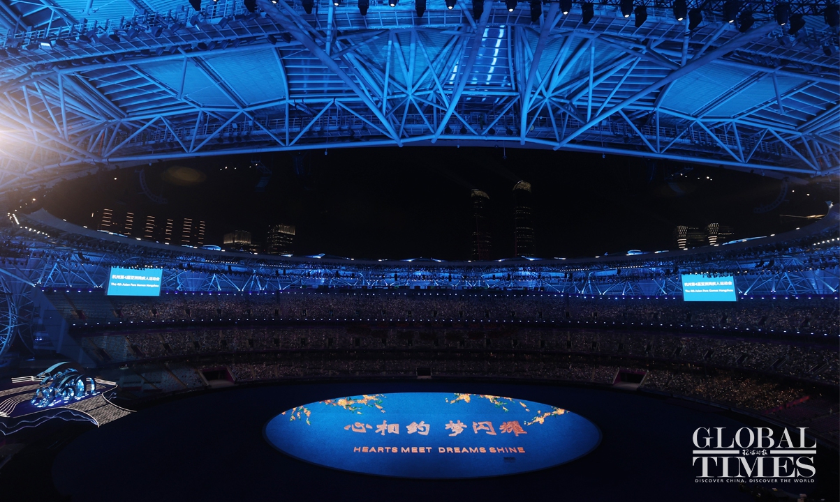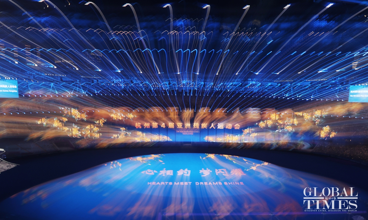 The opening ceremony of the Hangzhou Asian Para Games kicked off on the evening of October 22, 2023, at the main stadium of the Hangzhou Olympic Sports Center in Hangzhou, East China's Zhejiang Province. Themed "Hearts Meet, Dreams Shine," the Para Games' opening ceremony continues to showcase China's cultural confidence with digital technology, demonstrating the spirit of "optimism, harmony, perseverance, and sharing." Photos: Cui Meng/GT