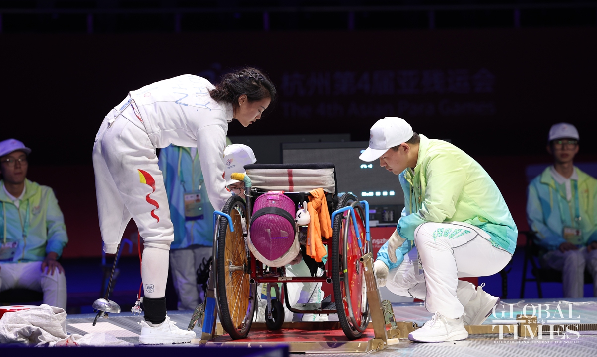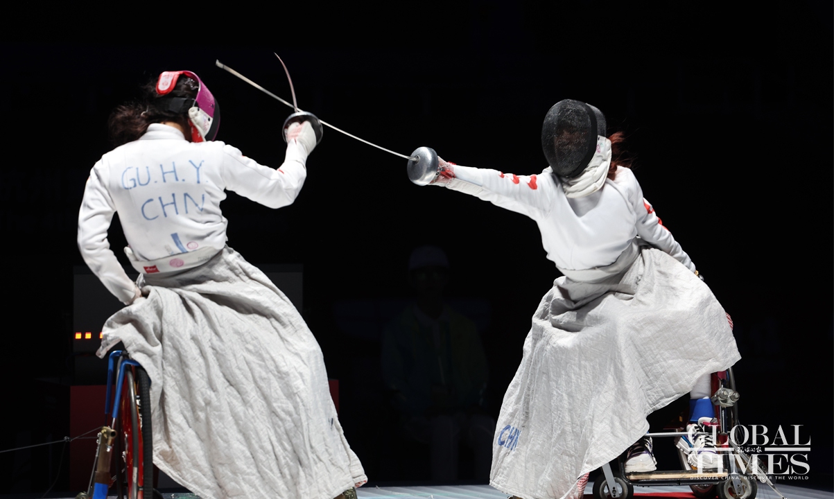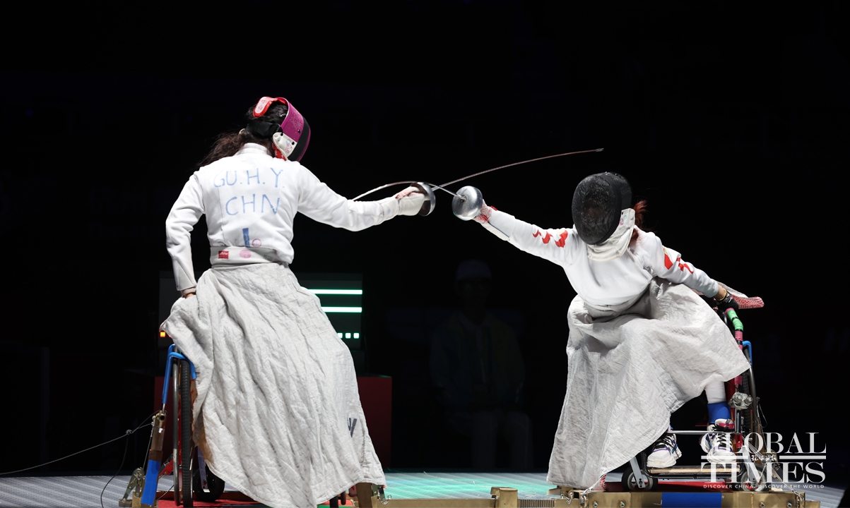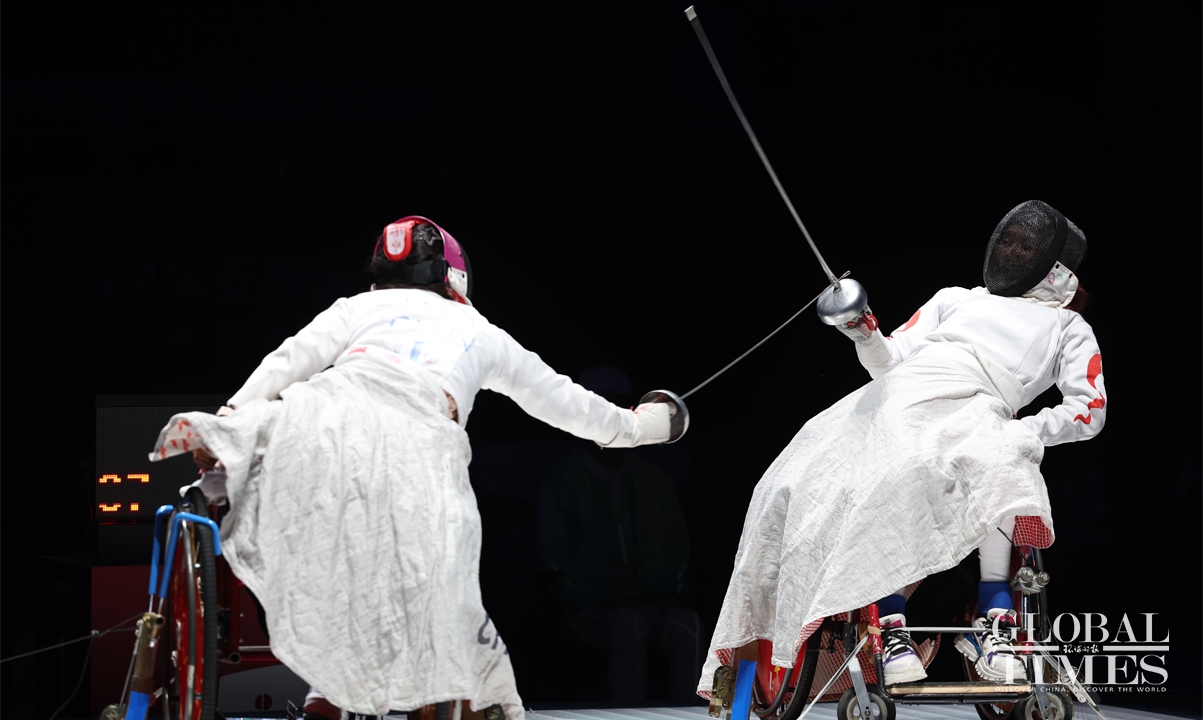 Chinese athlete Chen Yuandong (right) won the gold medal in the women's sabre A-level wheelchair fencing event at the 4th Asian Para Games in Hangzhou on October 25, defeating her opponent Gu Haiyan to become the champion.