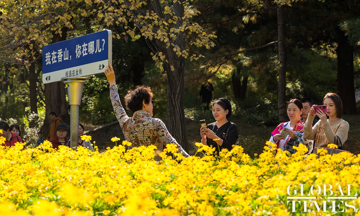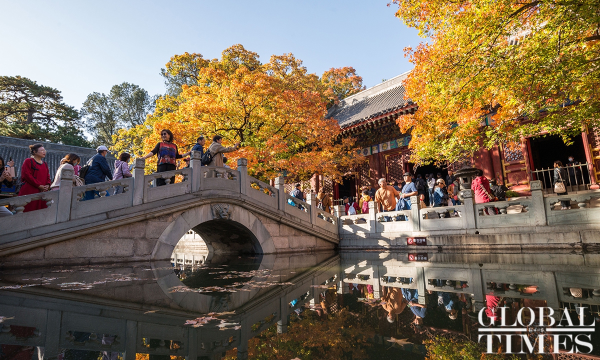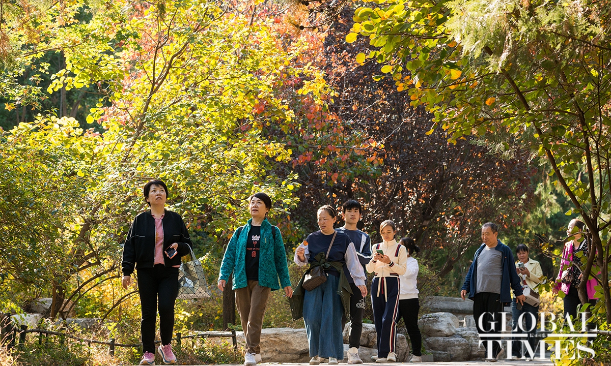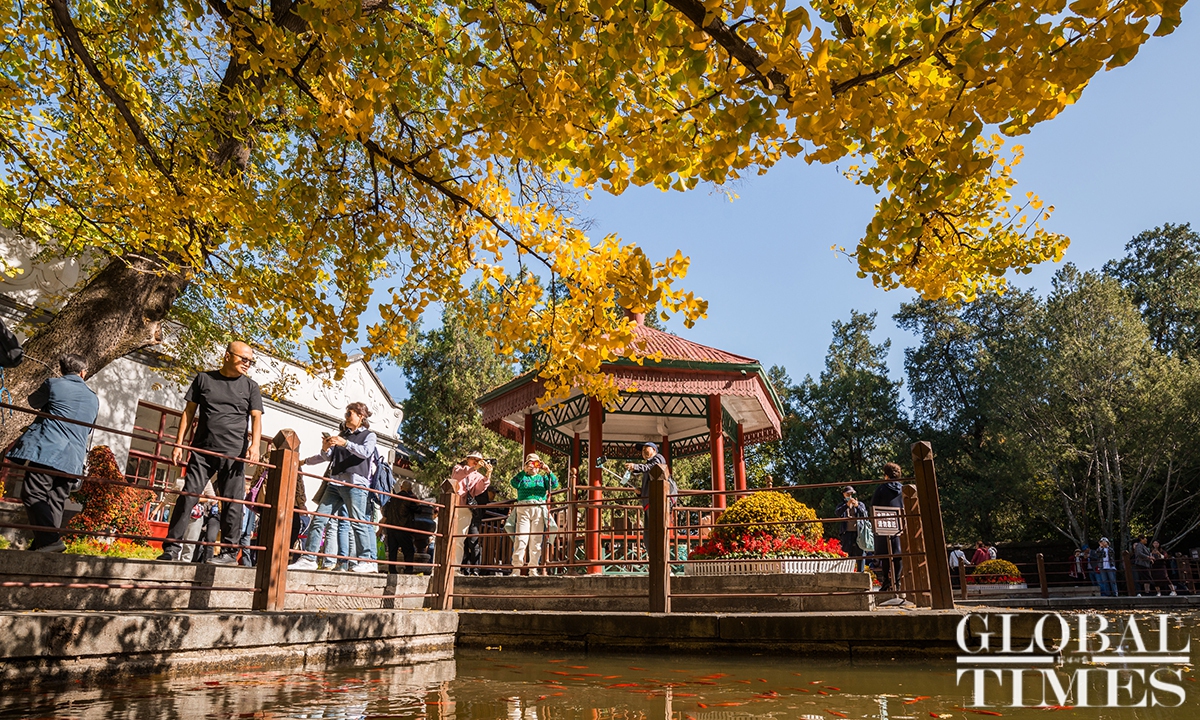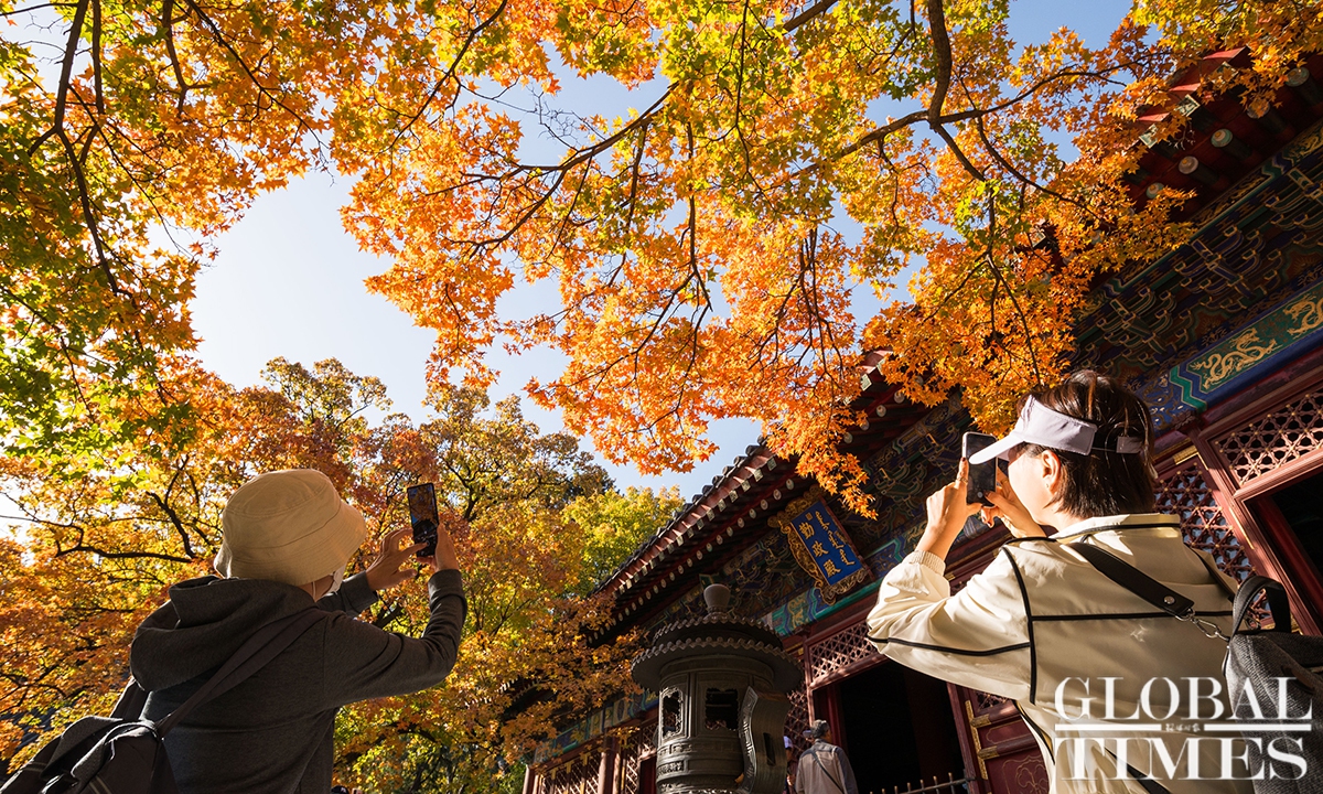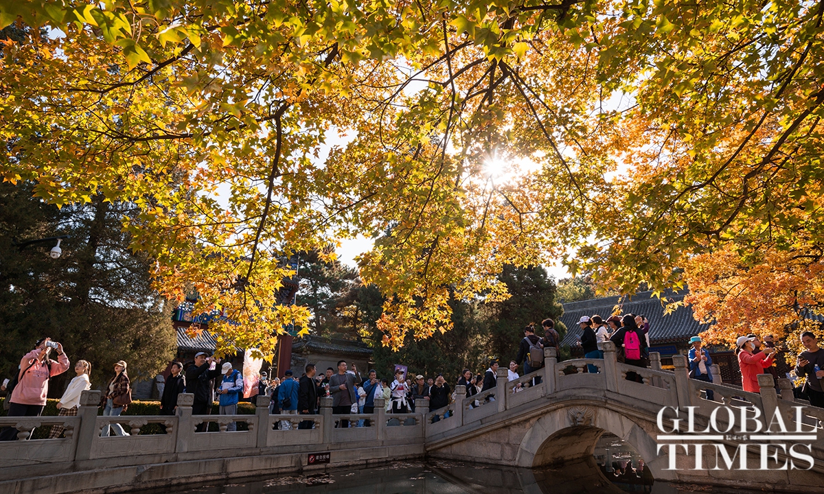 With the drop in temperature as autumn deepens in Beijing, parks around the city are filled with people coming to see the season's spectacle - a fall foliage show as the trees turn from crisp green to vibrant colors such as gold and deep red. Photos: Chen Tao/GT