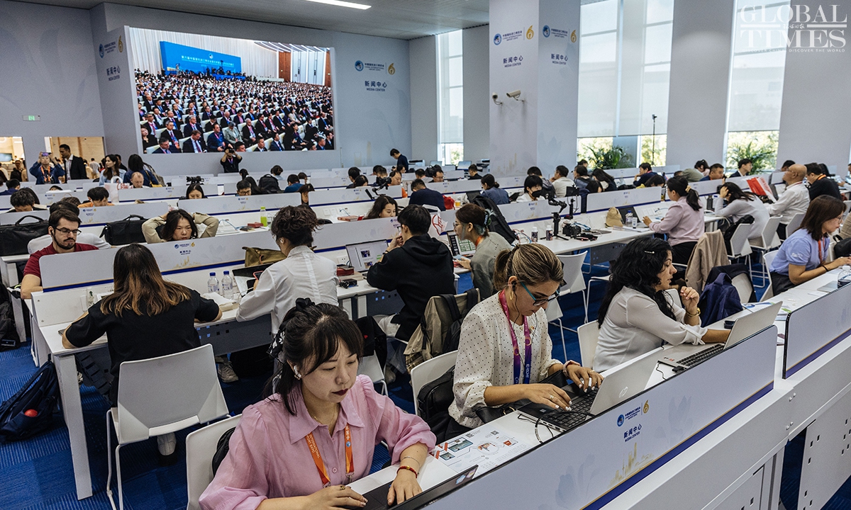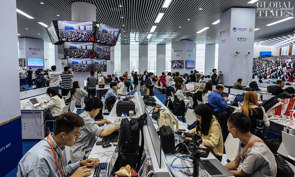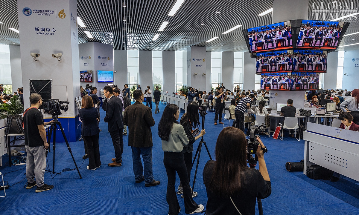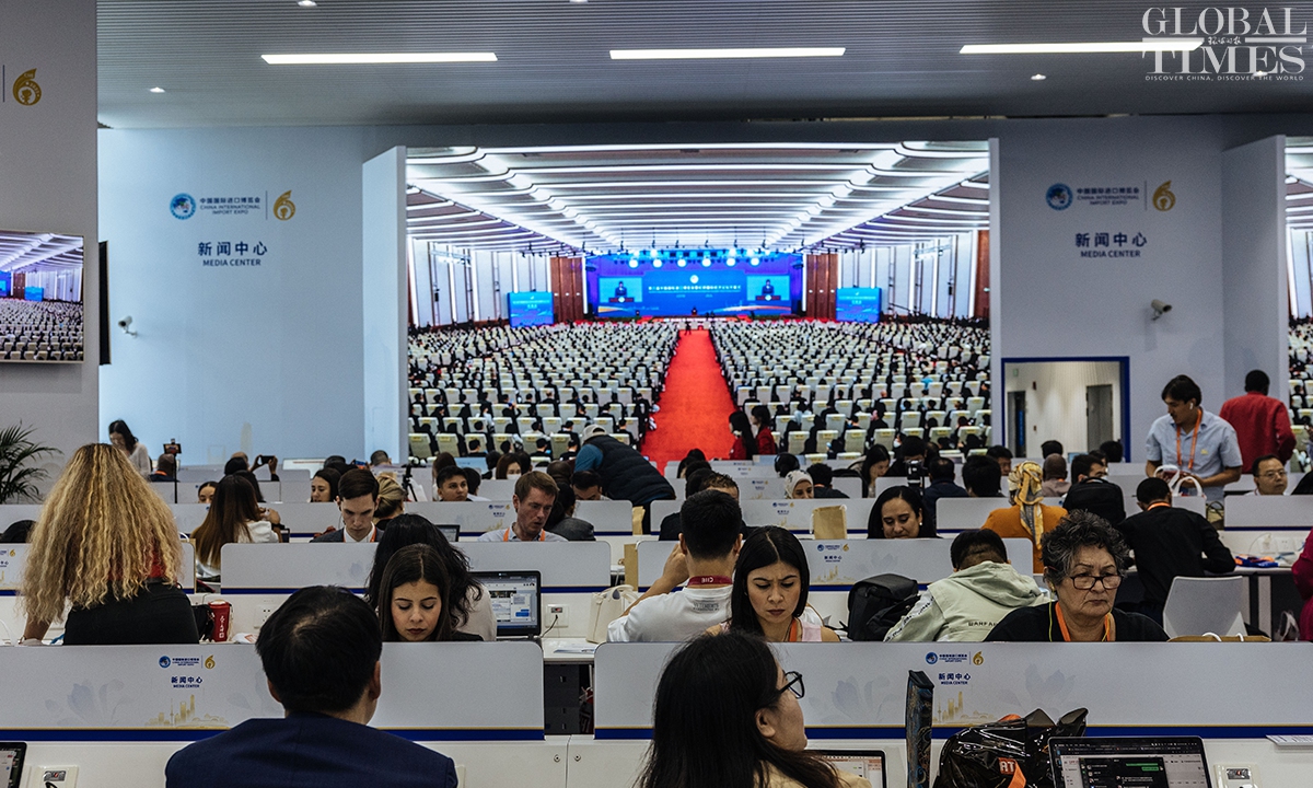 The 6th China International Import Expo(CIIE) will be held from November 5 to 10 at the National Exhibition and Convention Center (Shanghai). Journalists from home and abroad gathered at the media center to report the opening ceremony on Sunday. During the CIIE, the center will provide journalists with multilingual information services, host themed press conferences, and organize various other activities. (Photos: Li Hao/GT)