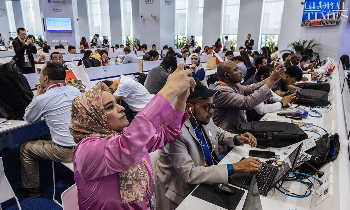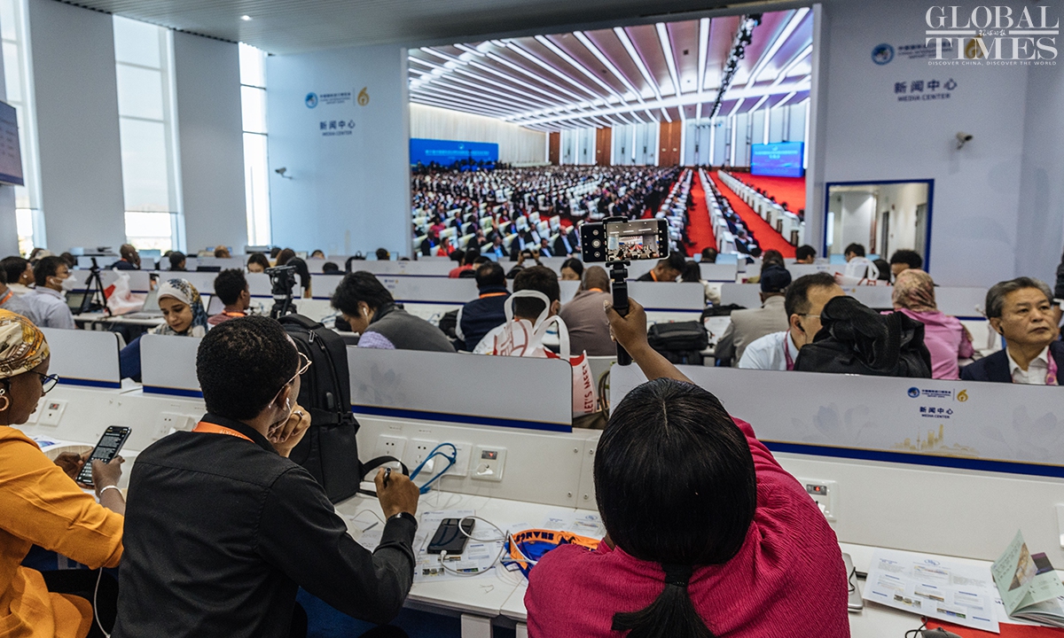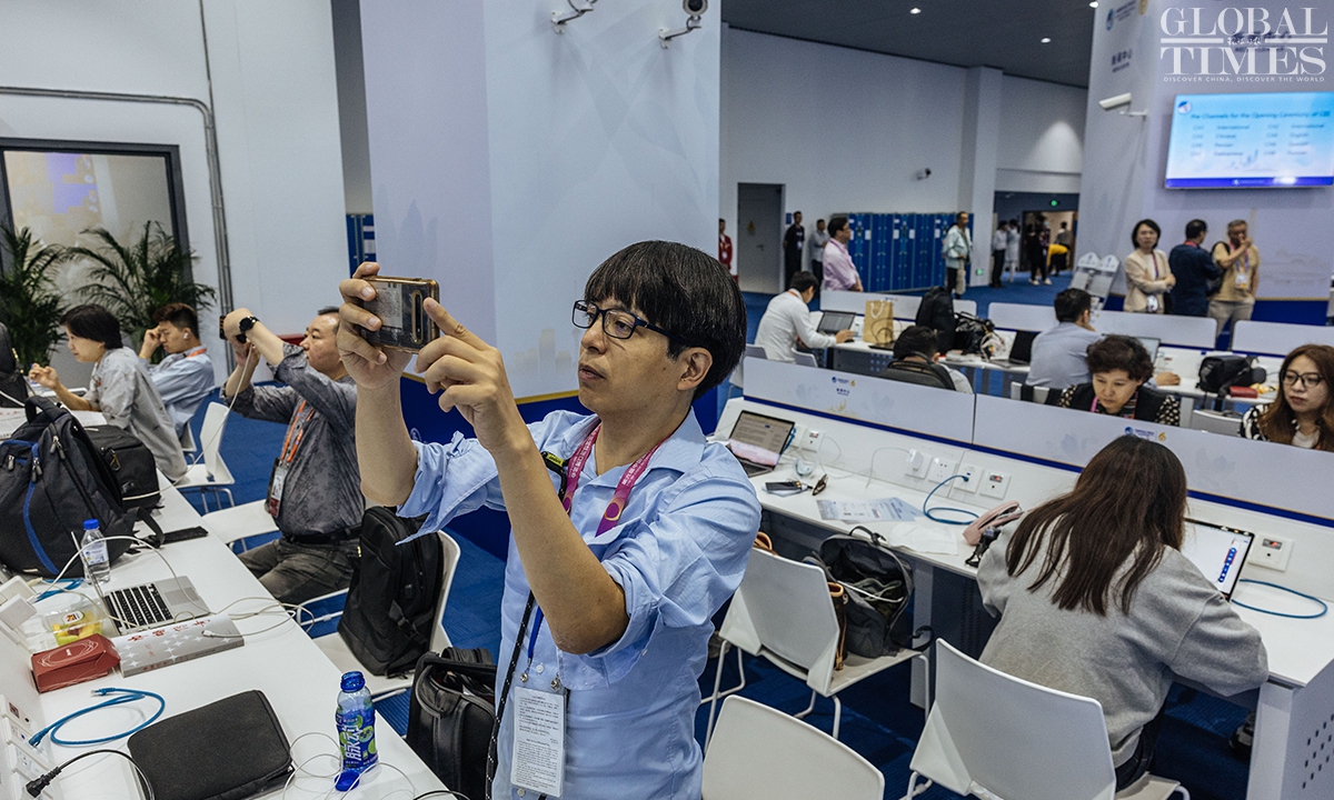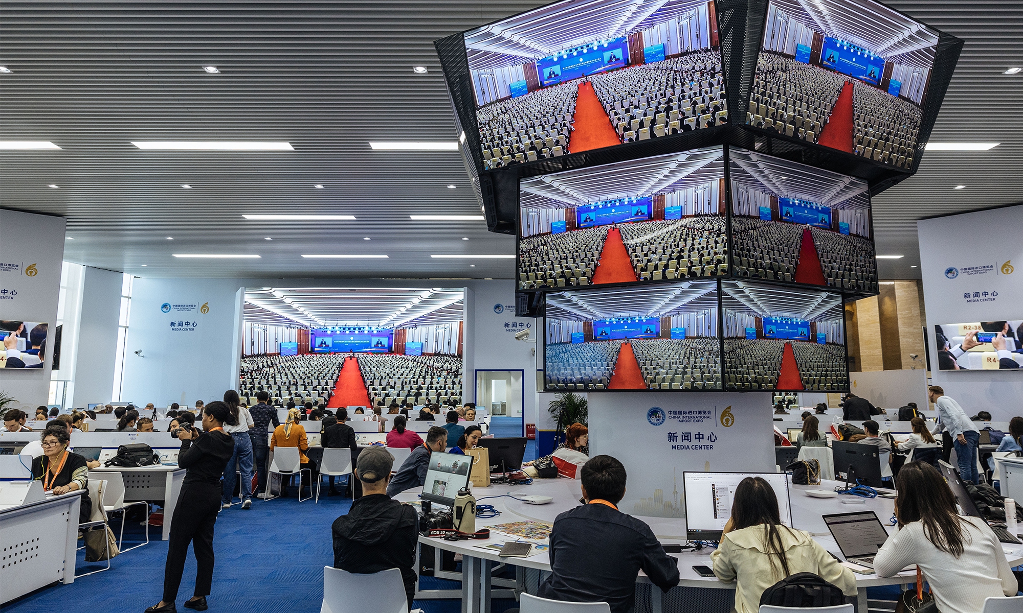 The 6th China International Import Expo(CIIE) will be held from November 5 to 10 at the National Exhibition and Convention Center (Shanghai). Journalists from home and abroad gathered at the media center to report the opening ceremony on Sunday. During the CIIE, the center will provide journalists with multilingual information services, host themed press conferences, and organize various other activities. (Photos: Li Hao/GT)