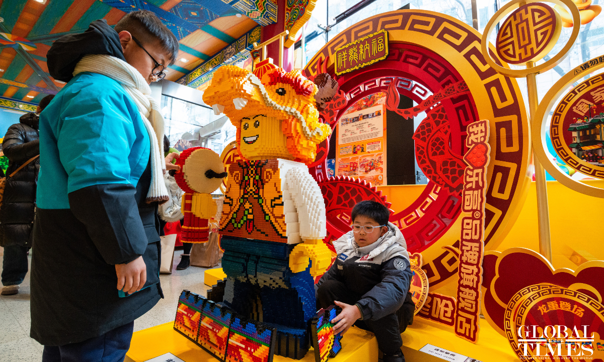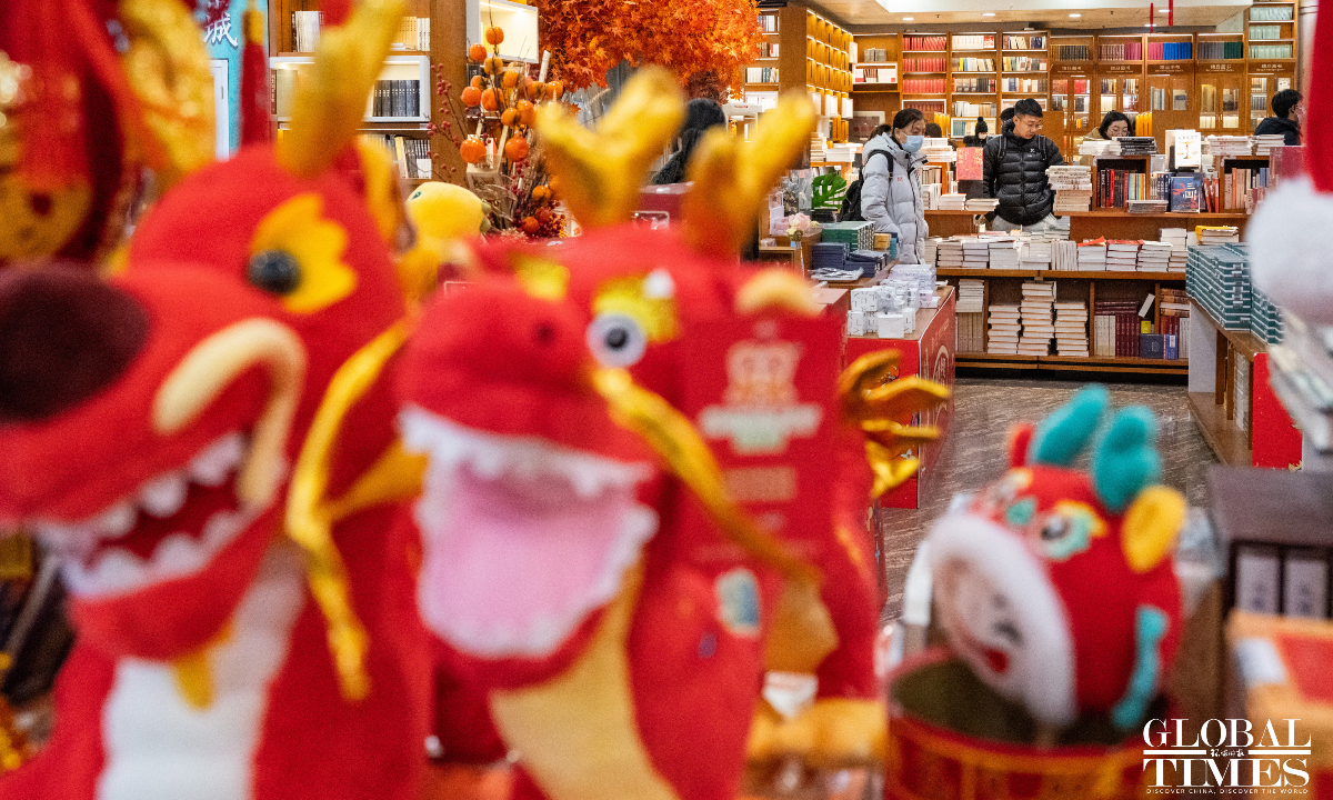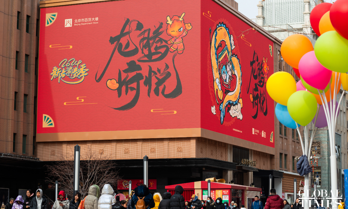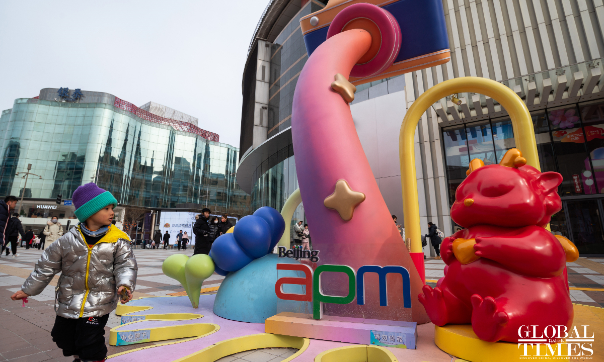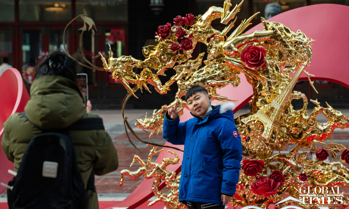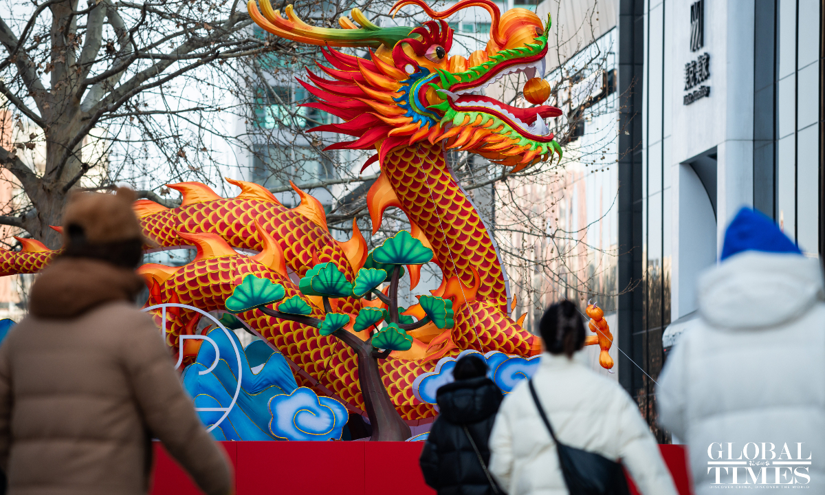 As the Spring Festival approaches, the streets and alleys of Beijing are becoming more festive. "Dragon" lanterns and dragon-themed art installations are being set up at the gates of landmark buildings and commercial centers. A GT reporter has observed that clothes, ornaments and toys adorned with "Chinese dragon" are highly sought after by the public. (Photos: Chen Tao/GT)