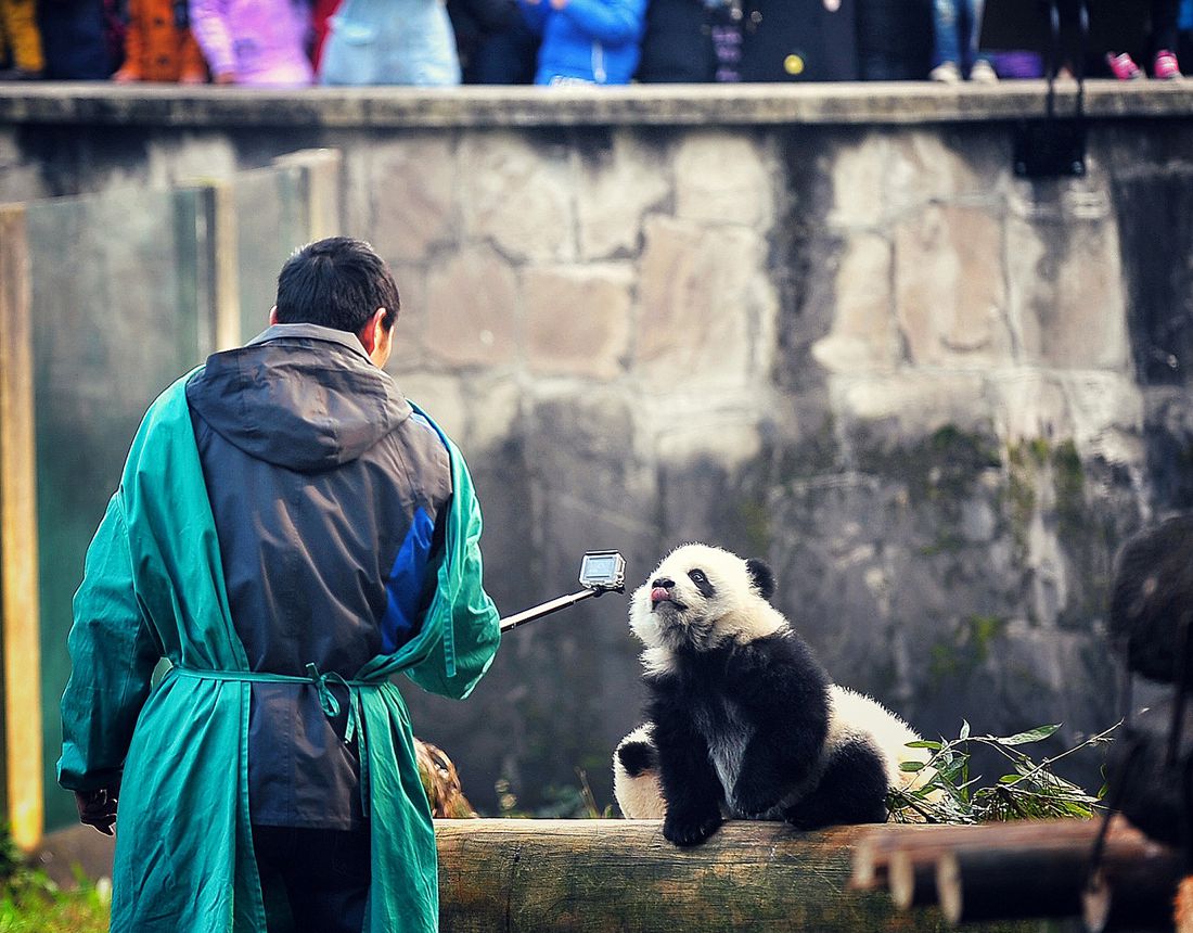 A zookeeper takes video of the 6-month-old panda twins at Southwest China’s Chongqing Zoo on January 22, 2017. Photo: CFP figcaption >