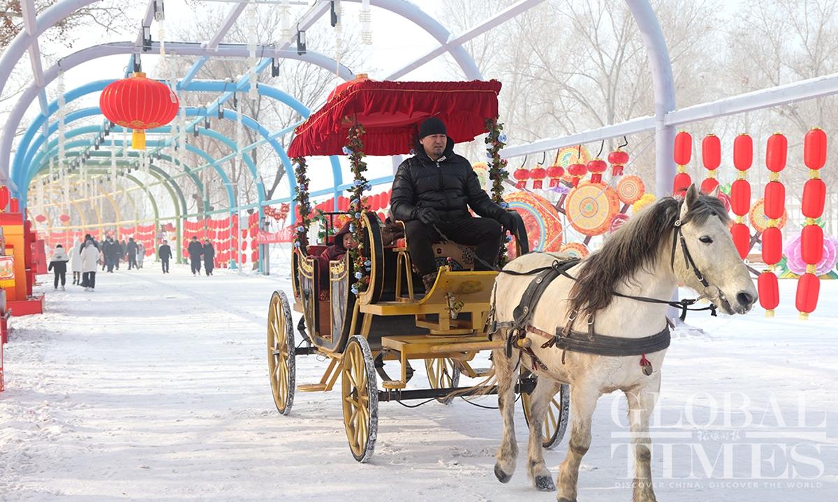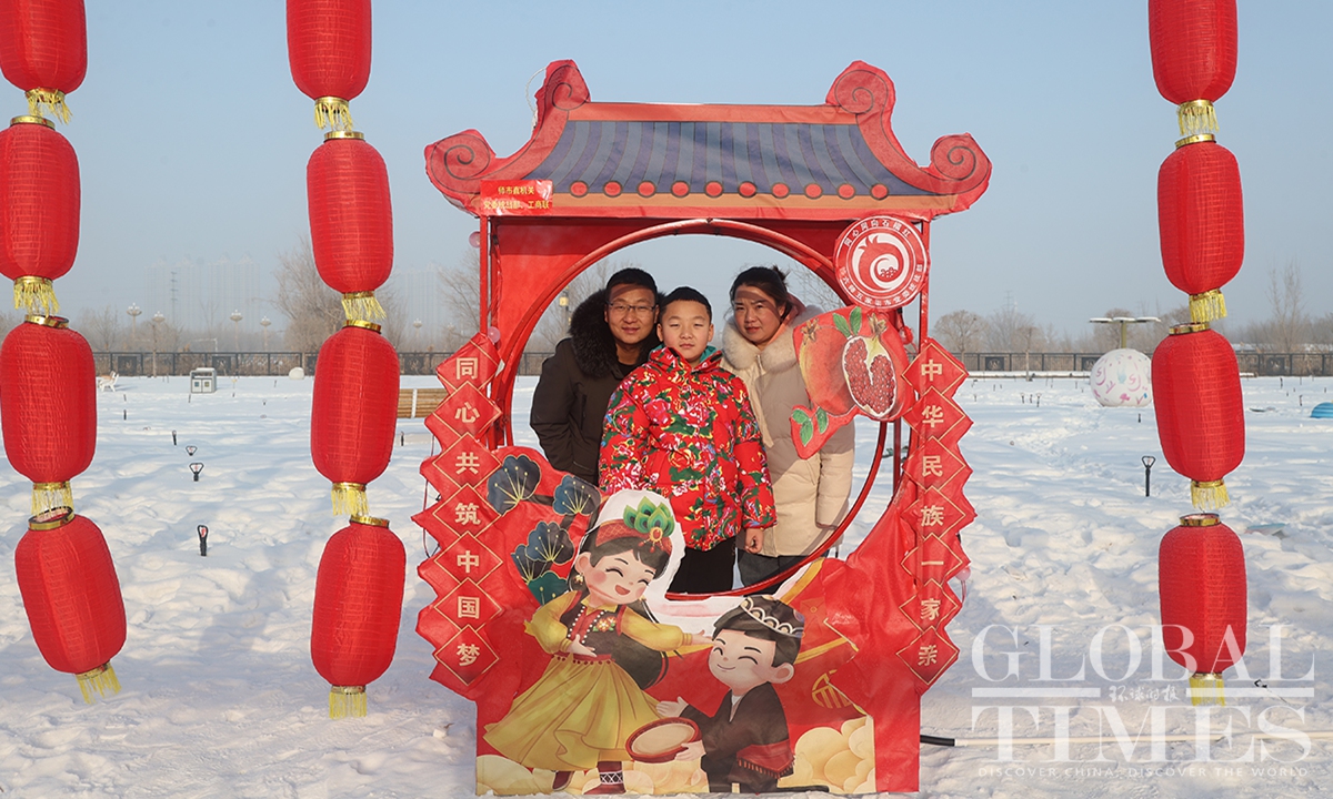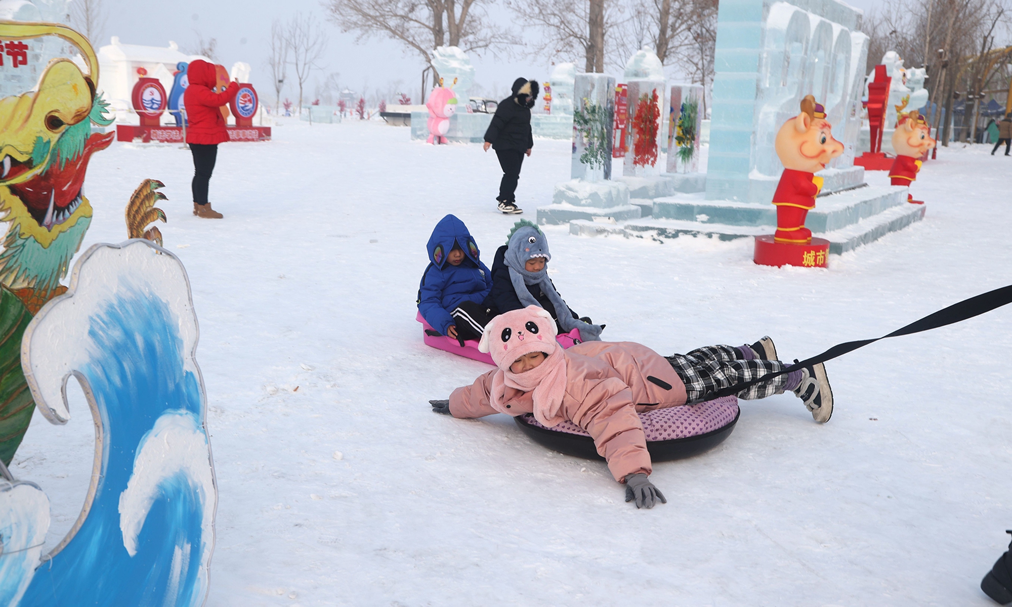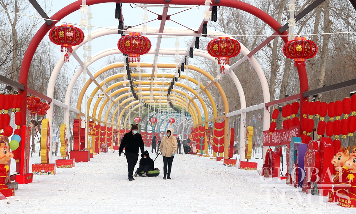 Citizens and tourists gather to celebrate the Spring Festival at Qinggeda Lake scenic spot in Wujiaqu, Northwest China's Xinjiang Uygur Autonomous Region. Expertly crafted ice and snow sculptures captivate visitors. Amidst laughter and cheer, guests enjoy various winter activities including snow tubing, ice bumper cars, and snowfield gyroscopes, immersing themselves in the magic of the season. The event featuring ice and snow also hosts engaging sports competitions and interactive events, blending folk traditions with sports. (Photo: Courtesy of Chen Peng)