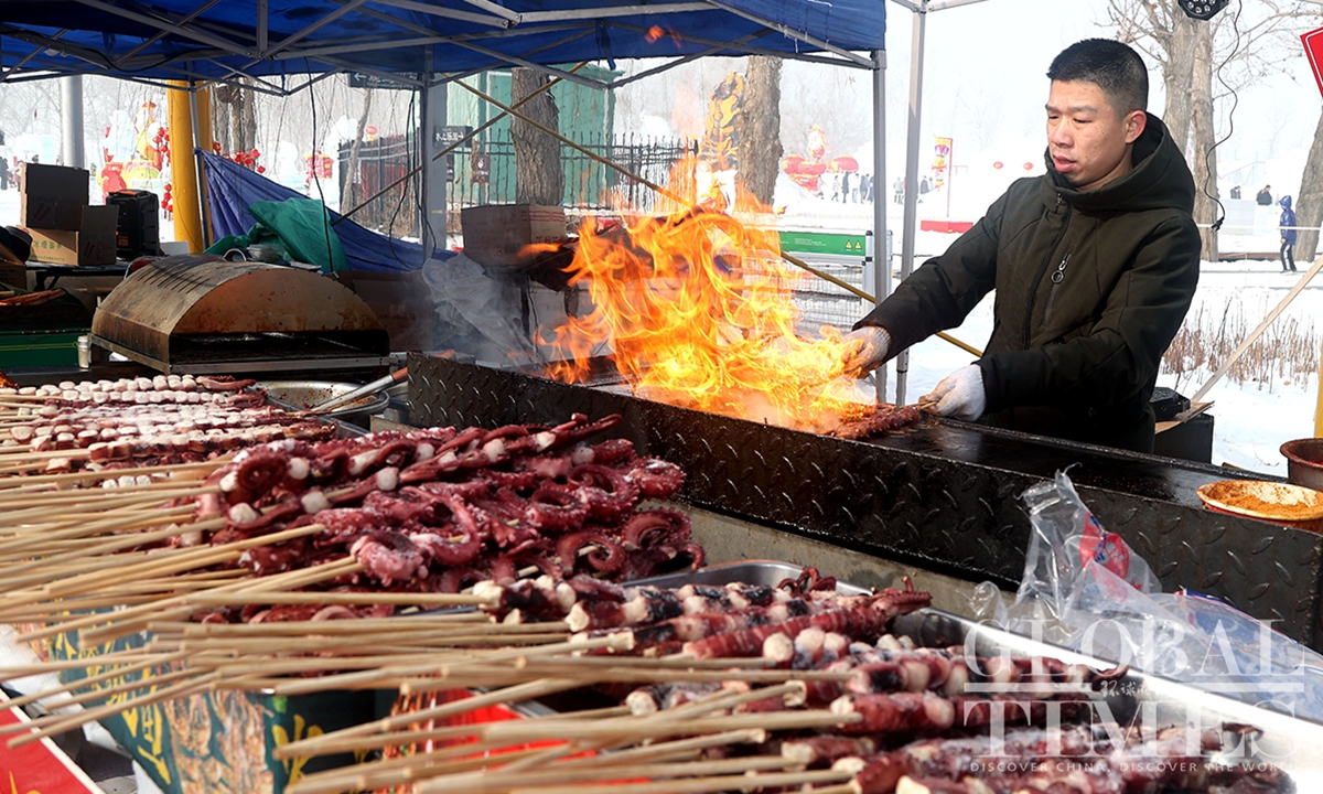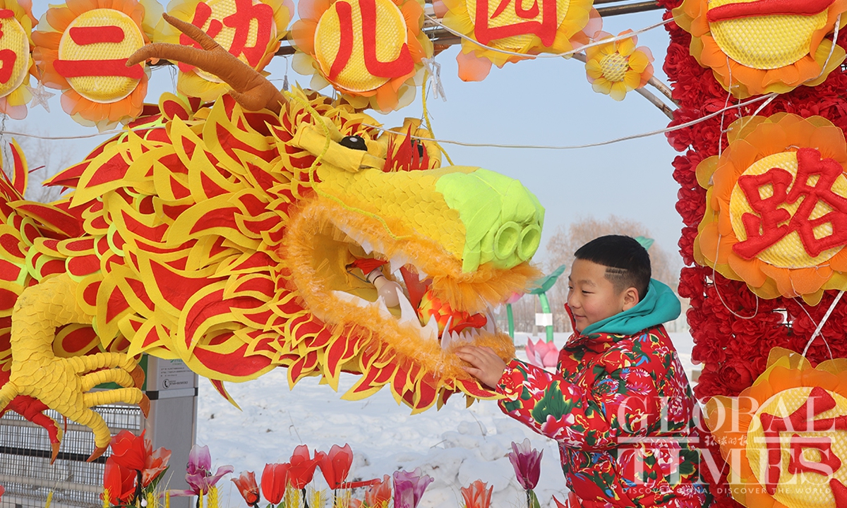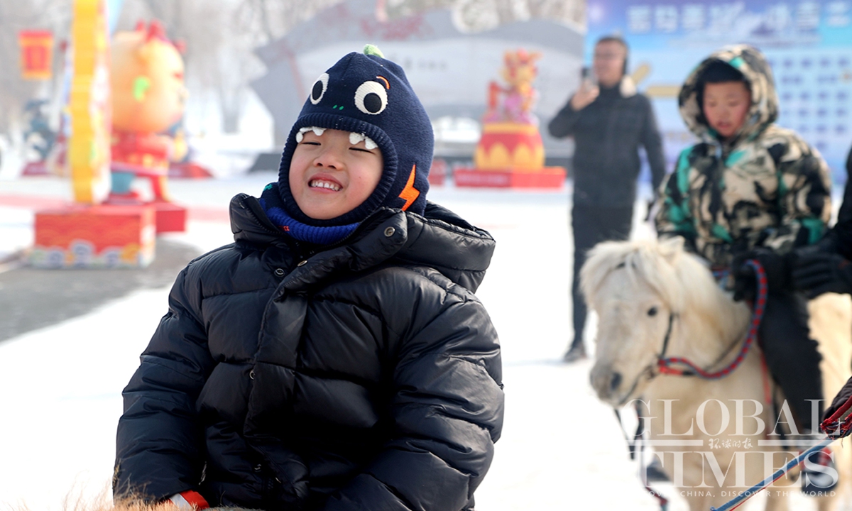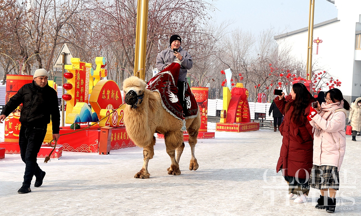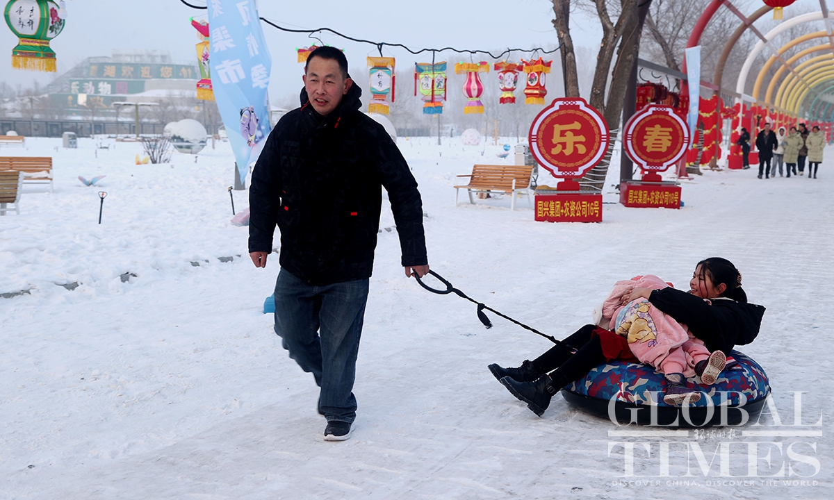 Citizens and tourists gather to celebrate the Spring Festival at Qinggeda Lake scenic spot in Wujiaqu, Northwest China's Xinjiang Uygur Autonomous Region. Expertly crafted ice and snow sculptures captivate visitors. Amidst laughter and cheer, guests enjoy various winter activities including snow tubing, ice bumper cars, and snowfield gyroscopes, immersing themselves in the magic of the season. The event featuring ice and snow also hosts engaging sports competitions and interactive events, blending folk traditions with sports. (Photo: Courtesy of Chen Peng)