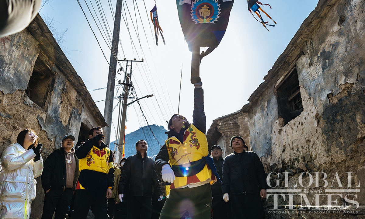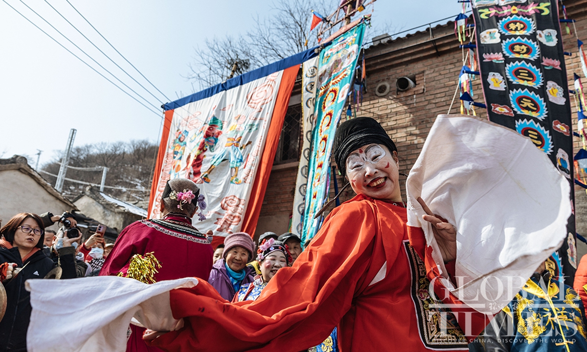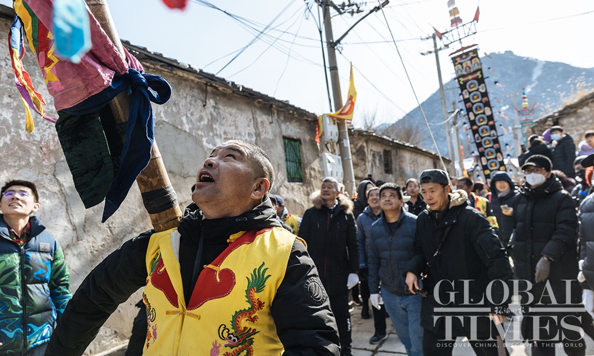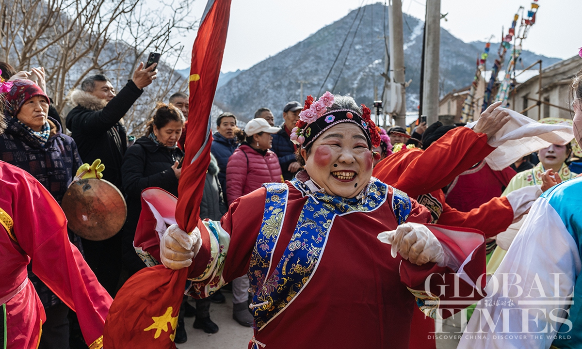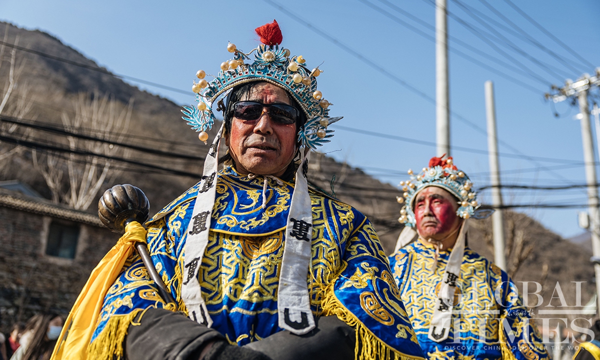 In 2023, Mentougou District suffered severe flooding, which washed away many of the festival's hardware facilities. After reconstruction efforts by the village committee, this year's festival resumed as scheduled. On the afternoon of the Lantern Festival, flags flew high, festive music filled the air, and elderly artists joined villagers in celebrating the joyous occasion. (Photo: Li Hao/GT)