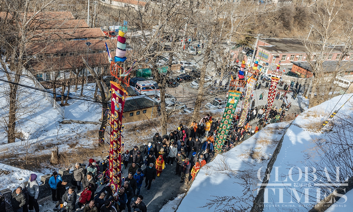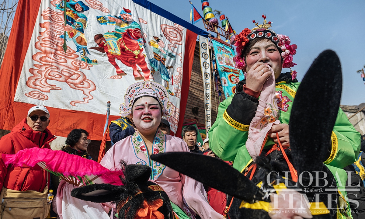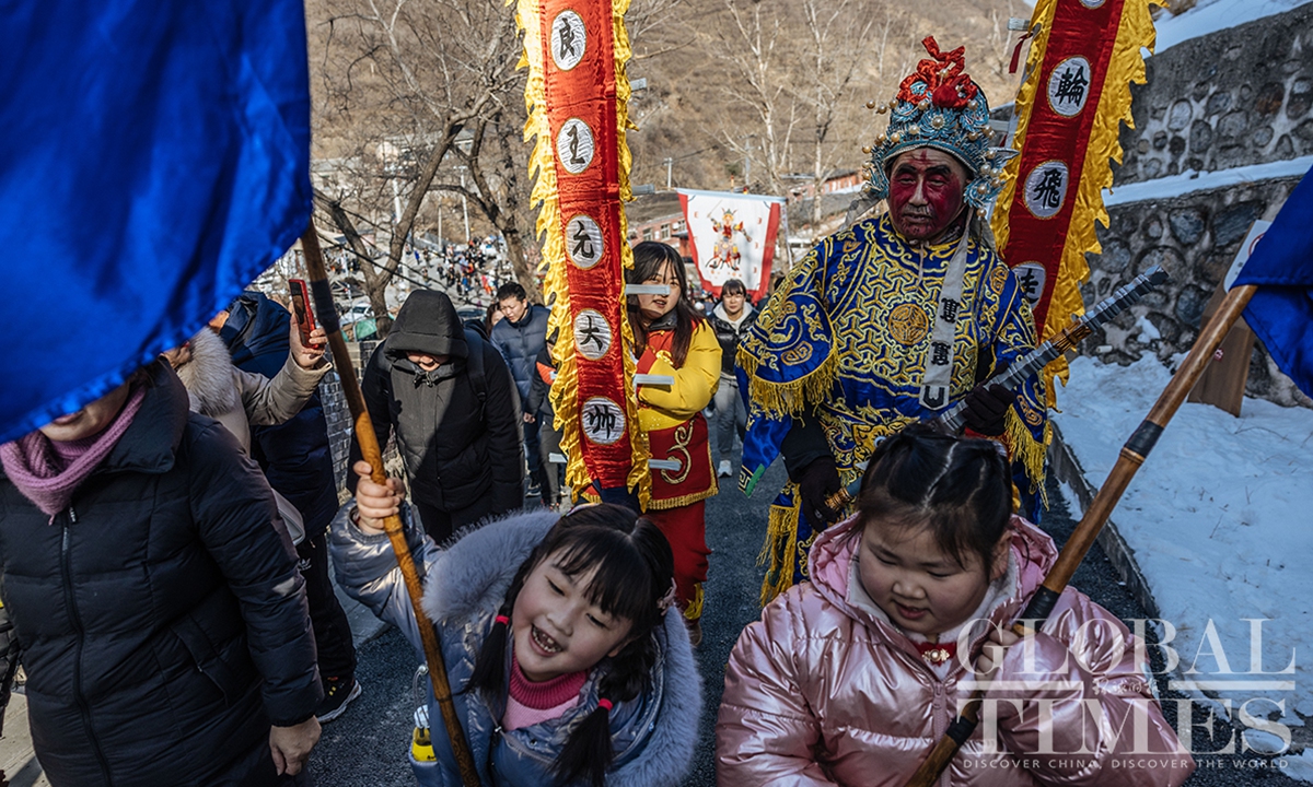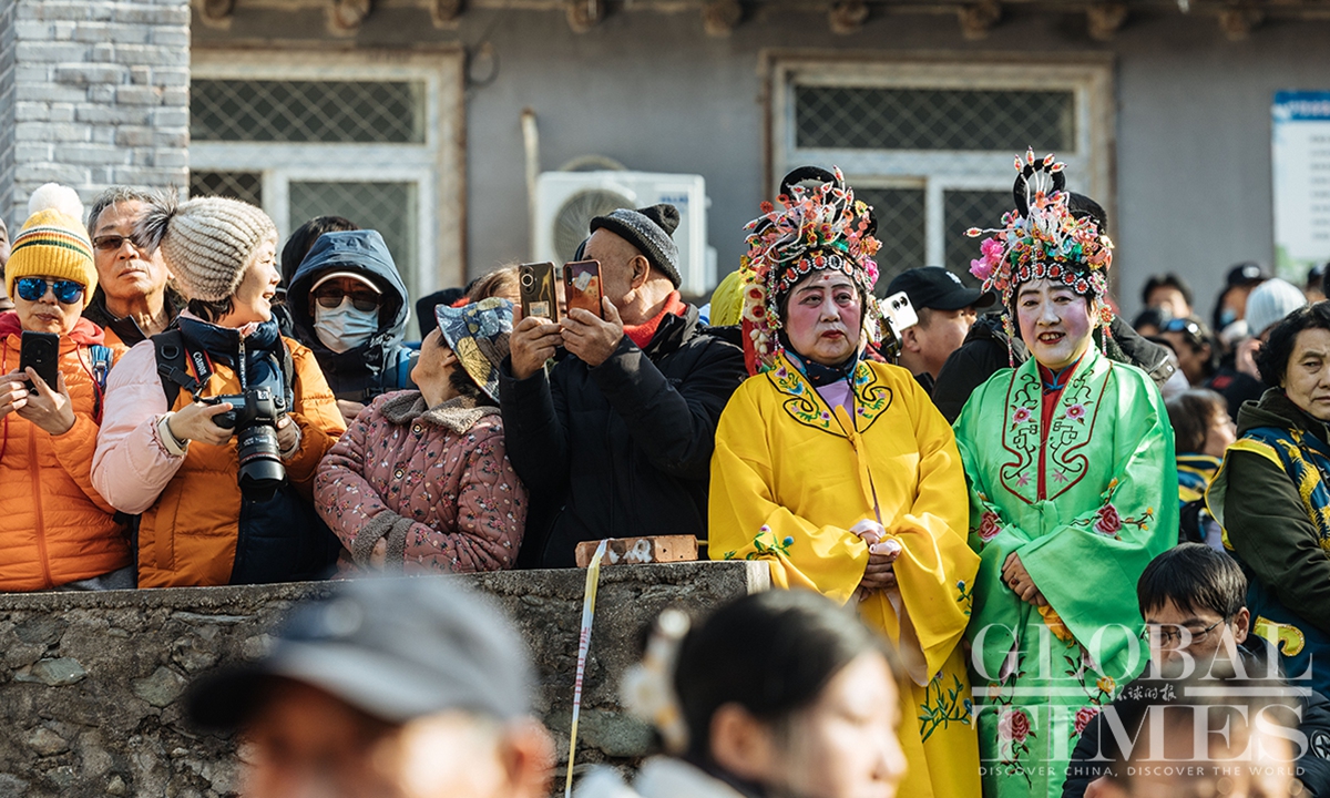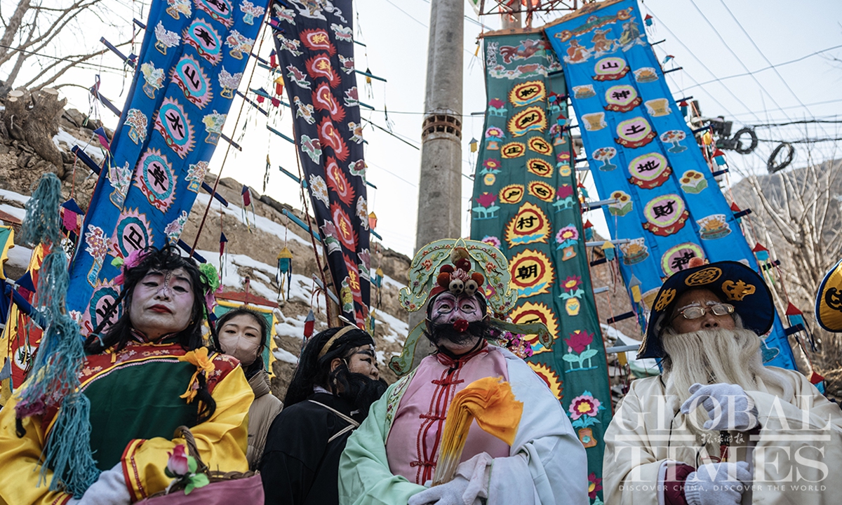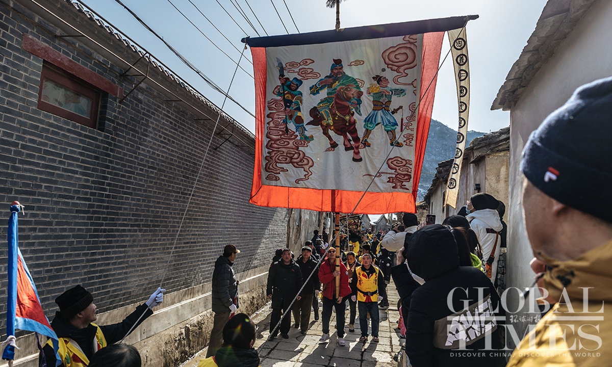In 2023, Mentougou District suffered severe flooding, which washed away many of the festival's hardware facilities. After reconstruction efforts by the village committee, this year's festival resumed as scheduled. On the afternoon of the Lantern Festival, flags flew high, festive music filled the air, and elderly artists joined villagers in celebrating the joyous occasion. (Photo: Li Hao/GT)