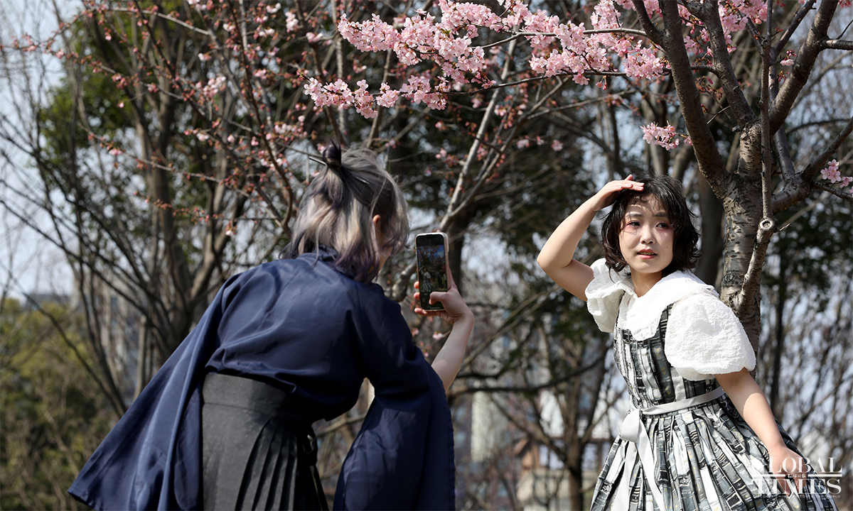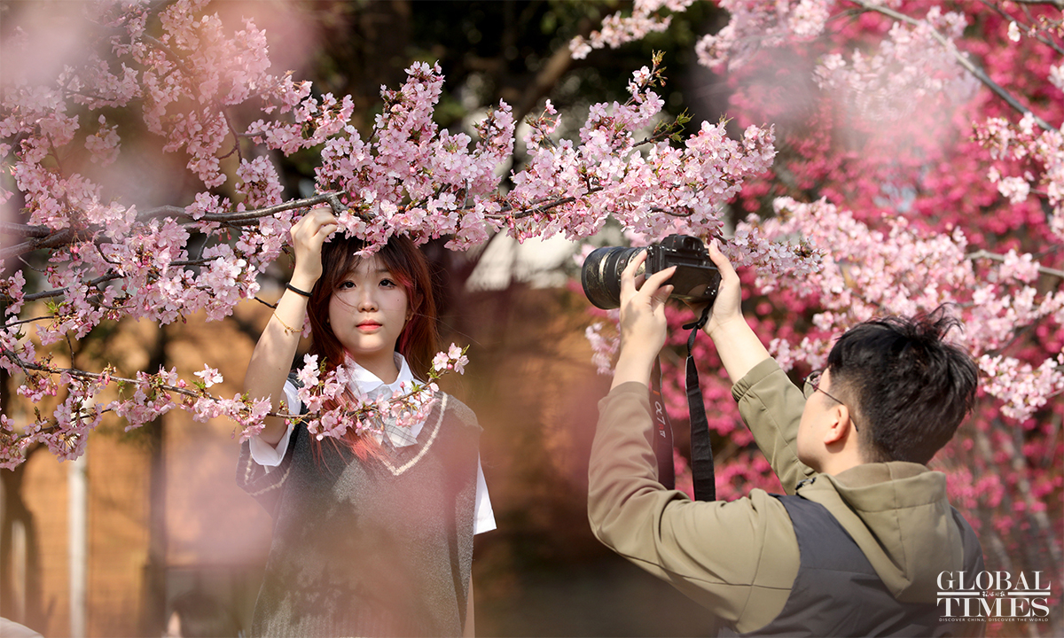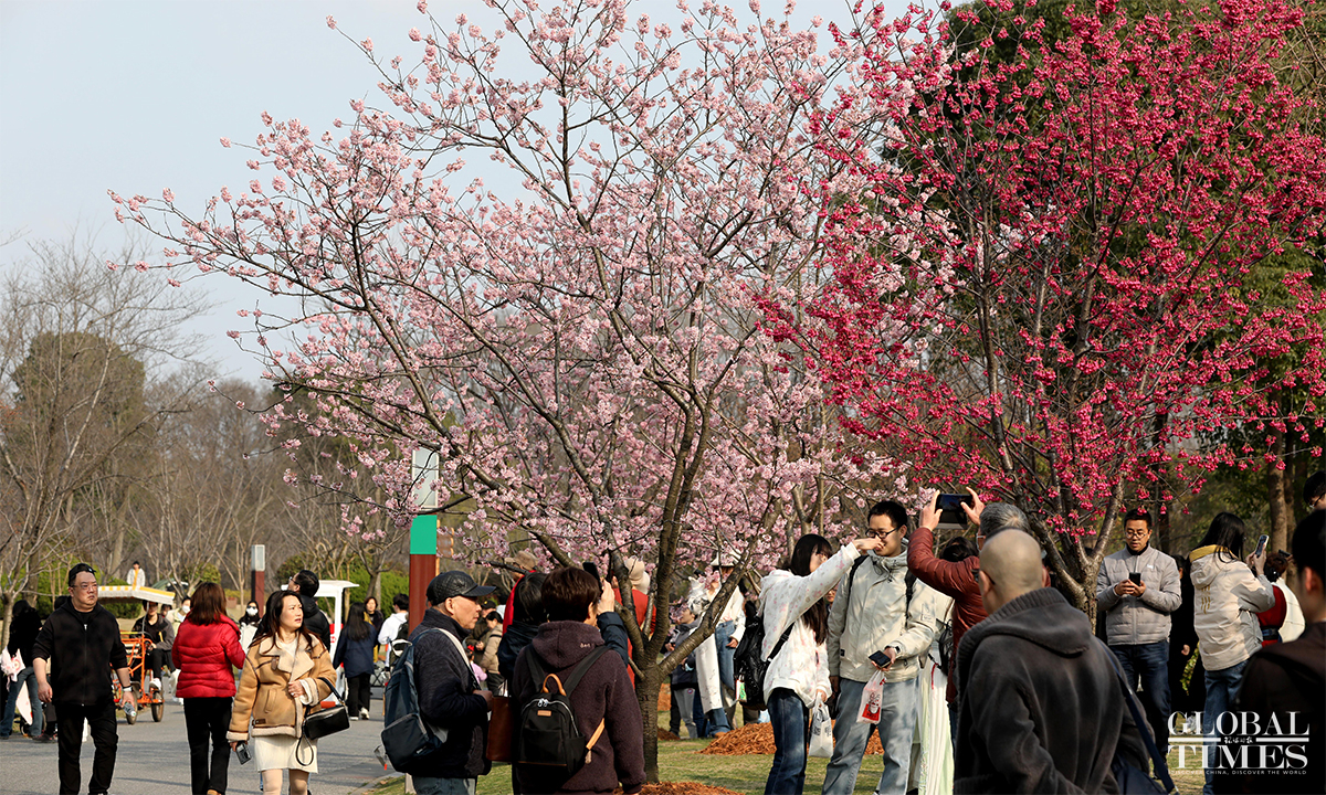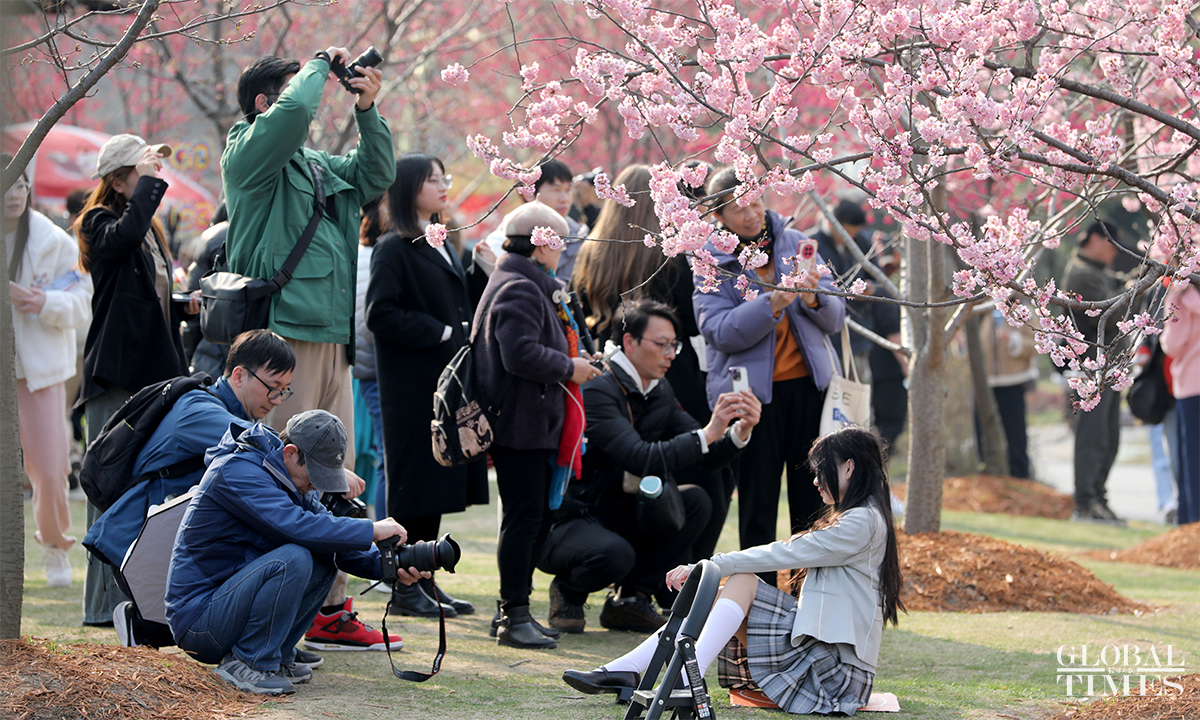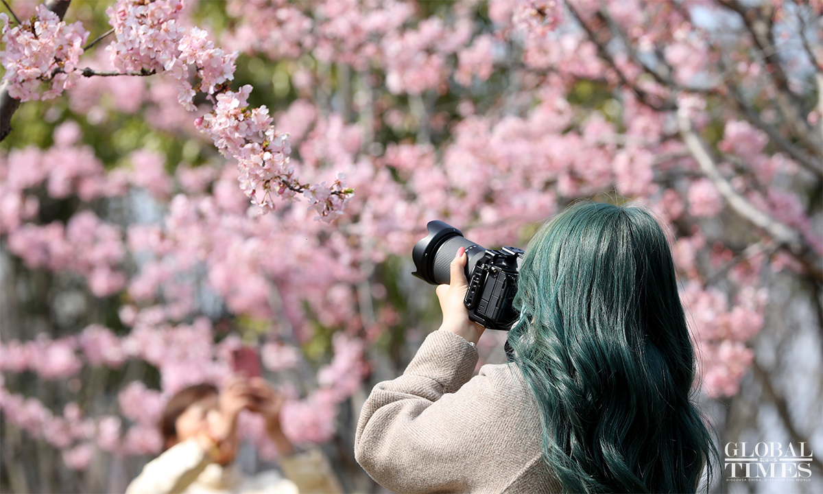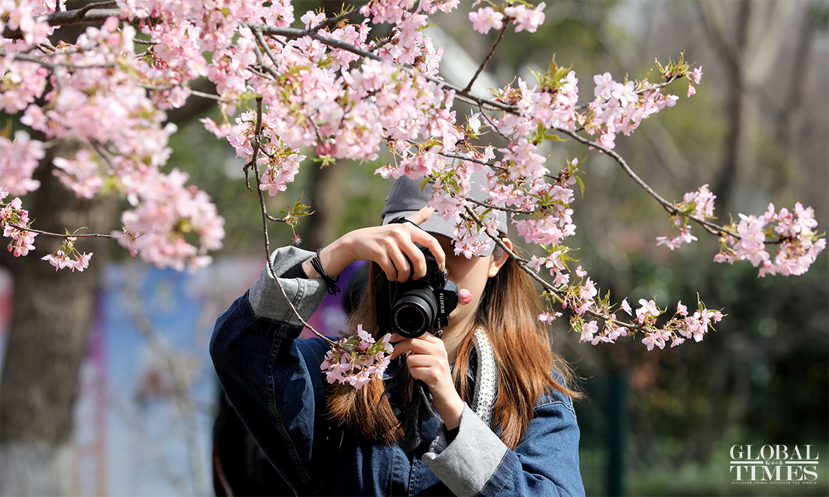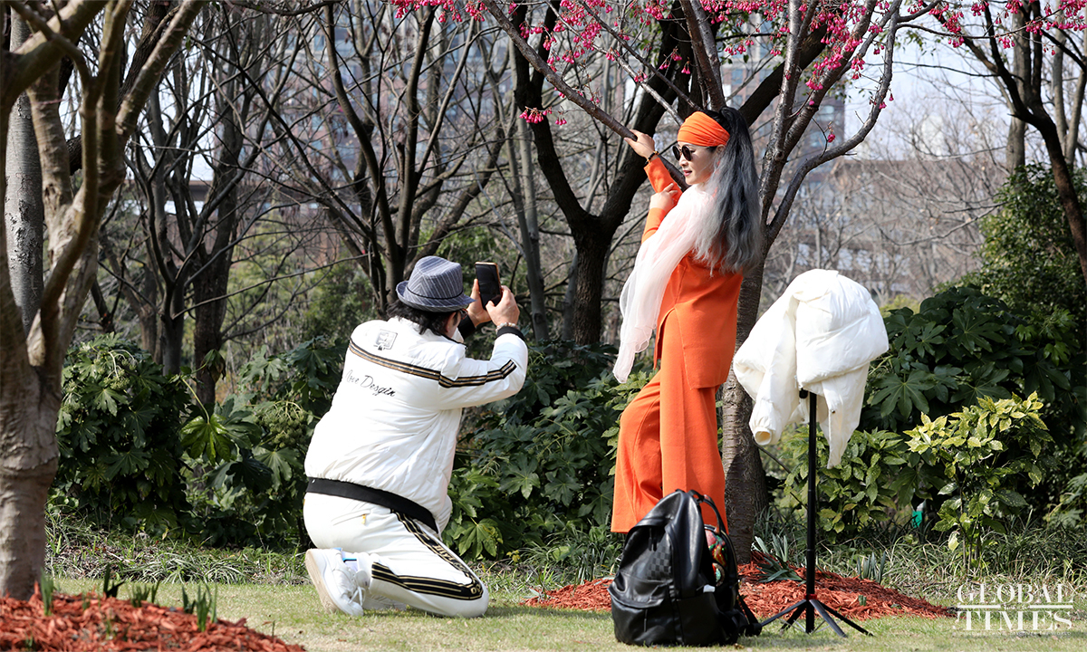 The first wave of early cherry blossoms in Shanghai’s Gucun Park starts to bloom on March 8, 2024, attracting photography enthusiasts to capture its beauty. Gucun Park has reportedly expanded its cherry blossom planting area, featuring 120 varieties, including late bloomers that further extend the cherry blossom viewing period for visitors and residents. (Photos: Chen Xia/GT)