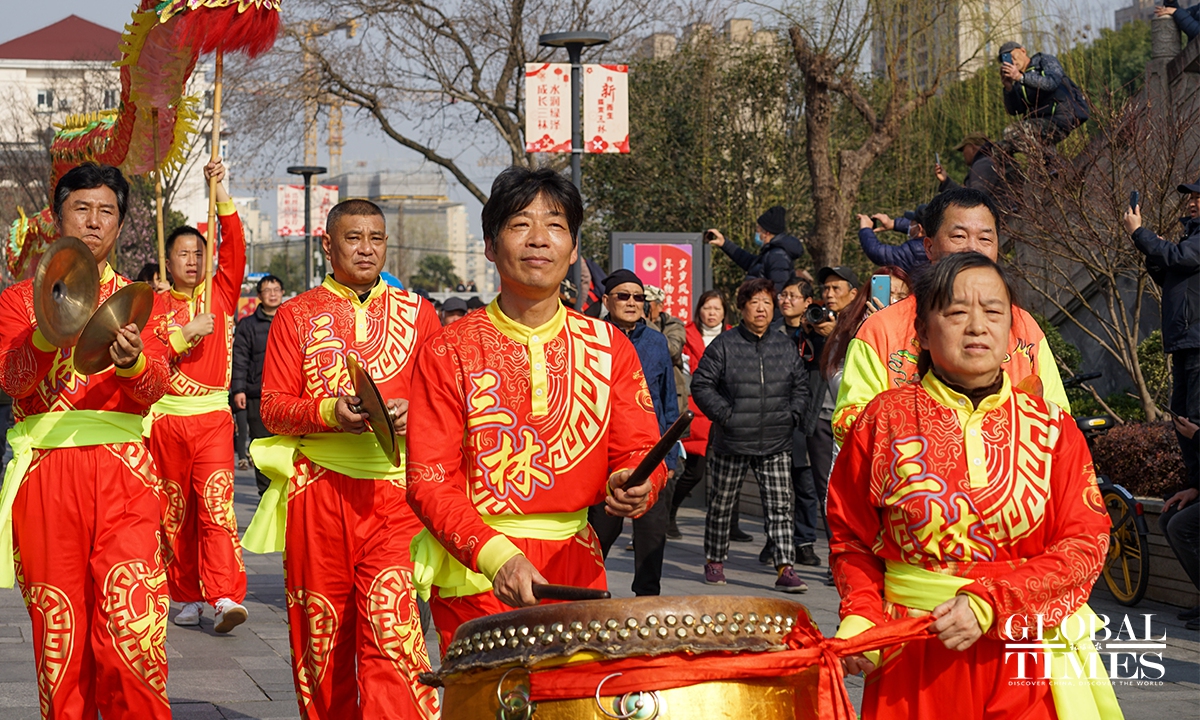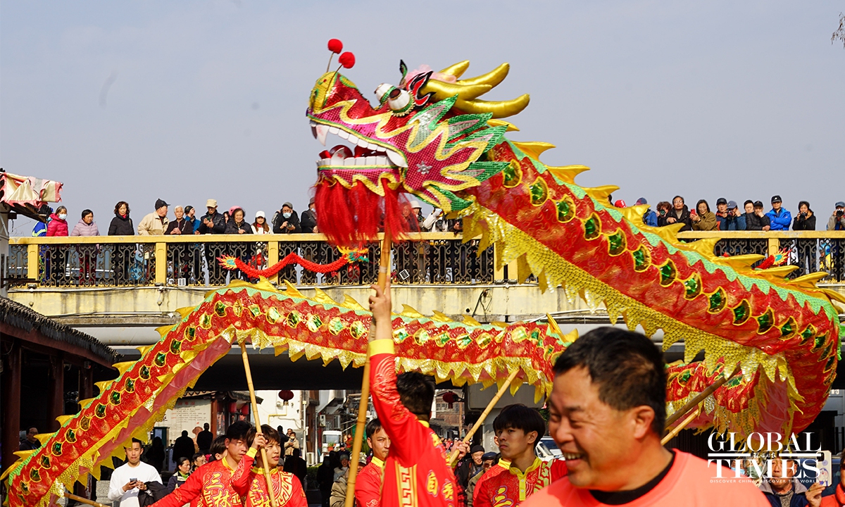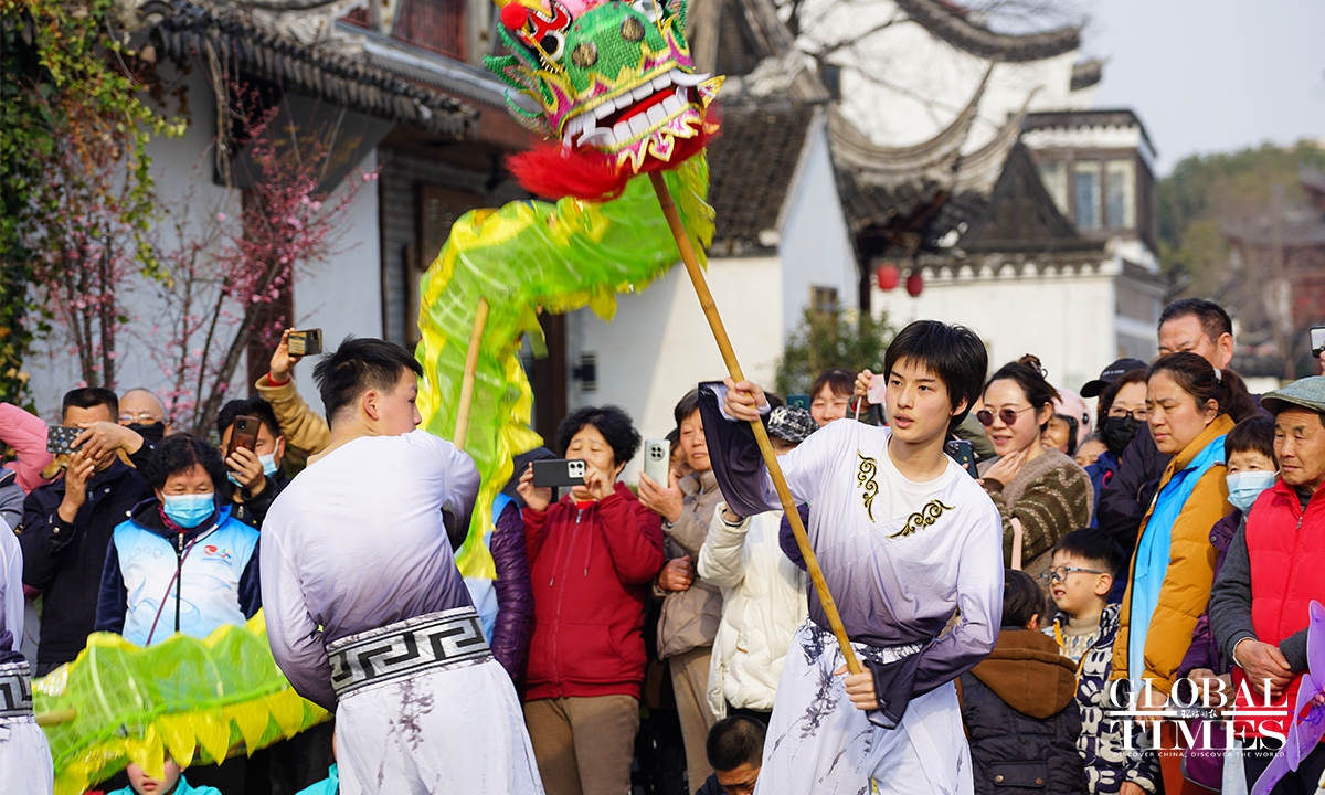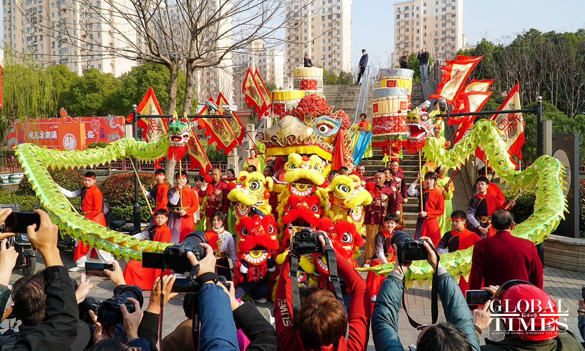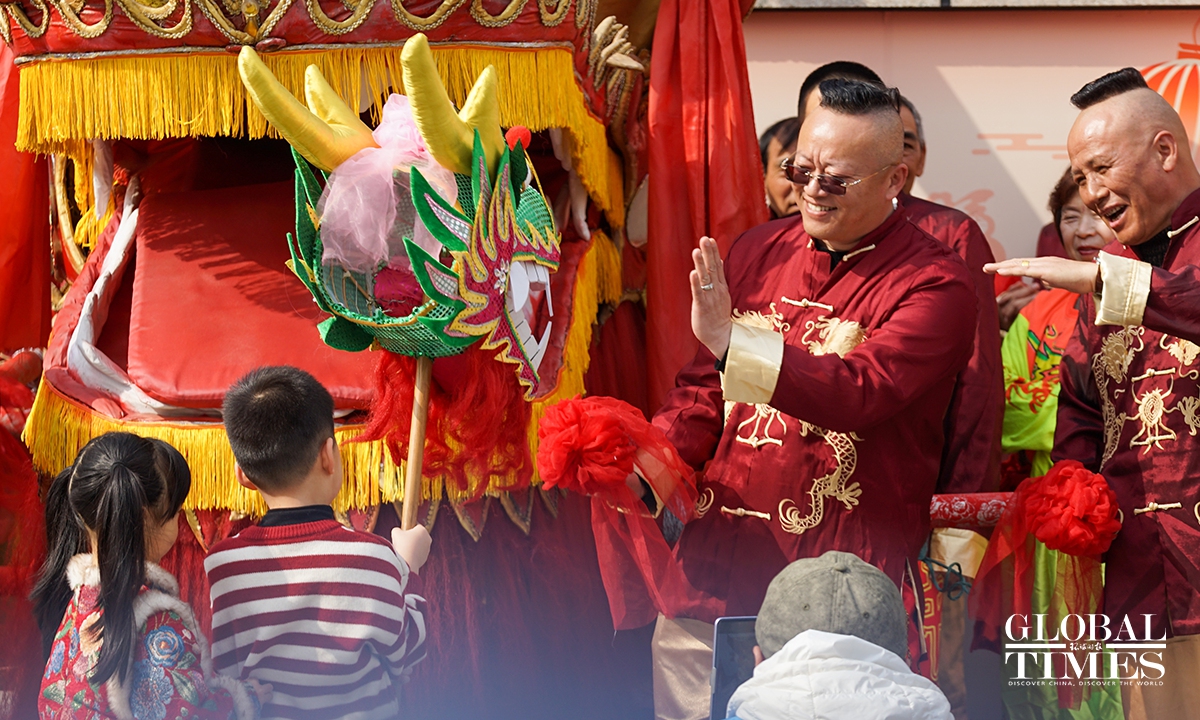 People performed a dragon dance on March 11 to celebrate the Longtaitou Festival in Sanlin Town of Pudong New Area, East China's Shanghai Municipality. The day falls on the second day of the second lunar month, also known as China’s Dragon-Head-Raising Festival. Many adults also lifted their children to touch the dragon head and pull its whiskers, while praying for good luck in the New Year. Photos: Lu Ting/GT