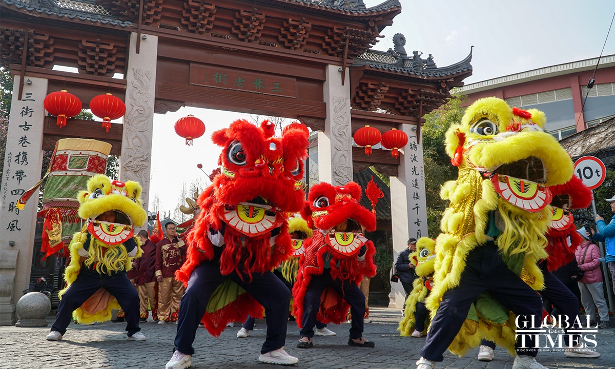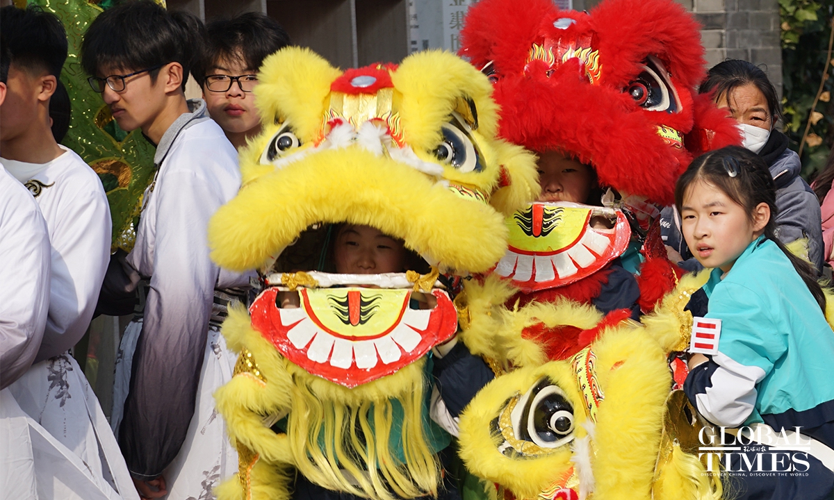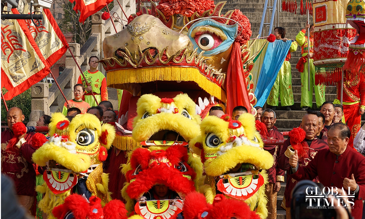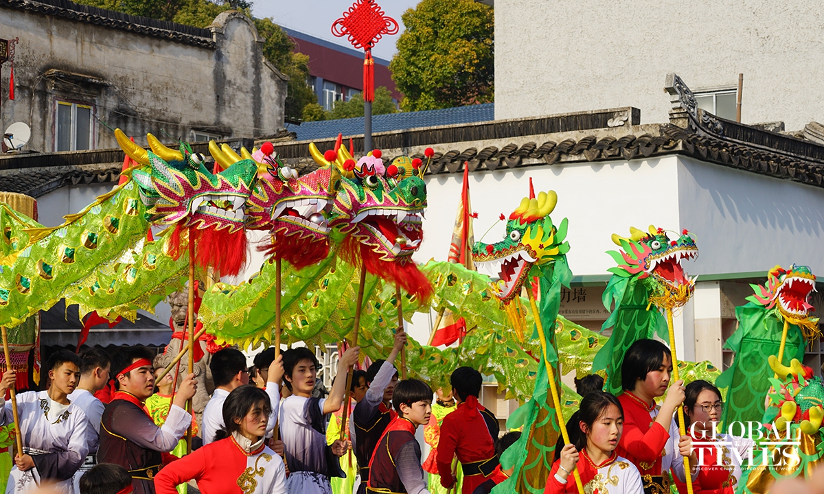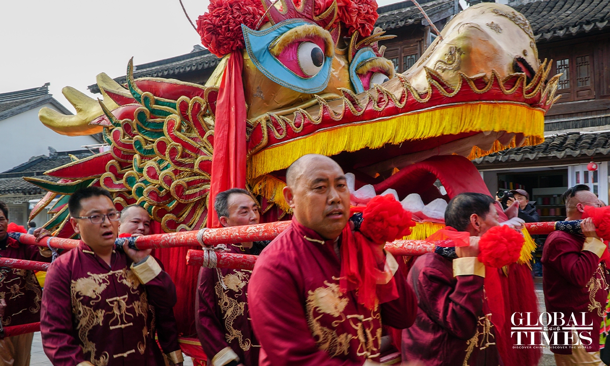 People performed a dragon dance on March 11 to celebrate the Longtaitou Festival in Sanlin Town of Pudong New Area, East China's Shanghai Municipality. The day falls on the second day of the second lunar month, also known as China’s Dragon-Head-Raising Festival. Many adults also lifted their children to touch the dragon head and pull its whiskers, while praying for good luck in the New Year. Photos: Lu Ting/GT