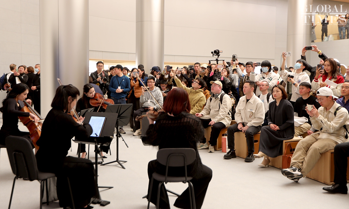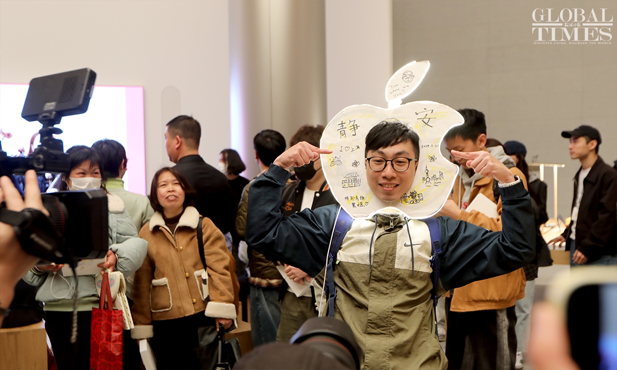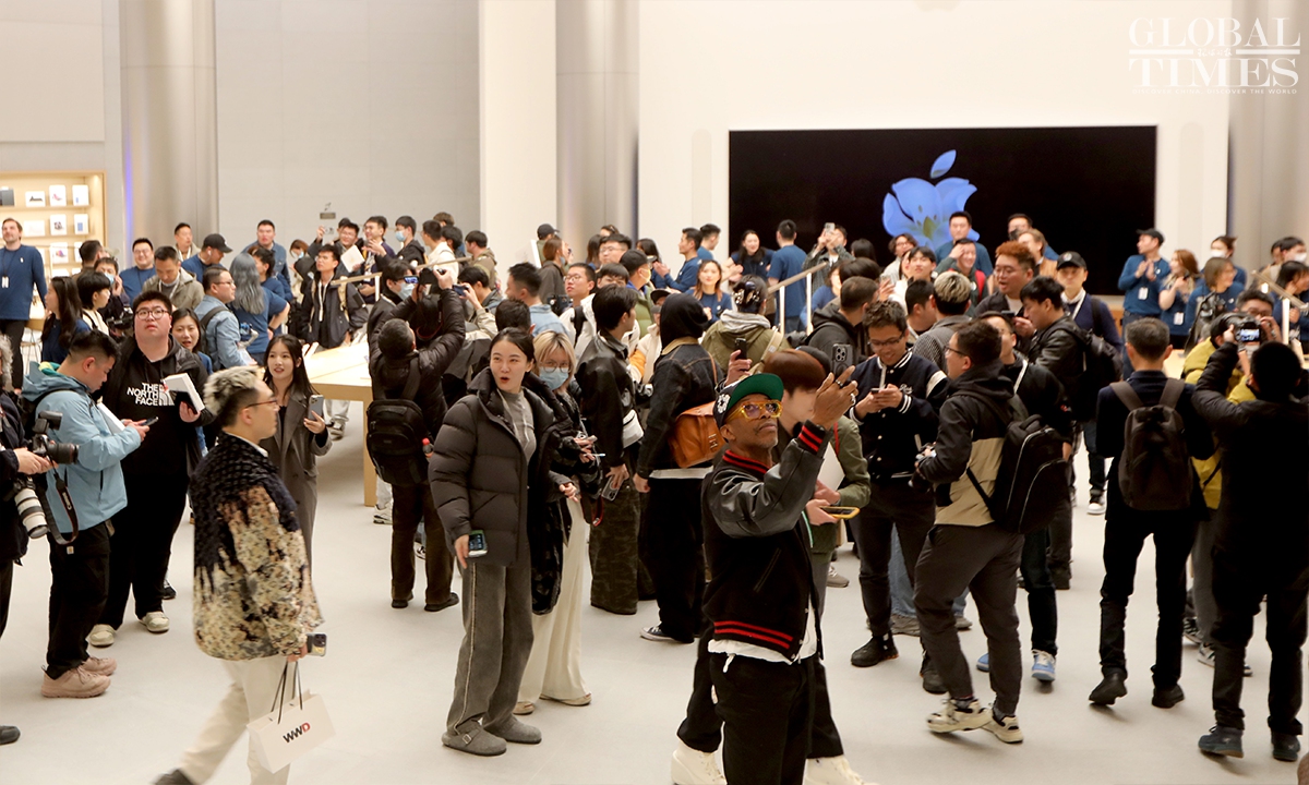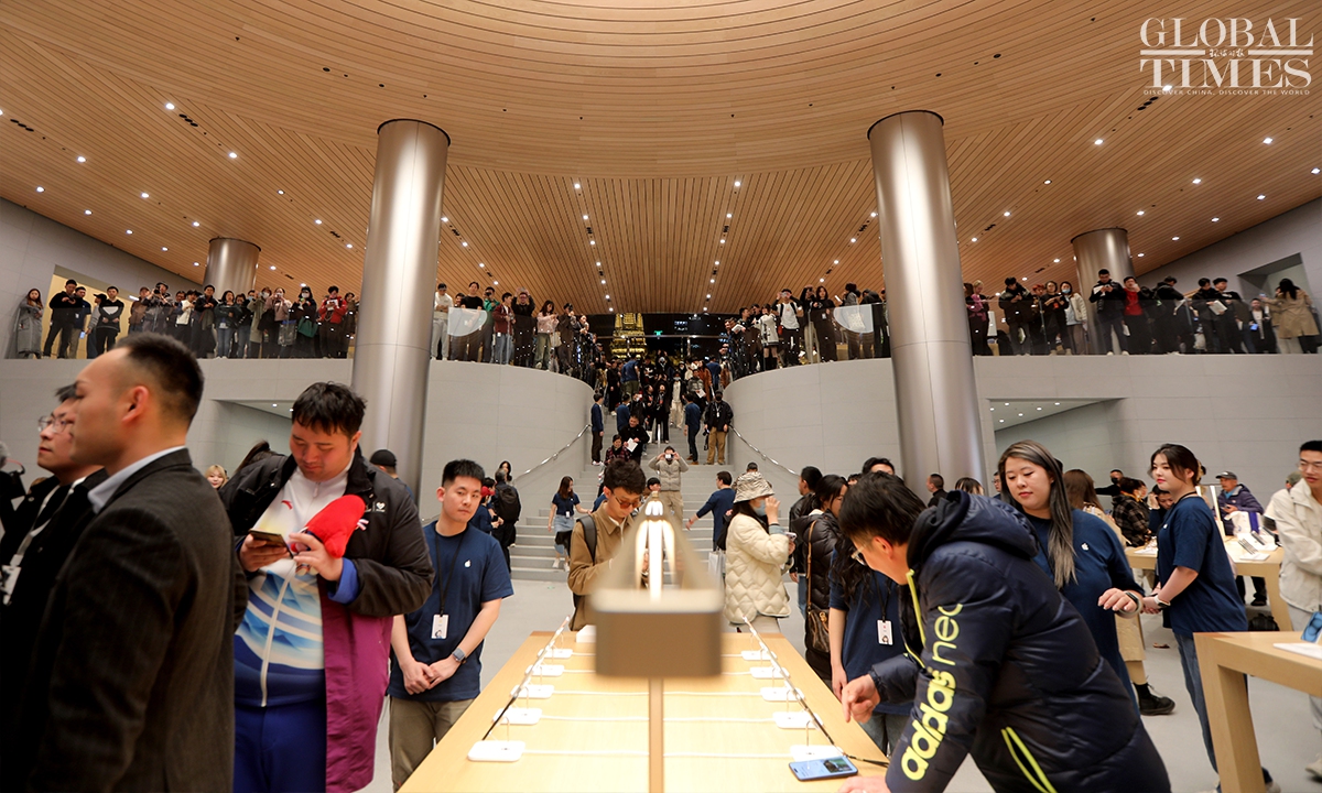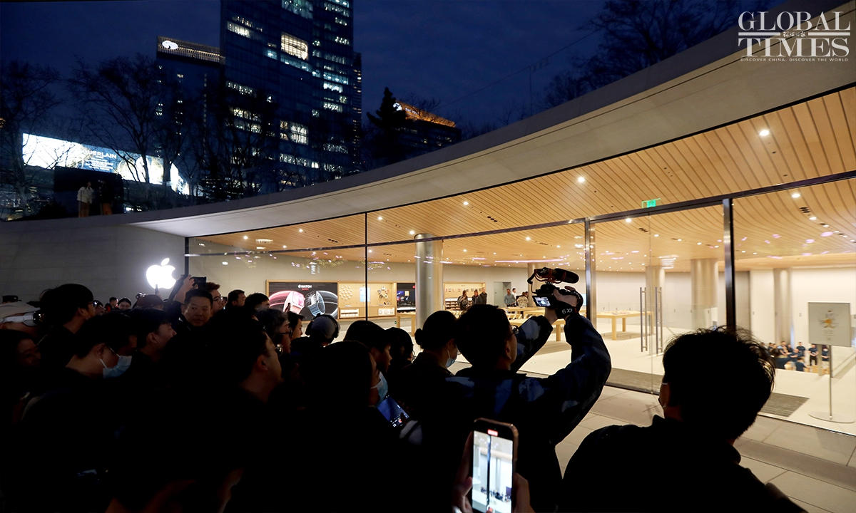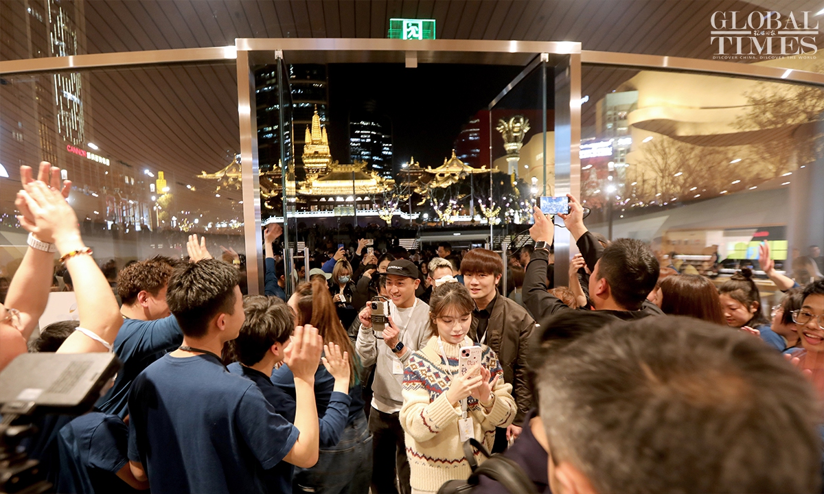 As was widely expected, Apple CEO Tim Cook showed up at the opening of the new flagship store in Shanghai on March 21 as the iPhone maker makes a deeper push into the Chinese market. He walked out of the store at 7 pm and waved to the waiting audience. Cook took pictures with the first batch of customers and signed autographs for them. Staff members from the store lined up in two rows, greeting every customer walking in and enthusiastically introducing the products to them. (Photos: Chen Xia/GT)