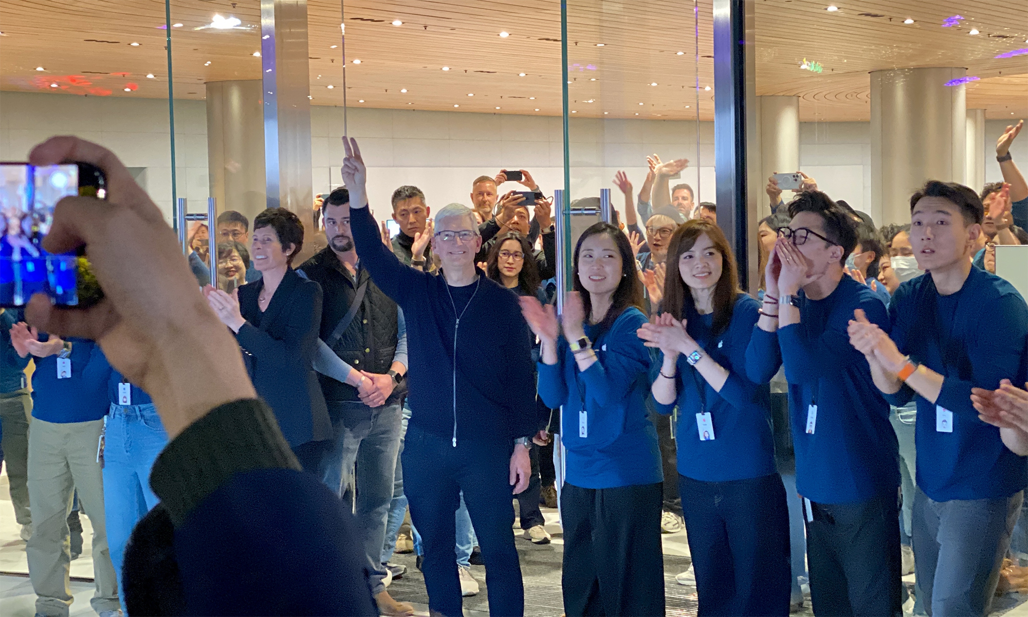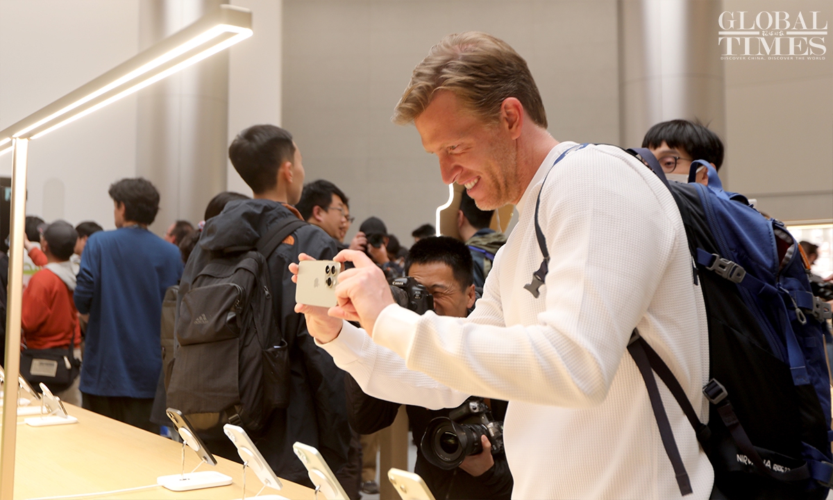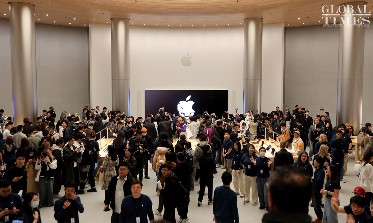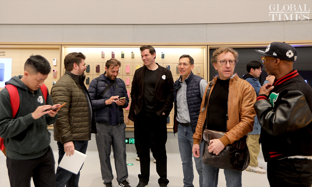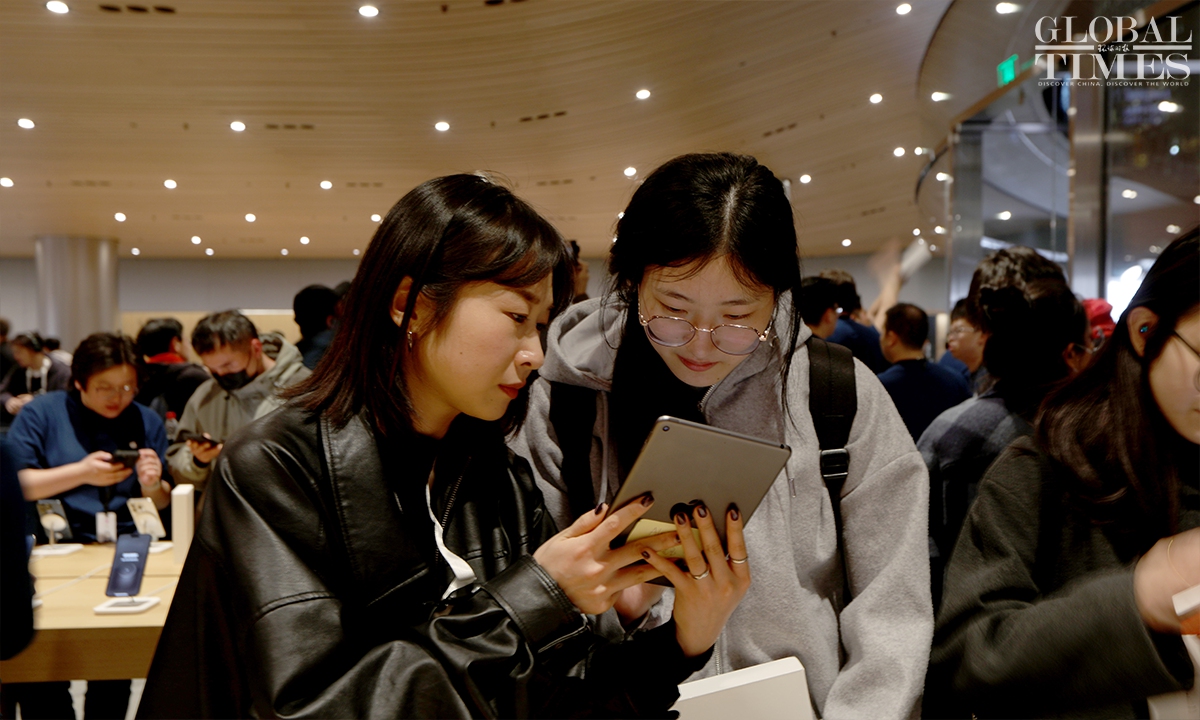 As was widely expected, Apple CEO Tim Cook showed up at the opening of the new flagship store in Shanghai on March 21 as the iPhone maker makes a deeper push into the Chinese market. He walked out of the store at 7 pm and waved to the waiting audience. Cook took pictures with the first batch of customers and signed autographs for them. Staff members from the store lined up in two rows, greeting every customer walking in and enthusiastically introducing the products to them. (Photos: Chen Xia/GT)