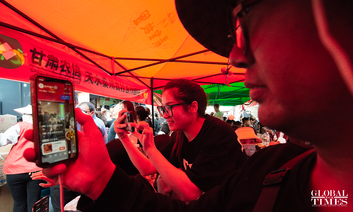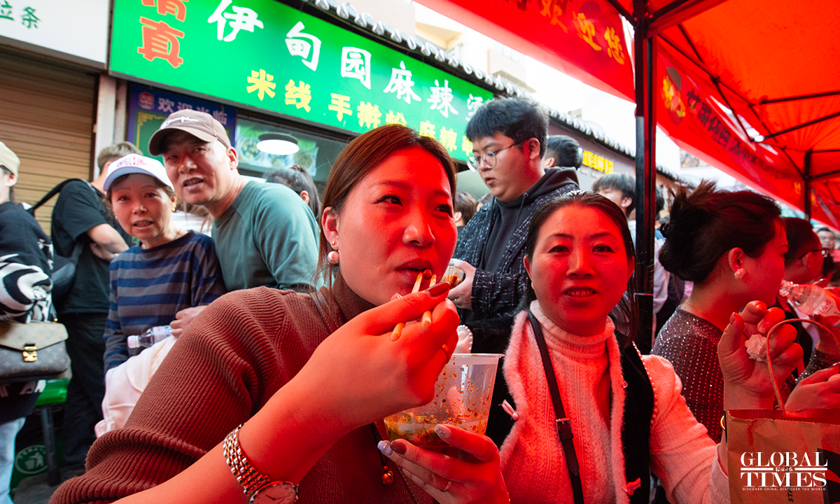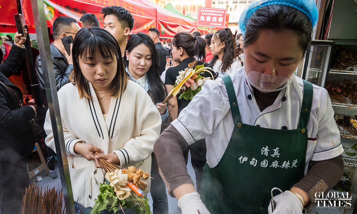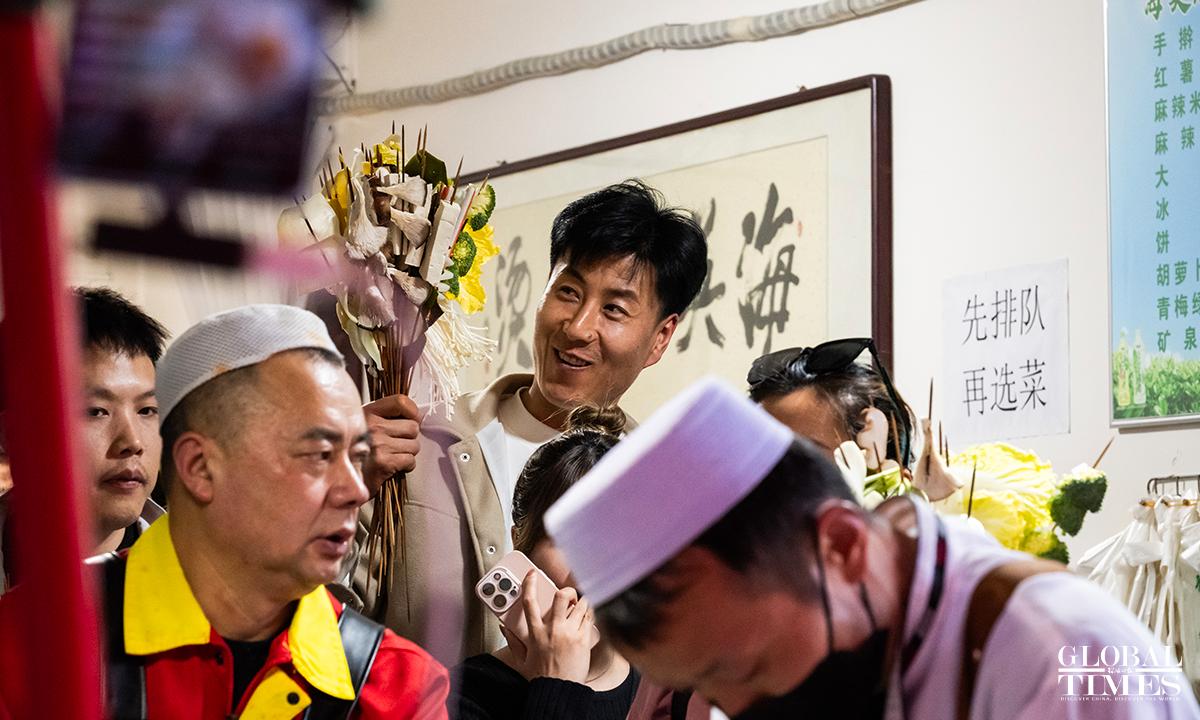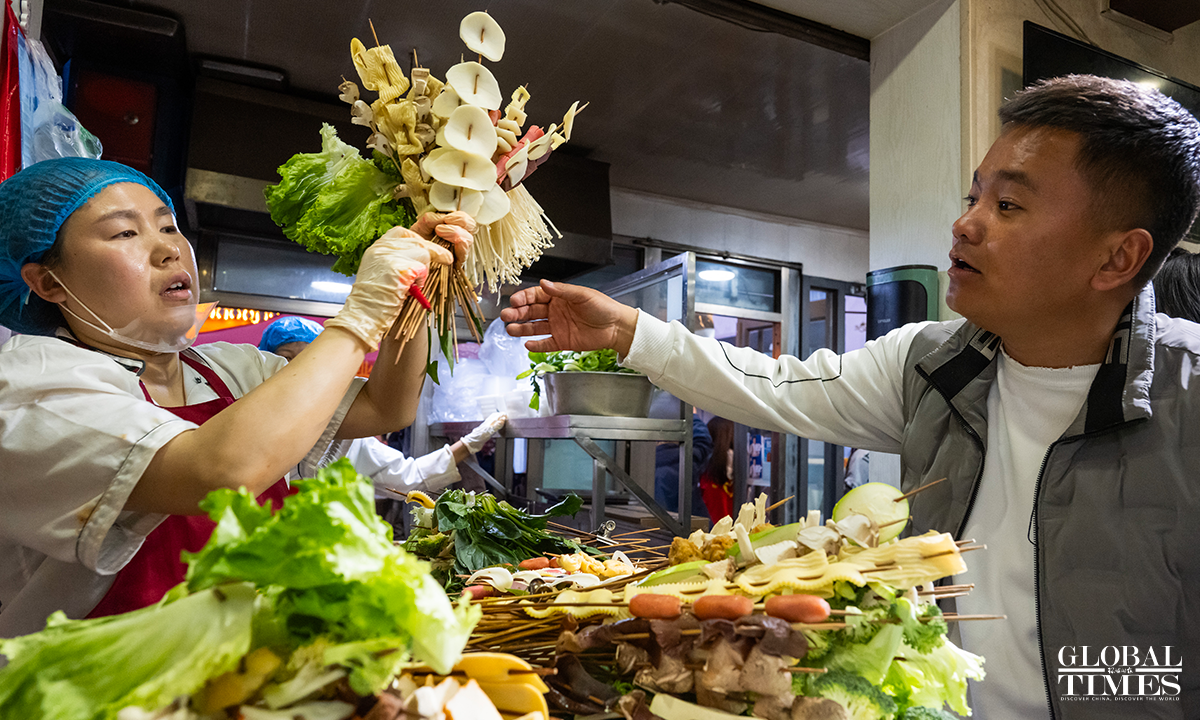 "Tianshui Malatang," a type of street hotpot variation native to Tianshui, Gansu Province, has gone viral online in March 2024. Its essence lies in the "Gangu chili," produced in the city's Gangu County. "Siheyuan" is currently the most popular Malatang street. In pursuit of improved tourist services, new measures such as volunteer guides have been introduced here in the recent 10 days, shaping a well-ordered Malatang "microcosm." Photos: Chen Tao/GT