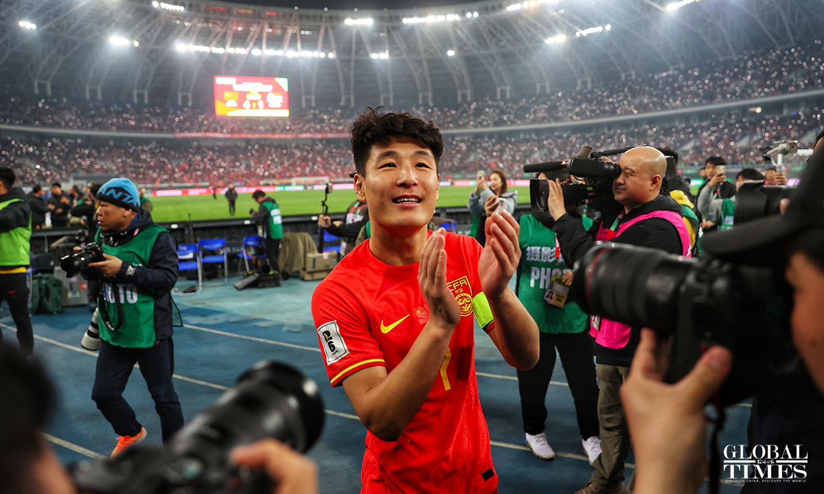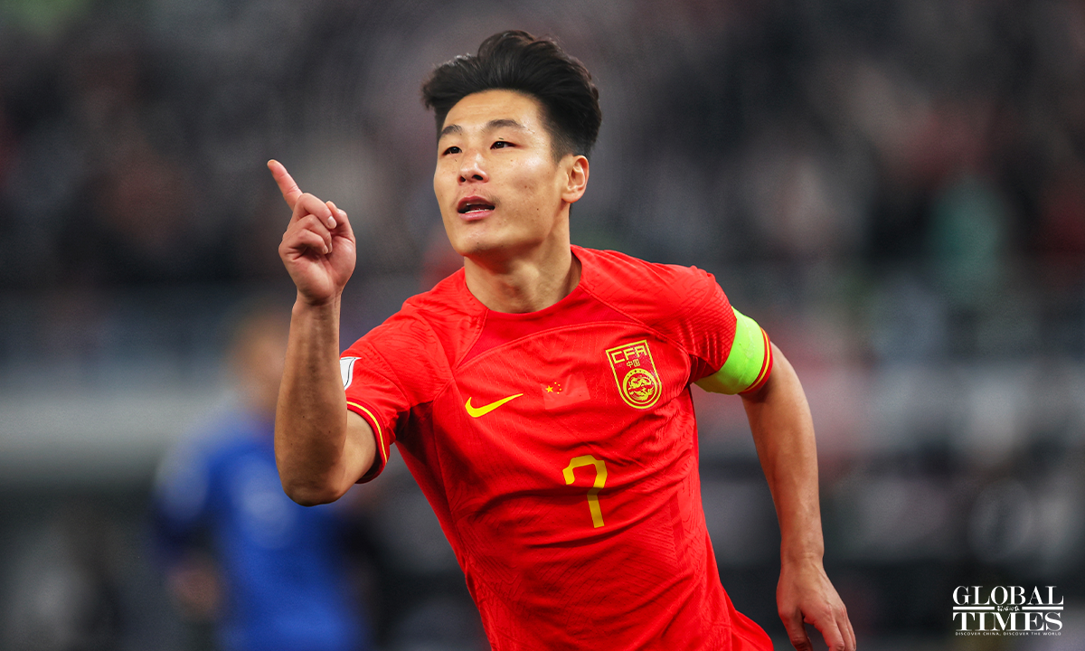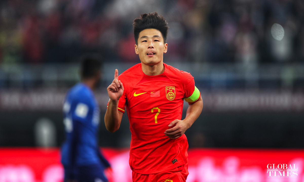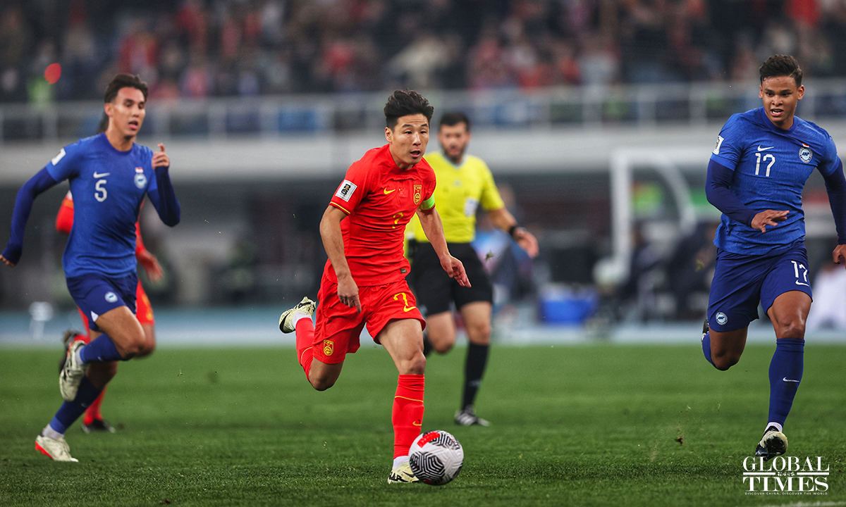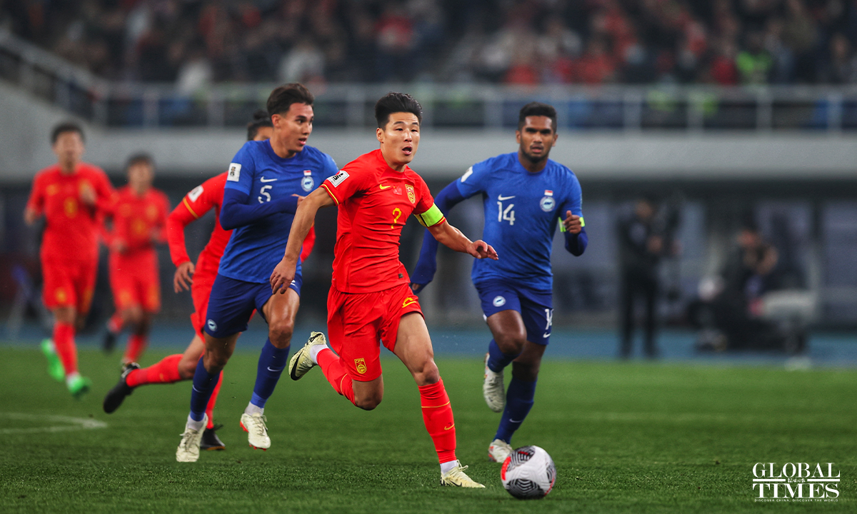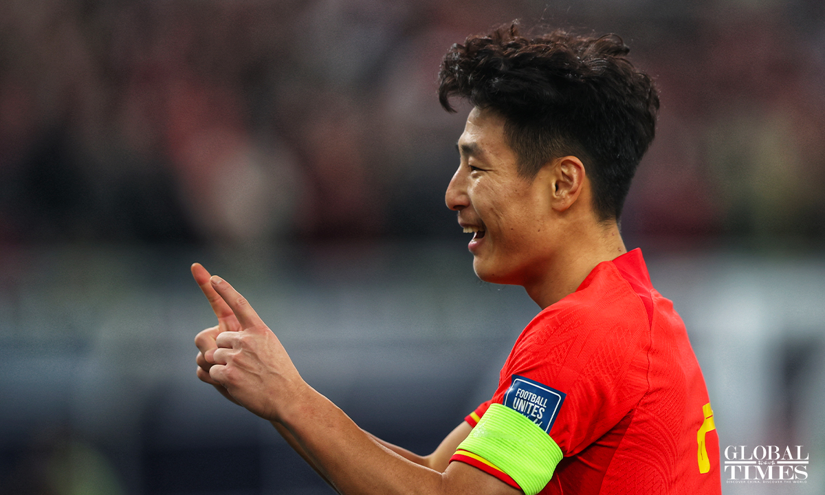 Striker Wu Lei contributed two goals and an assist to help the Chinese national soccer team bounce back with a 4-1 win over Singapore in their group C match of the 2026 FIFA World Cup Asian qualifiers in North China's Tianjin on Tuesday, ending the team's winless streak since November 2023. Photos: Cui Meng/GT