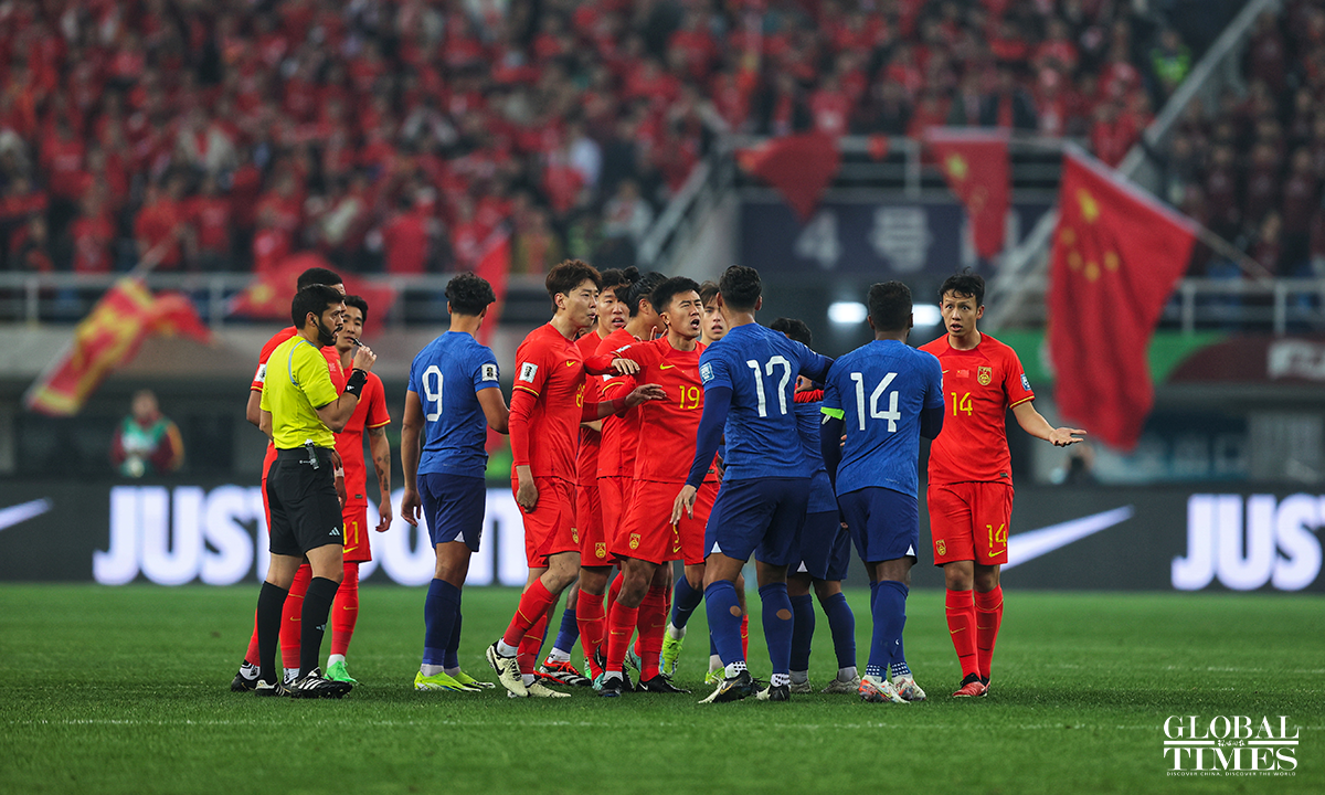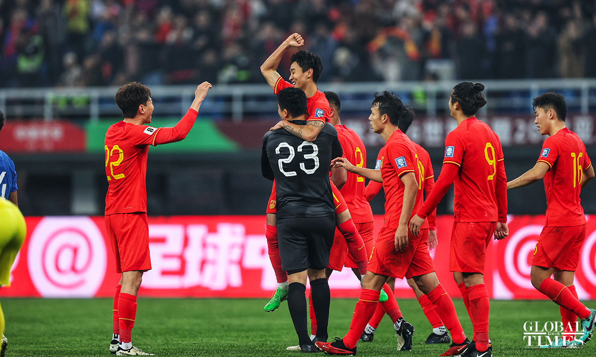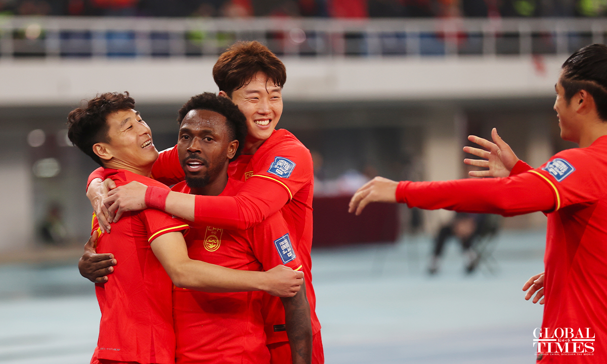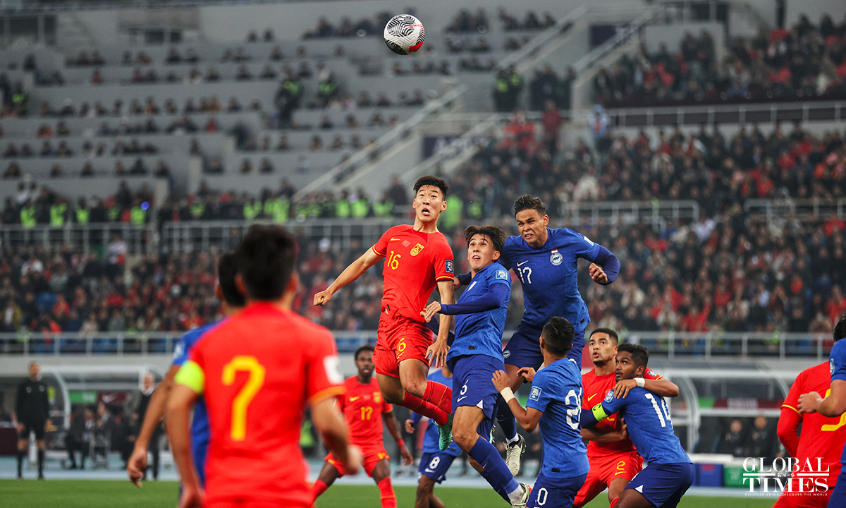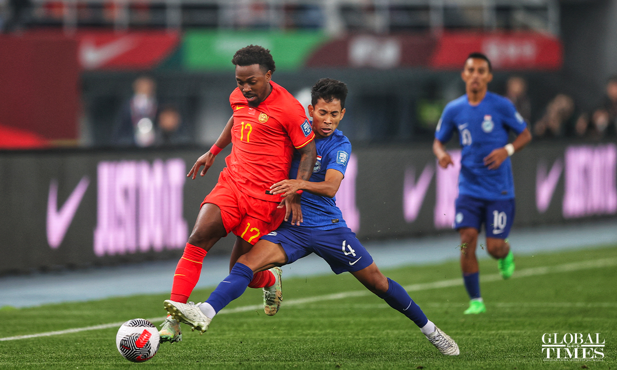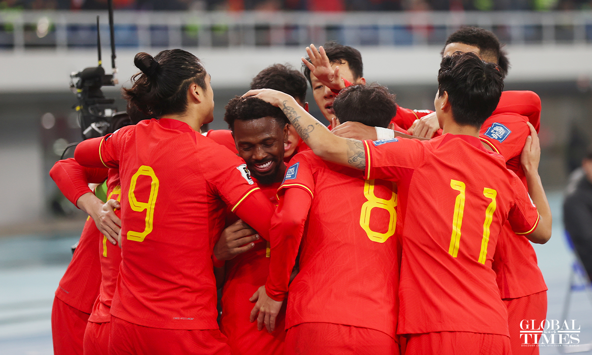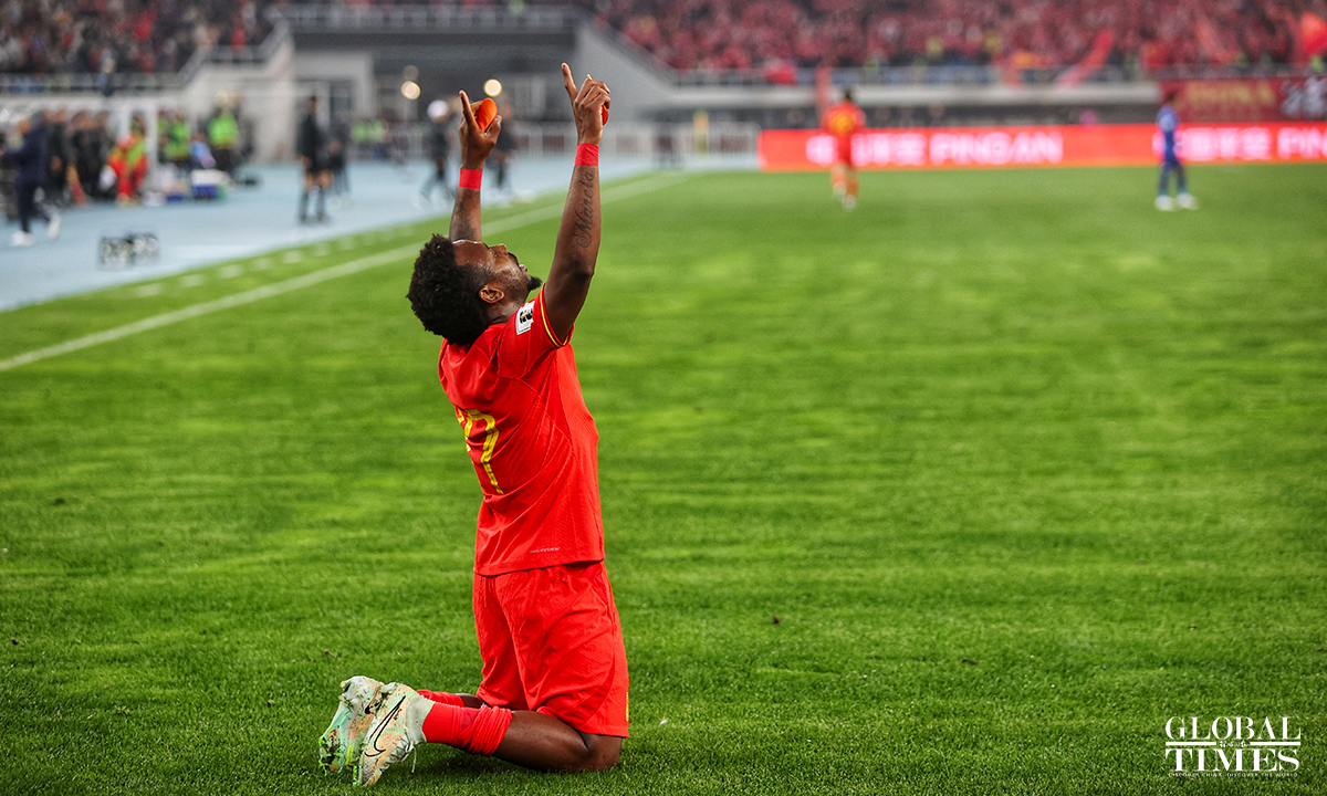 Striker Wu Lei contributed two goals and an assist to help the Chinese national soccer team bounce back with a 4-1 win over Singapore in their group C match of the 2026 FIFA World Cup Asian qualifiers in North China's Tianjin on Tuesday, ending the team's winless streak since November 2023. Photos: Cui Meng/GT