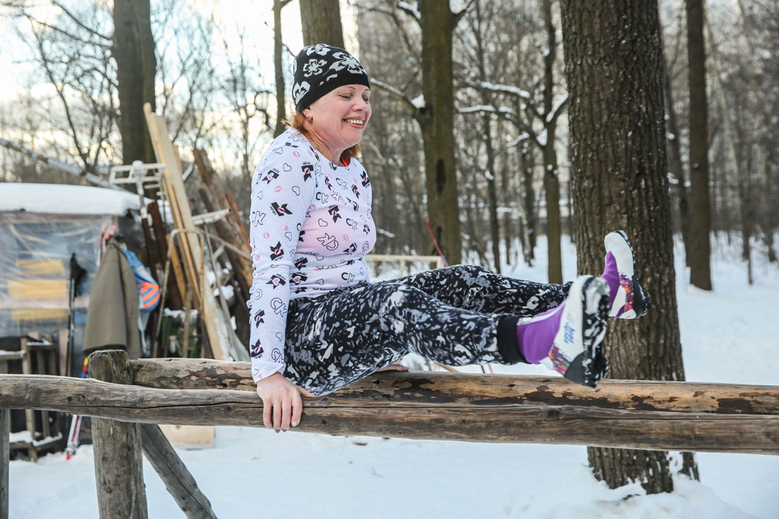 A woman exercises on a pair of parallel bars made from tree branches at a park in Moscow on January 21. Photo: CFP figcaption >