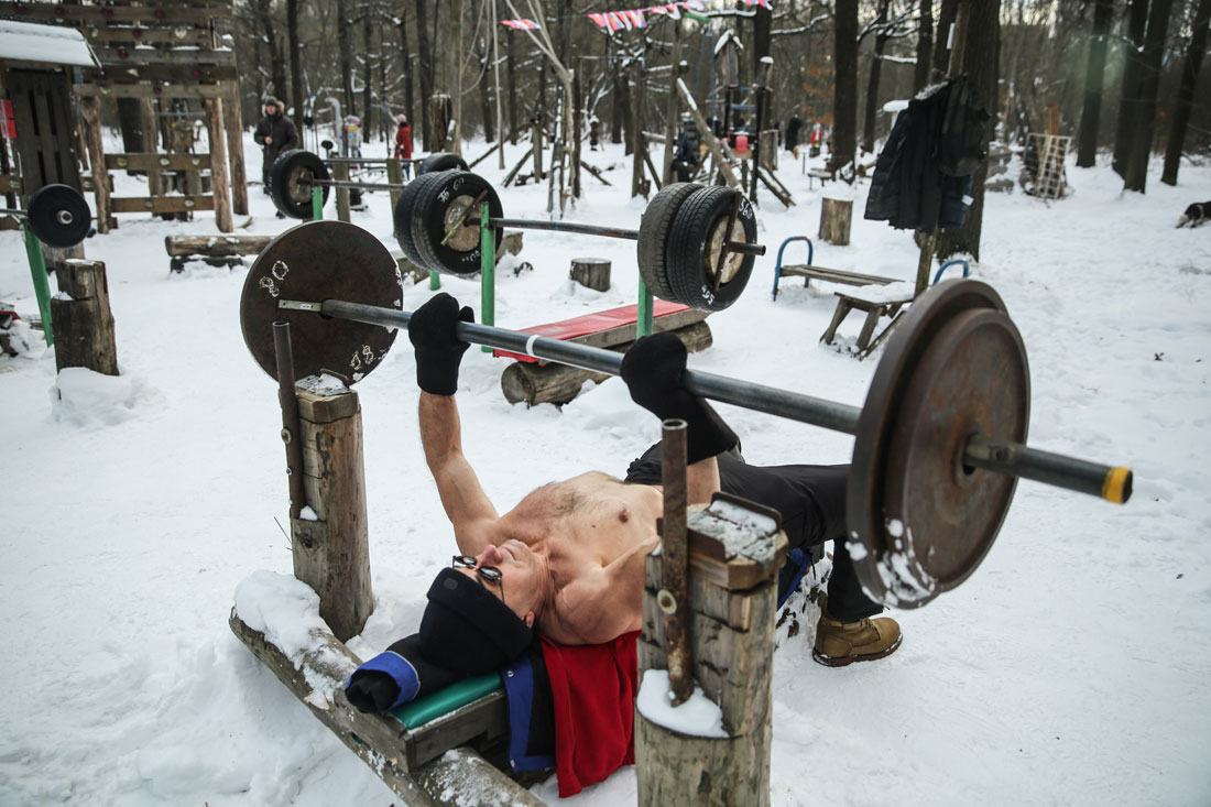 With the temperature sitting at -20 C, citizens exercise on homemade fitness machines in the open air at Timiryazevsky Park in Moscow, Russia on January 21.