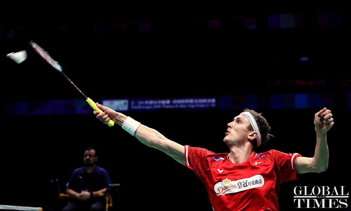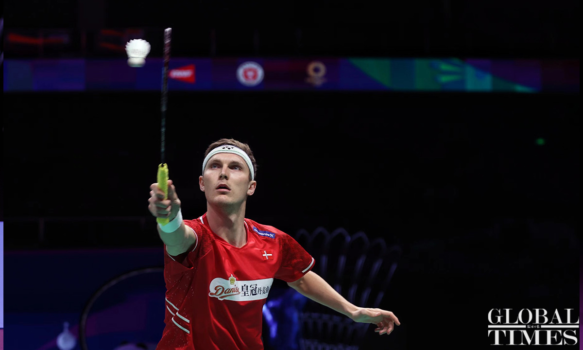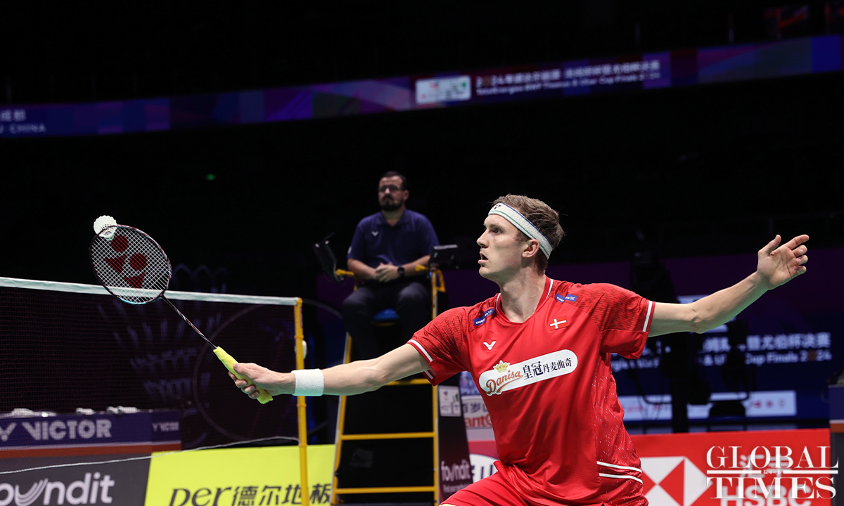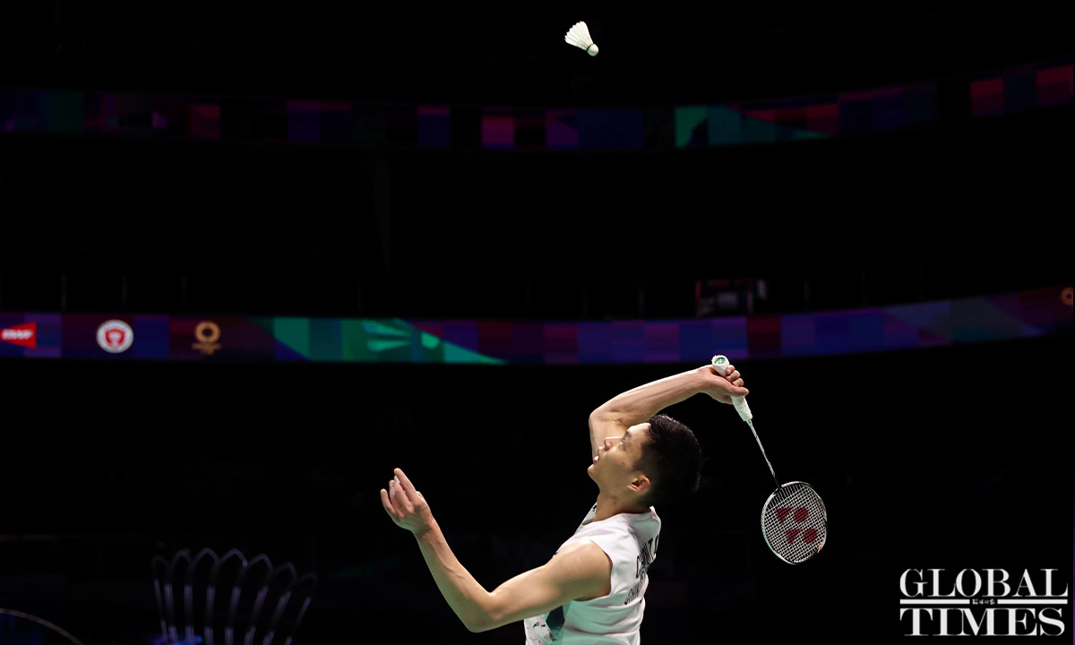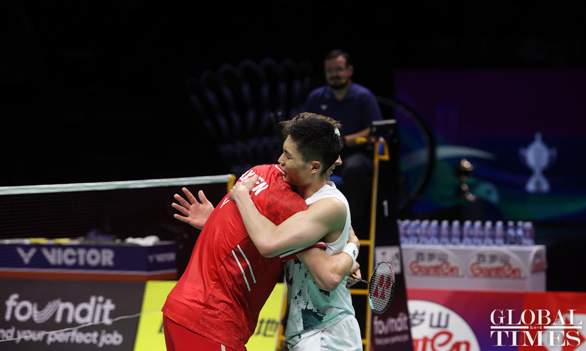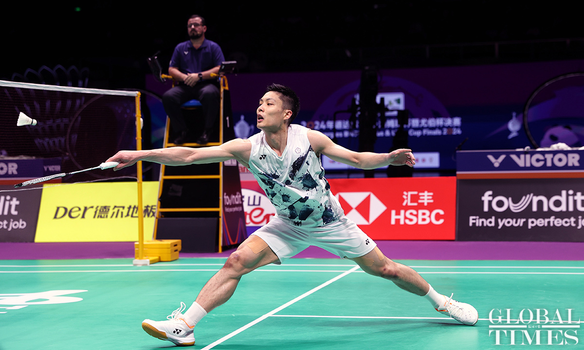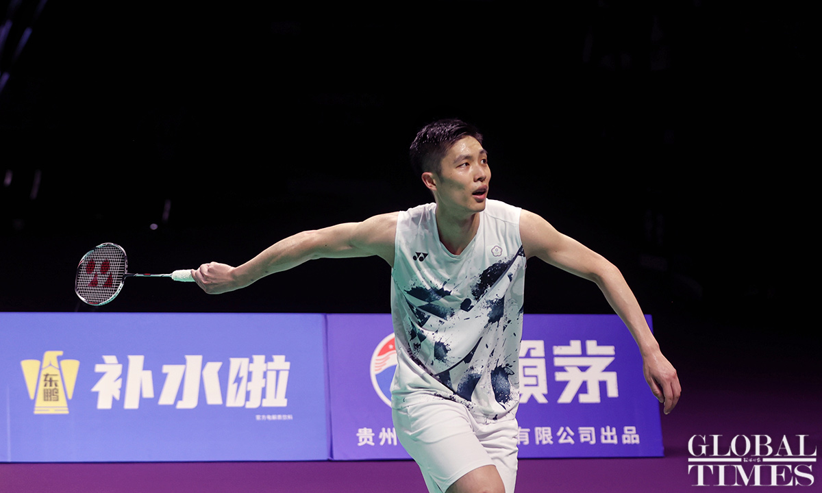 Chou Tien-chen of Team Chinese Taipei stunned world No. 1 Viktor Axelsen with a score of 21-19, 14-21, 21-19 on Friday in Southwest China’s Chengdu, securing a spot in the Thomas and Uber Cup semifinals. Photos: Cui Meng/GT