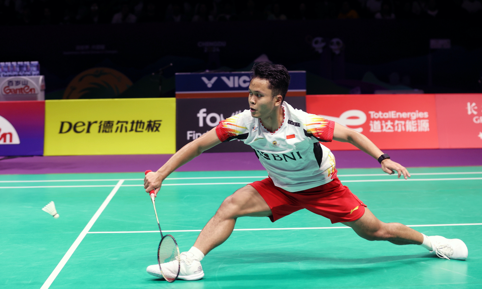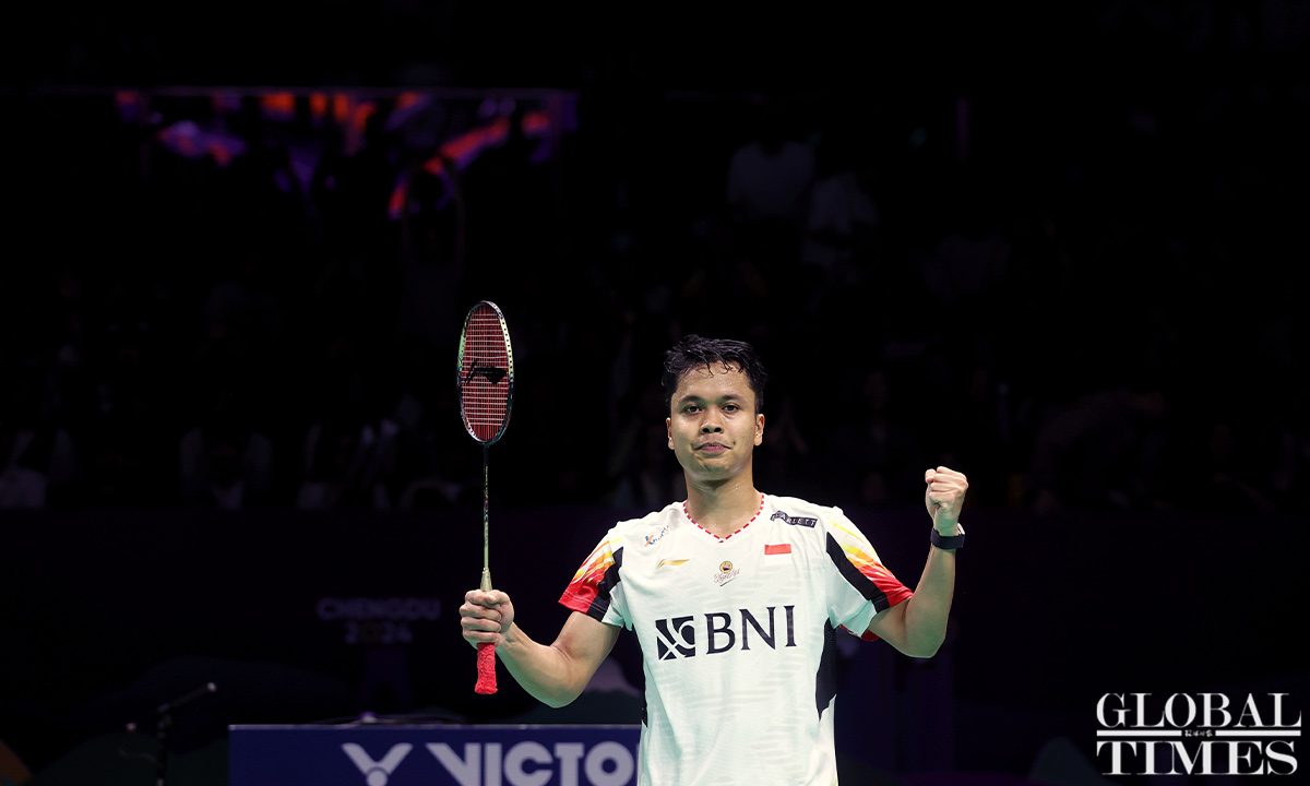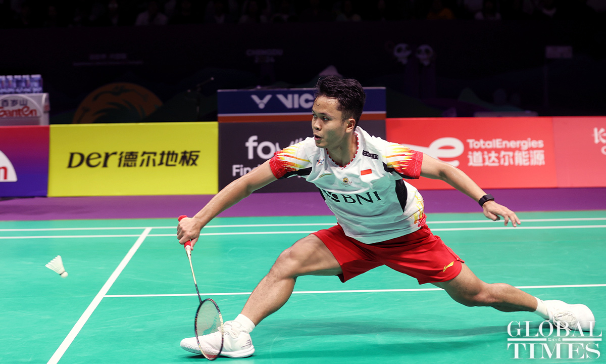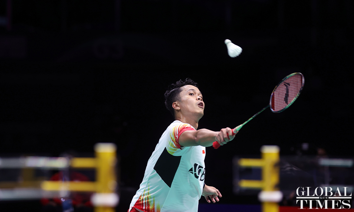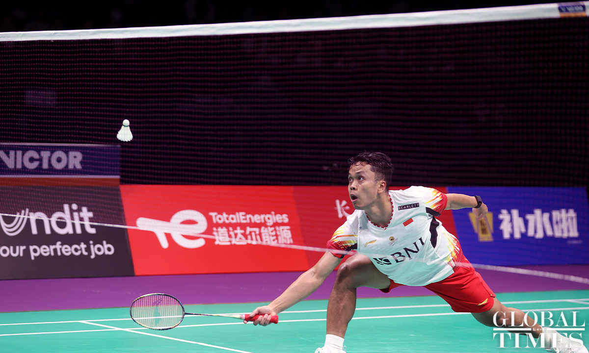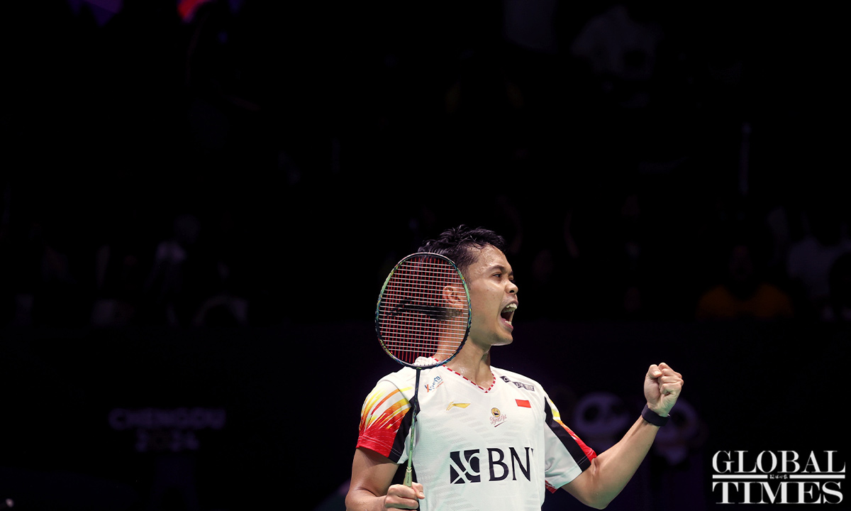 Anthony Sinisuka Ginting of Indonesia beat Jeon Hyeok Jin of South Korea 14-21, 21-16, 21-16 and advanced to semifinals during the quarterfinal between South Korea and Indonesia at Thomas and Uber Cup in Chengdu, Southwest China's Sichuan Province, May 3, 2024. Photos: Cui Meng/GT
