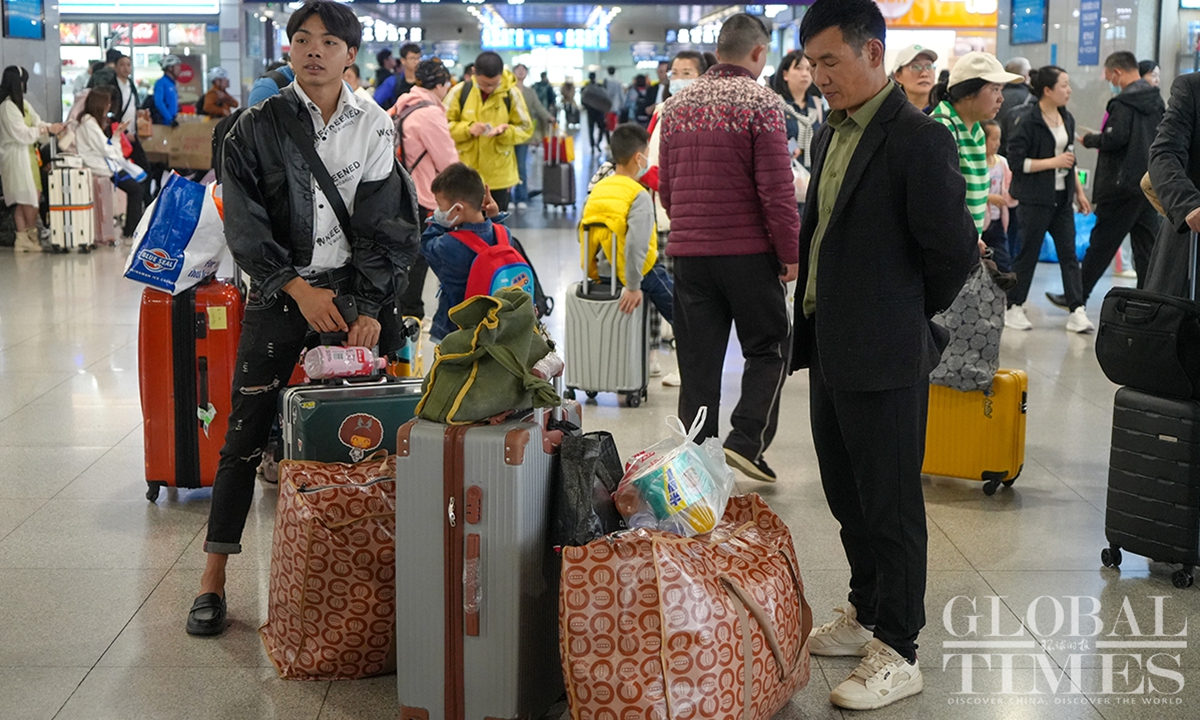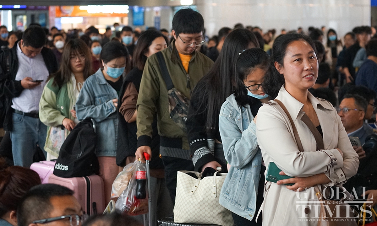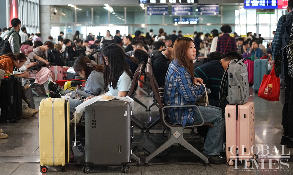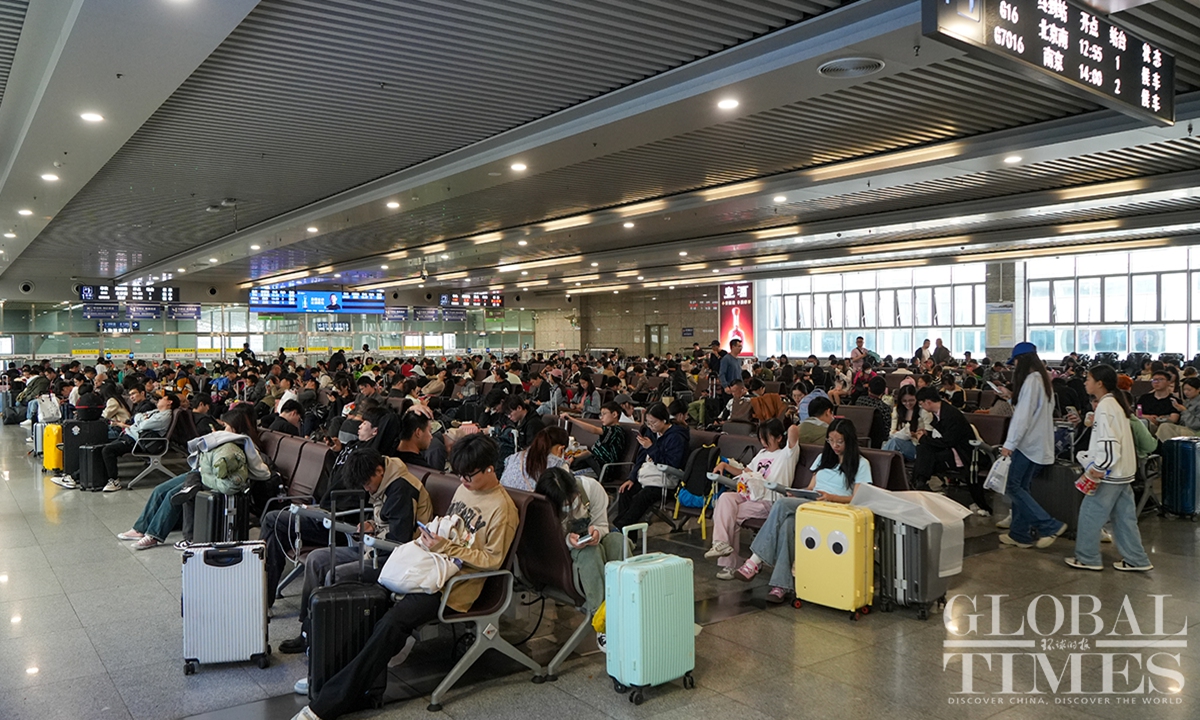 Shanghai’s railway network saw a travel peak on Sunday, the last day of the May Day holidays that lasts from May 1 to 5. It is expected that some 657,000 passengers will arrive at Shanghai by train on Sunday. In addition, railway stations in Shanghai are estimated to see a total of 483,000 passengers leaving the city by train on the same day, as many people choose off-peak travel this year.(Photo: Lu Ting/GT)