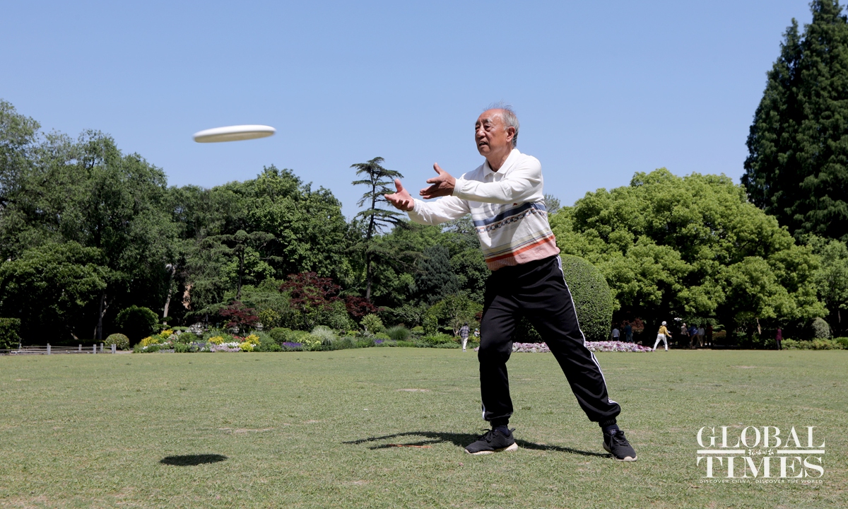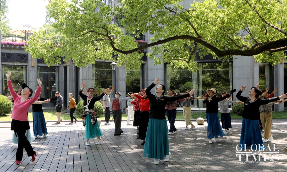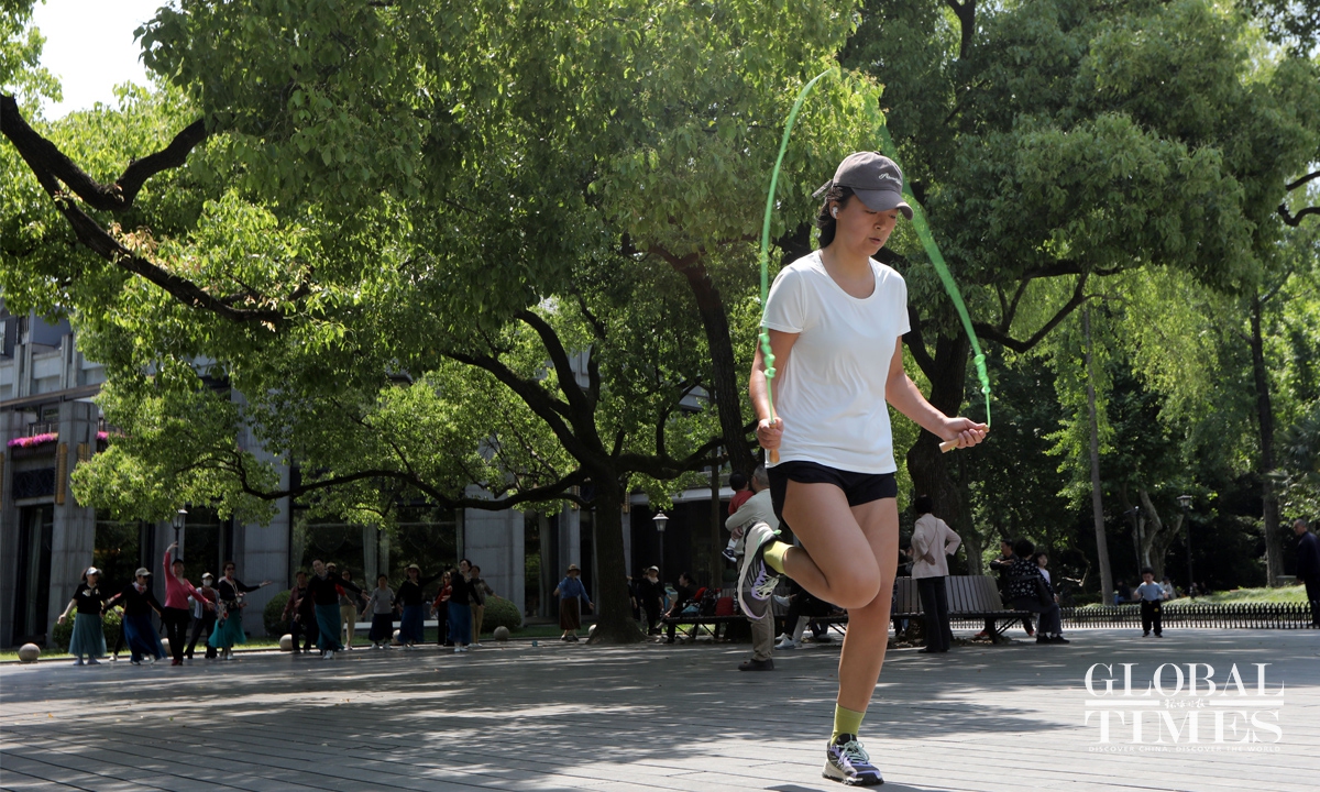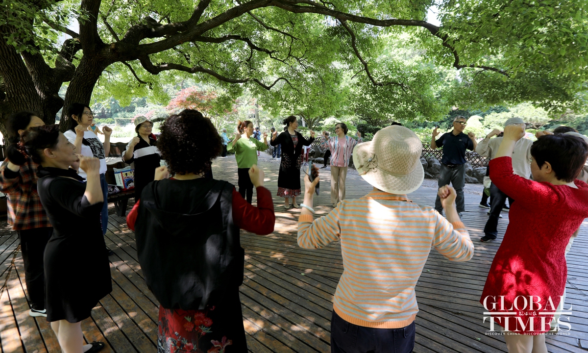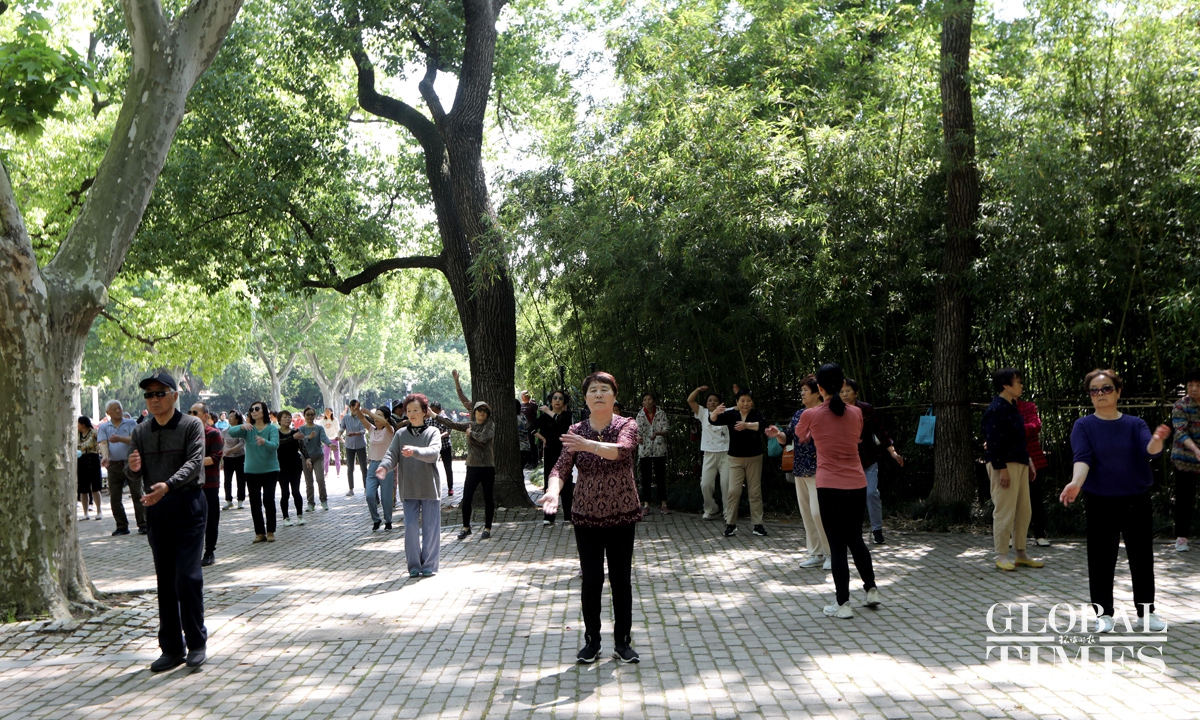 Shanghai residents go out for their morning walks, enjoying the fresh air and the beauty of nature in the Zhongshan Park on Wednesday. Some dance or sing, while others walk, or play games in the park. Some parks in Shanghai are now open to the public 24h/7 to provide better experiences for local residents.