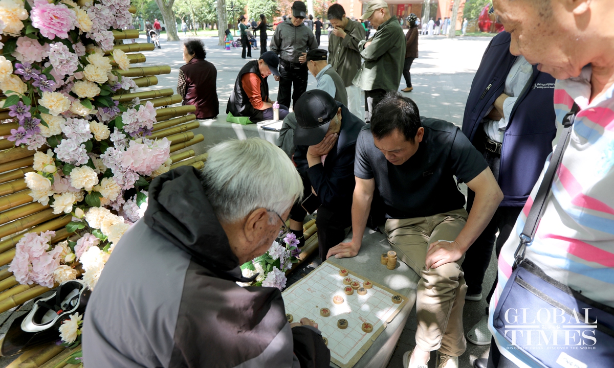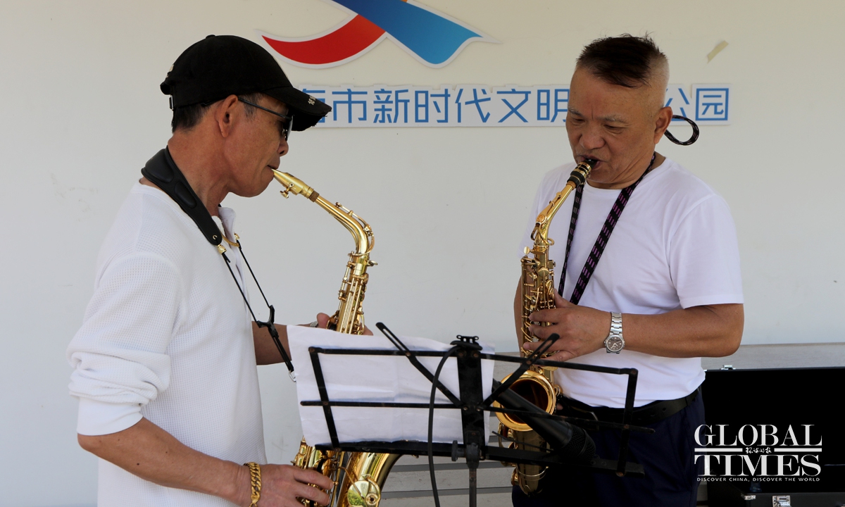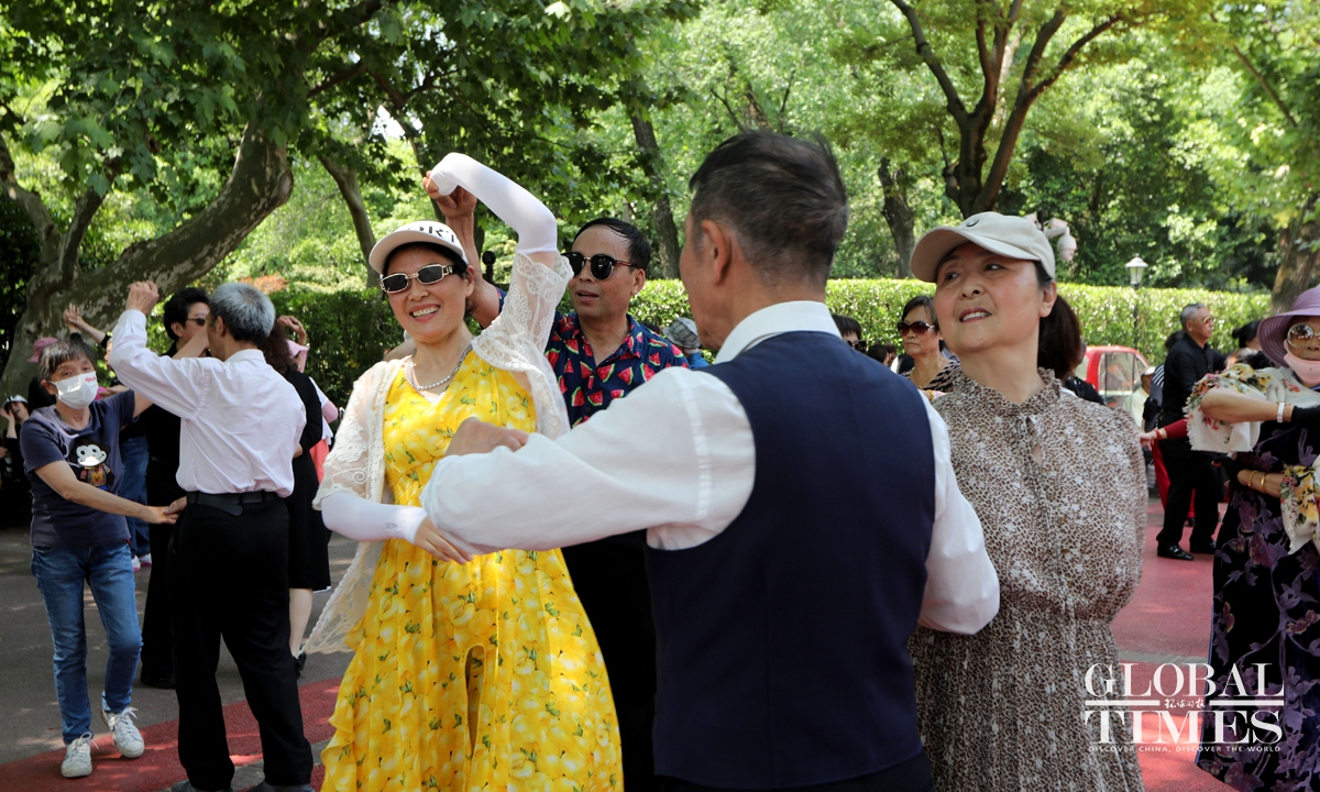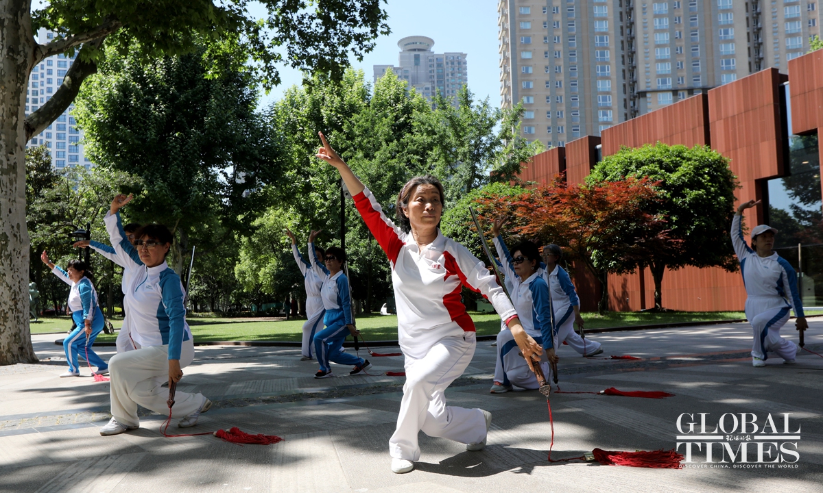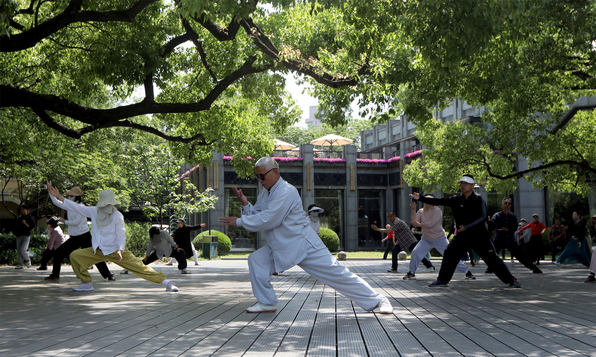 Shanghai residents go out for their morning walks, enjoying the fresh air and the beauty of nature in the Zhongshan Park on Wednesday. Some dance or sing, while others walk, or play games in the park. Some parks in Shanghai are now open to the public 24h/7 to provide better experiences for local residents.