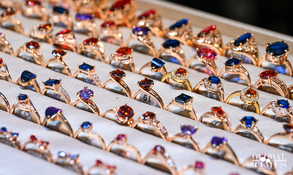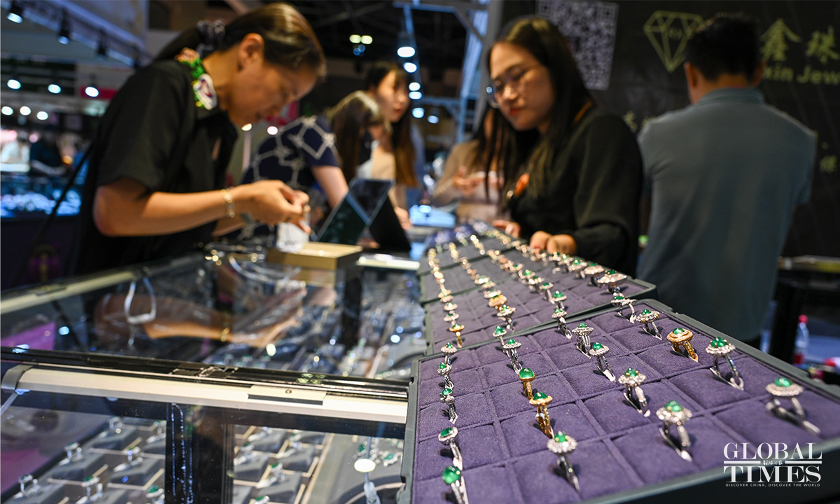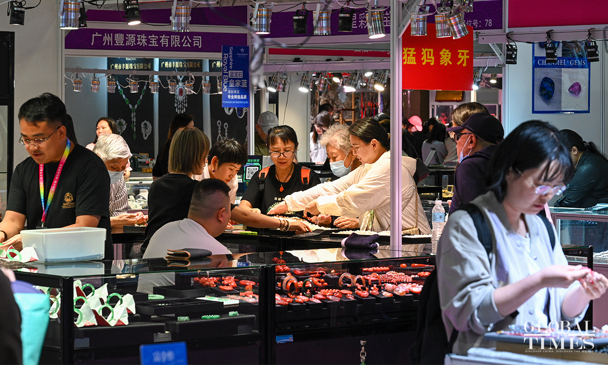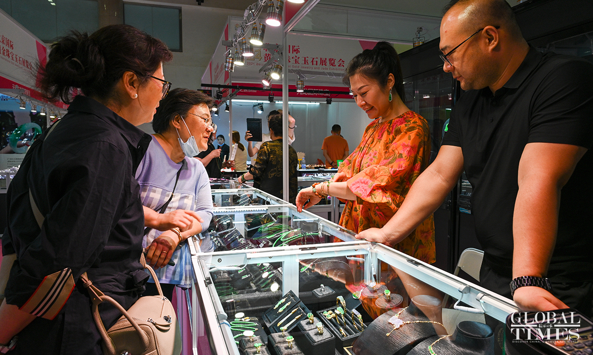 The 2024 Beijing International Gold, Jewelry, and Jade Exhibition kicks off at the Beijing Exhibition Center on Friday. This event has drawn in over 500 exhibitors specializing in jewelry design, processing, manufacturing, wholesale, and retail, showcasing more than 30,000 products. On its opening day, the exhibition welcomed over 20,000 registered professional visitors, ranging from jewelry merchants to designers. (Photos: Chen Tao/GT)