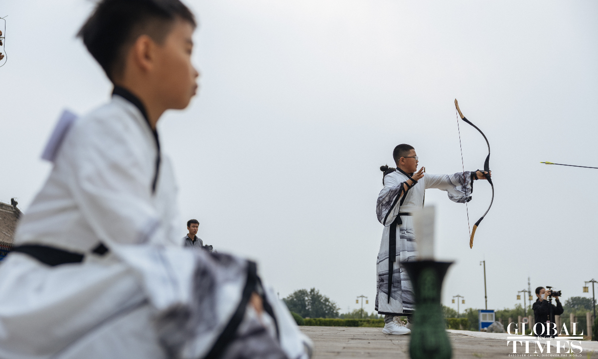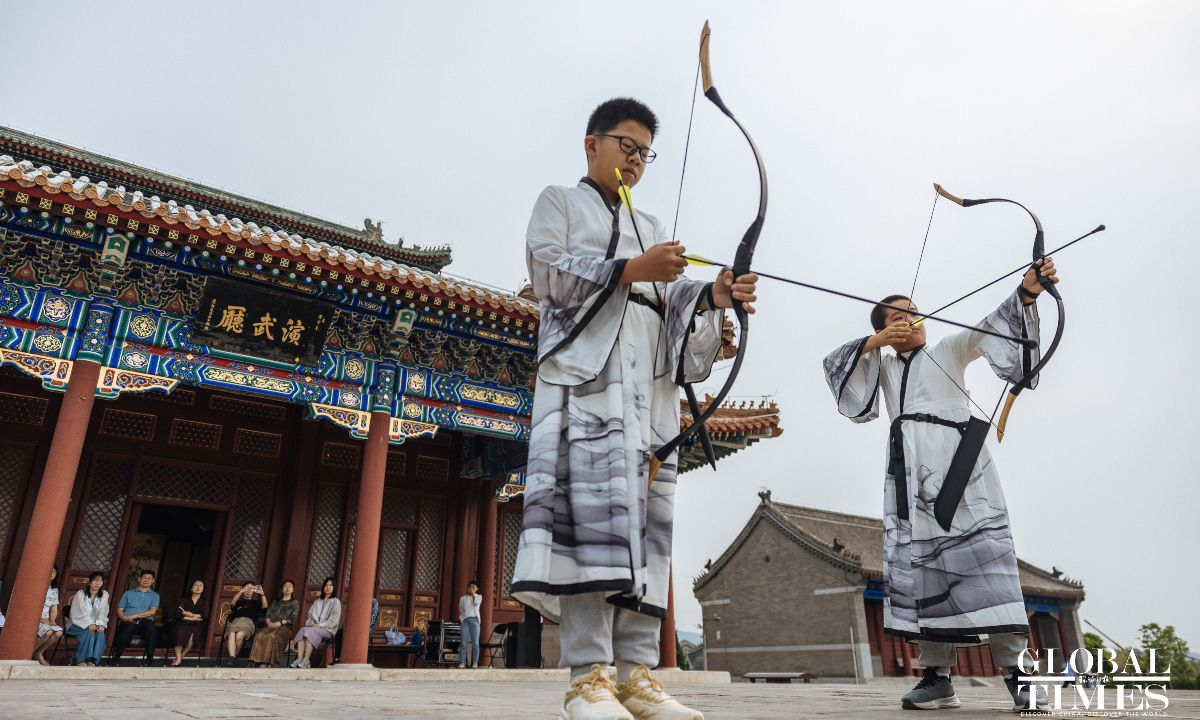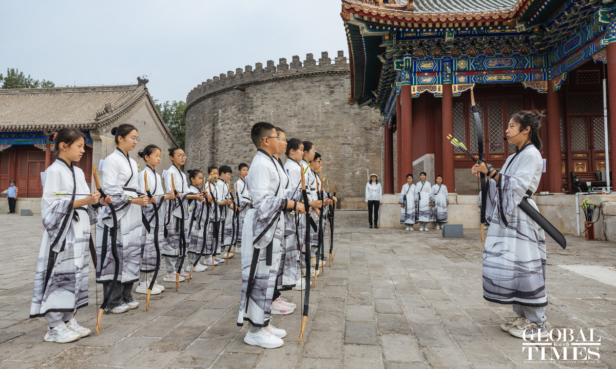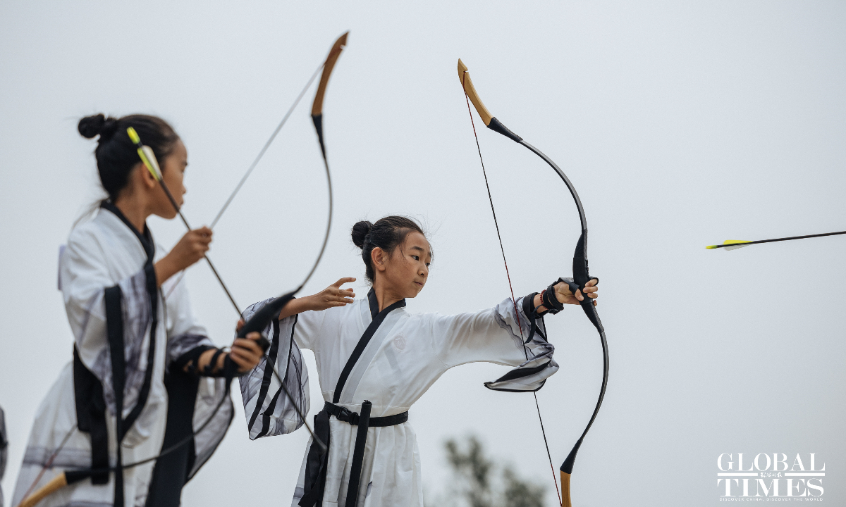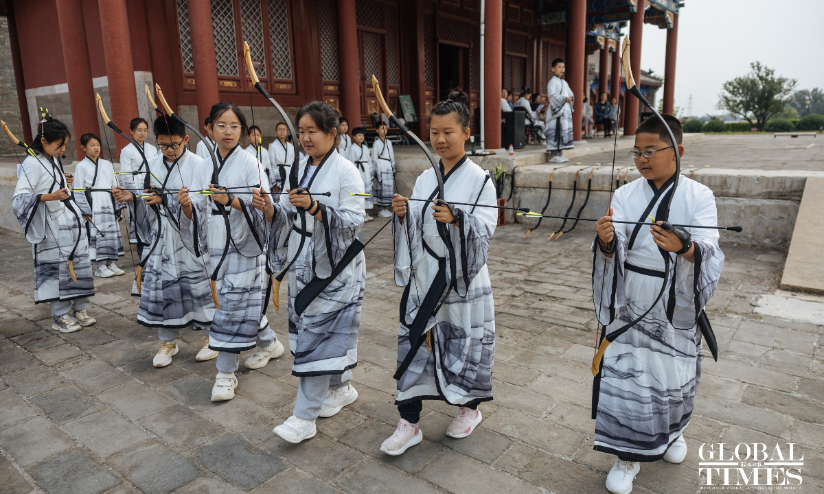 China's archery history spans thousands of years. Every year on the second Saturday of June, China celebrates its Cultural and Natural Heritage Day, which falls on June 8 this year. On June 5, the traditional Archery Cultural Village Shooting Ceremony was held in the square of the Tuancheng Martial Arts Hall, where students from the No. 4 Experimental Primary School in Haidian district, Beijing showcased their skills in archery. (Photos: Li Hao/GT)
