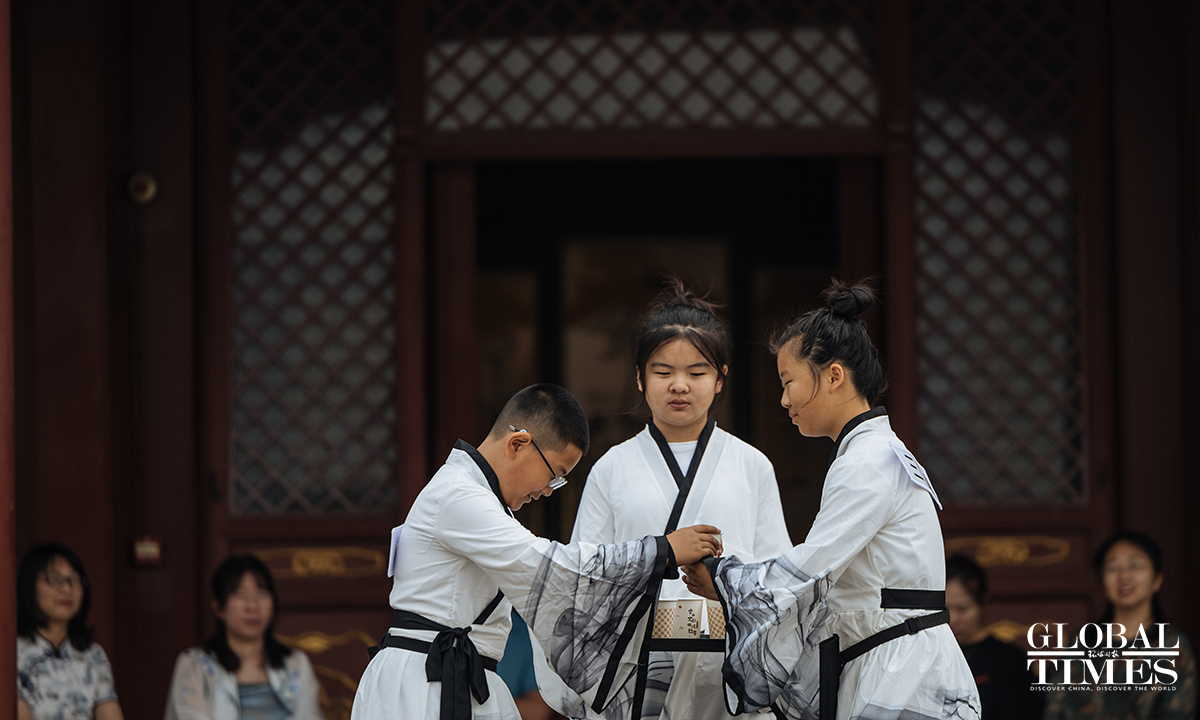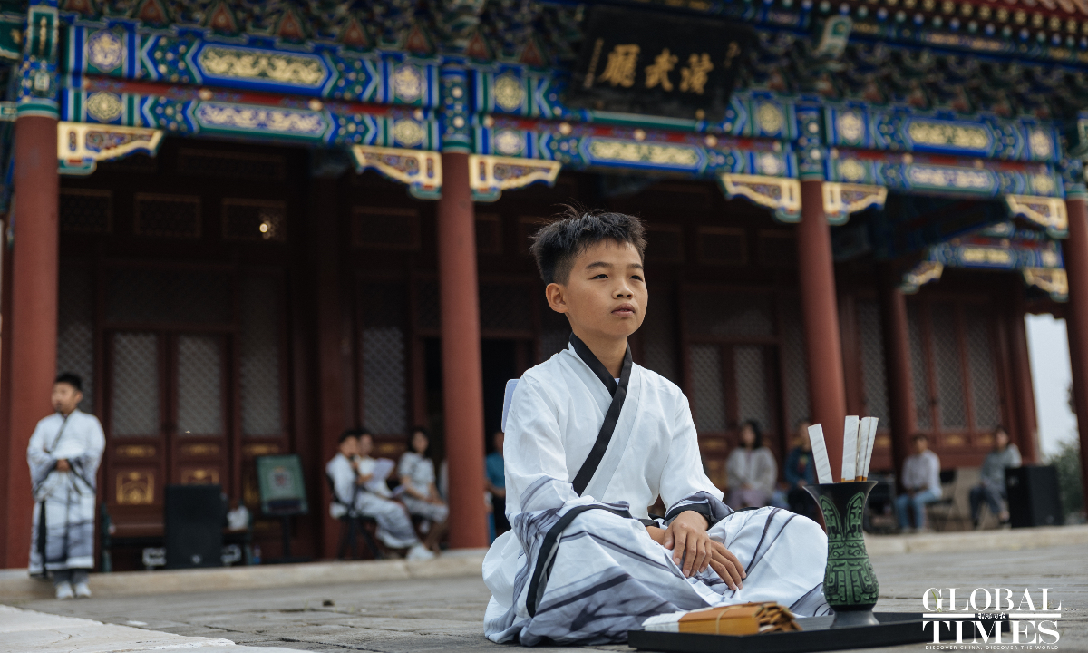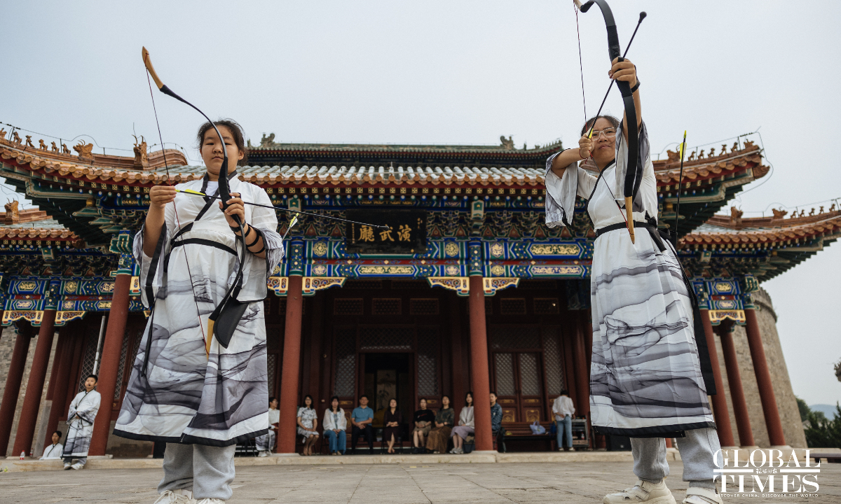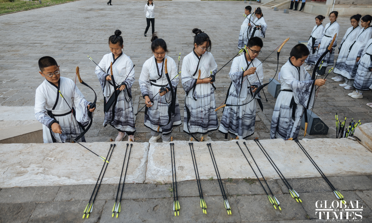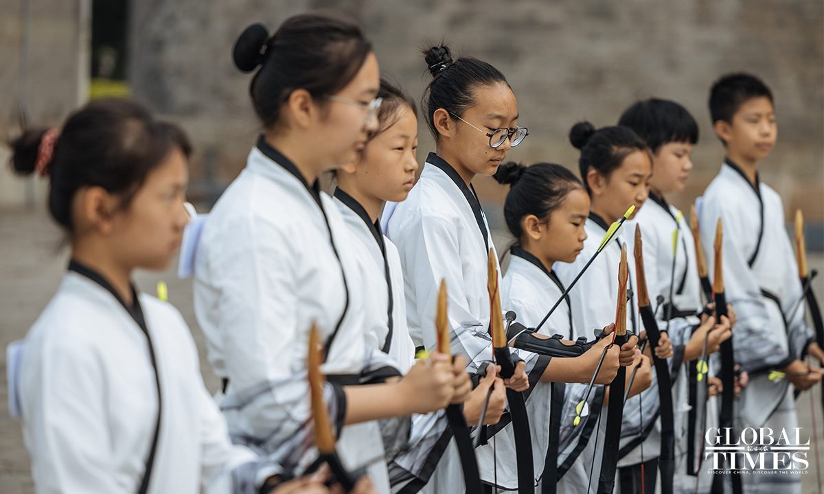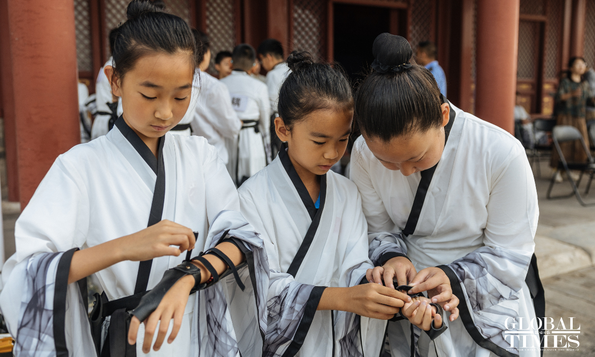 China's archery history spans thousands of years. Every year on the second Saturday of June, China celebrates its Cultural and Natural Heritage Day, which falls on June 8 this year. On June 5, the traditional Archery Cultural Village Shooting Ceremony was held in the square of the Tuancheng Martial Arts Hall, where students from the No. 4 Experimental Primary School in Haidian district, Beijing showcased their skills in archery. (Photos: Li Hao/GT)