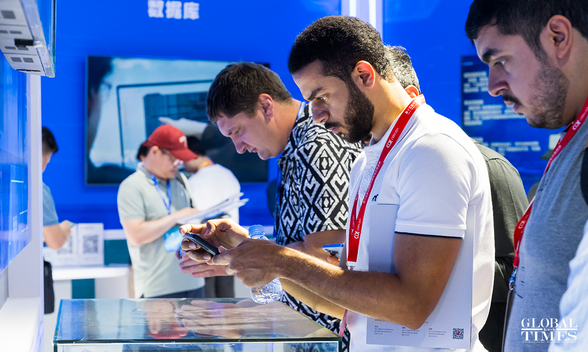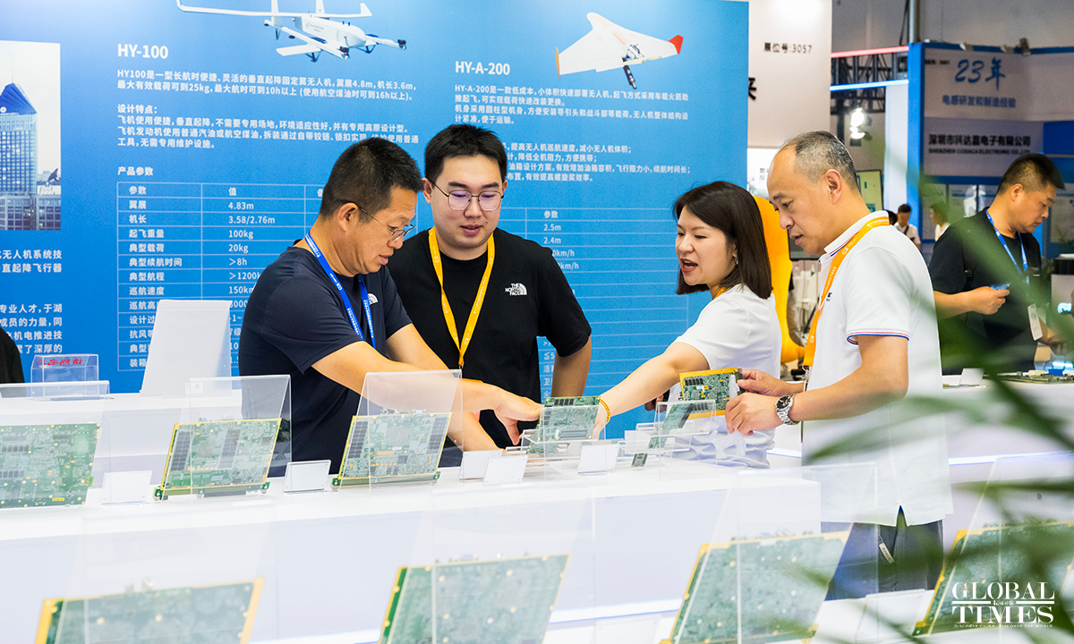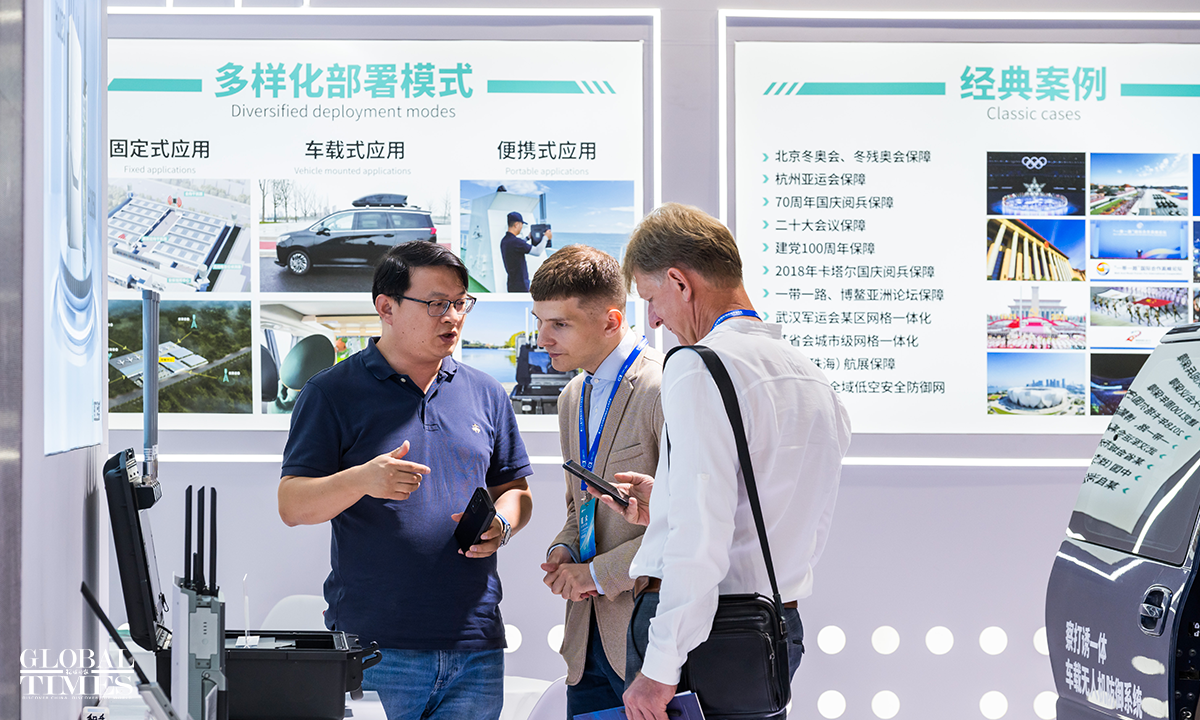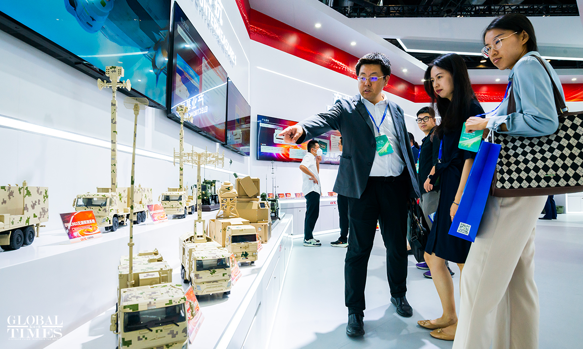 Foreign visitors talk to Chinese exhibitors at the 13th China International Defence Electronics Exhibition which opened at the China National Convention Center in Beijing on June 26, 2024. The exhibition covers an area of nearly 30,000 square meters, with almost 400 companies participating. Photo: Chen Tao/GT figcaption >