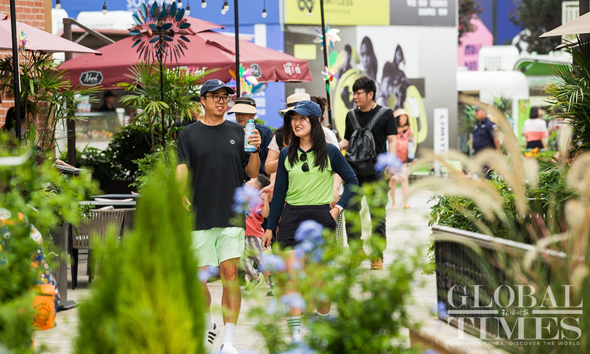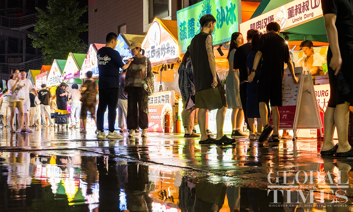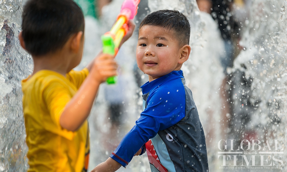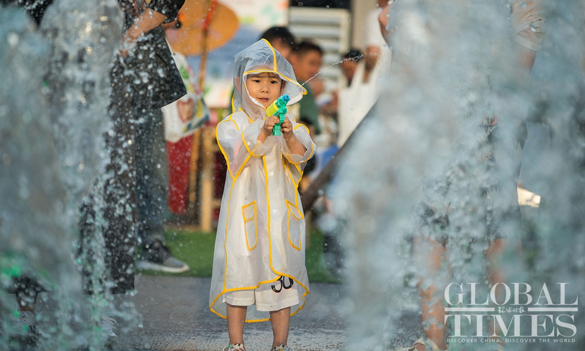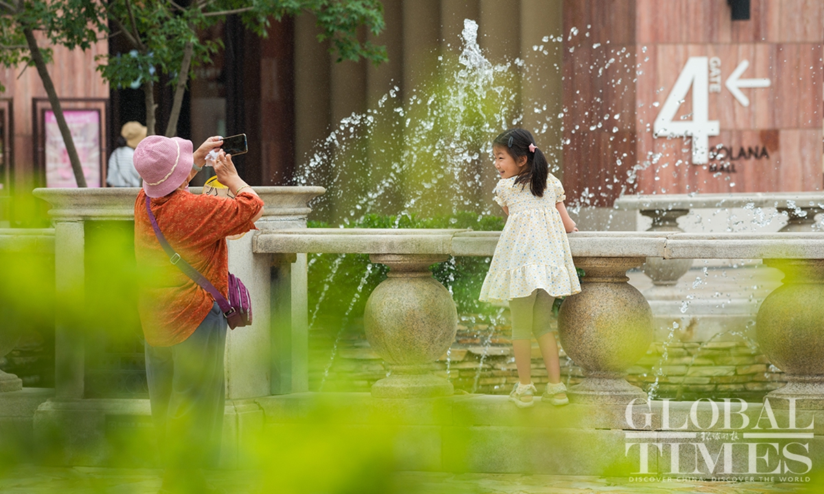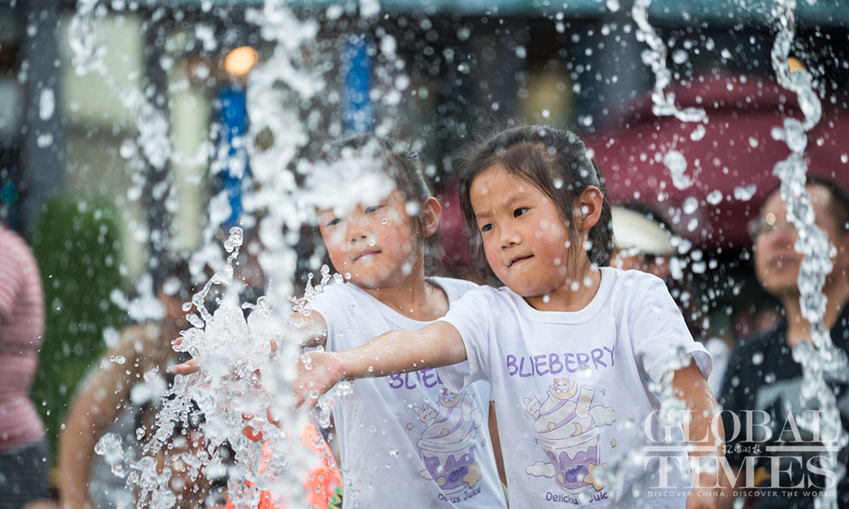 On July 8, as Beijing continues to endure a combination of high temperatures and thunderstorms since the start of the Lesser Heat solar term, the city has experienced increased humidity and an intense feeling of muggy heat. In response, more residents and tourists are flocking to waterfronts, public fountains, shopping centers, and open-air night markets to find respite. People are enjoying water activities, shopping, and dining out in hopes of escaping the oppressive "sauna weather." (Photo: Chen Tao/GT)