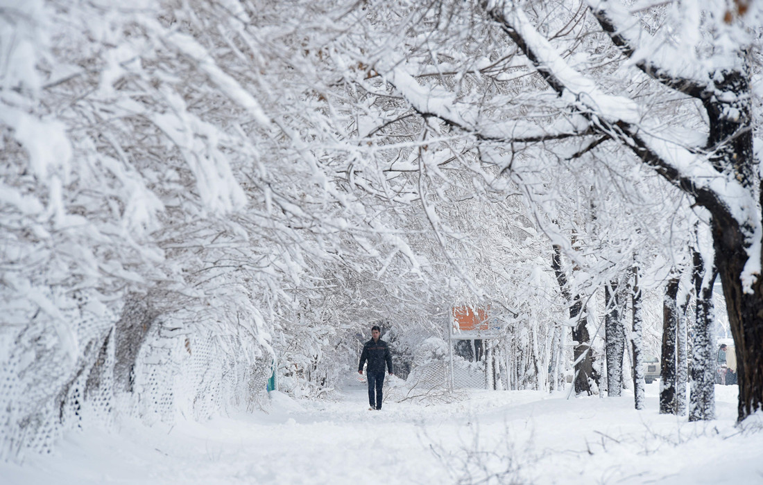 A man walks along a path under snow covered trees in Kabul, Afghanistan on February 5. Photo: CFP/Shah Marai figcaption >