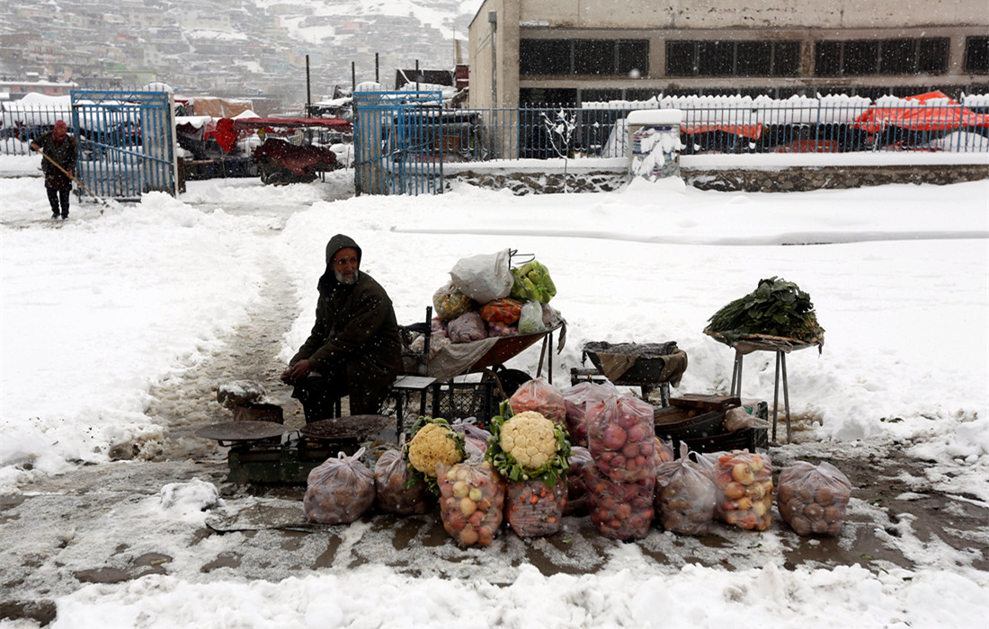 A vender sells vegetables on a snowy street in Kabul, Afghanistan on February 5. Photo: CFP/Omar Sobhani figcaption >