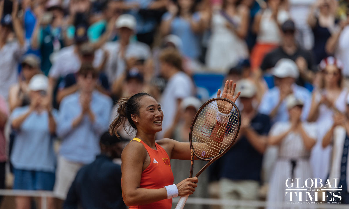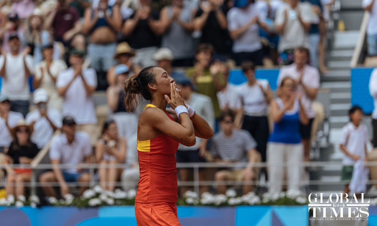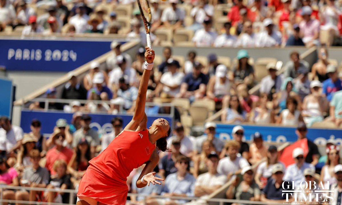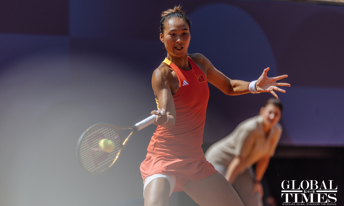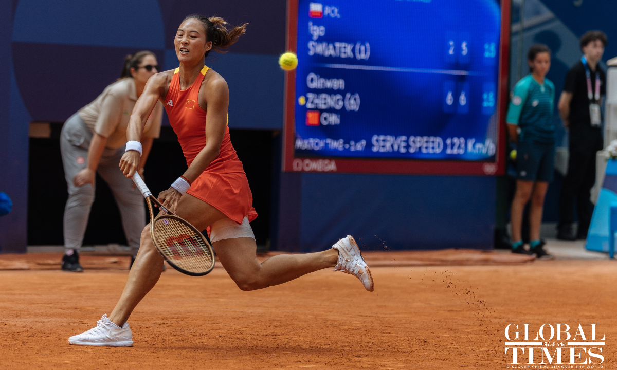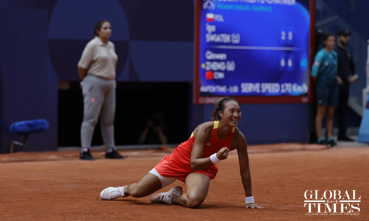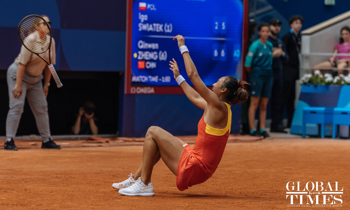 On Thursday, China's tennis sensation Zheng Qinwen made history by becoming the first Asian-born player to reach a singles final in tennis at the Olympics. The sixth seed delivered a stunning performance, defeating world No.1 Iga Swiatek of Poland in the semifinals at the Paris Olympics. (Photos: Li Hao/GT)