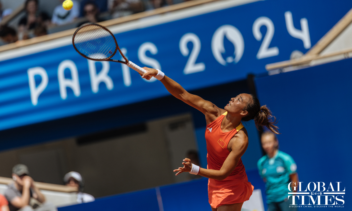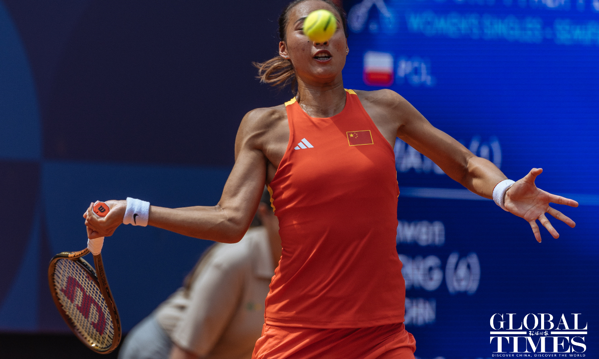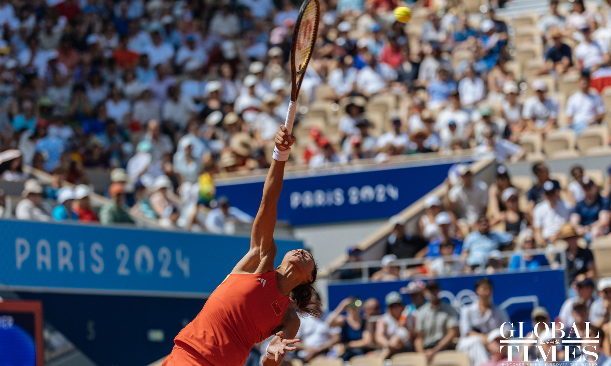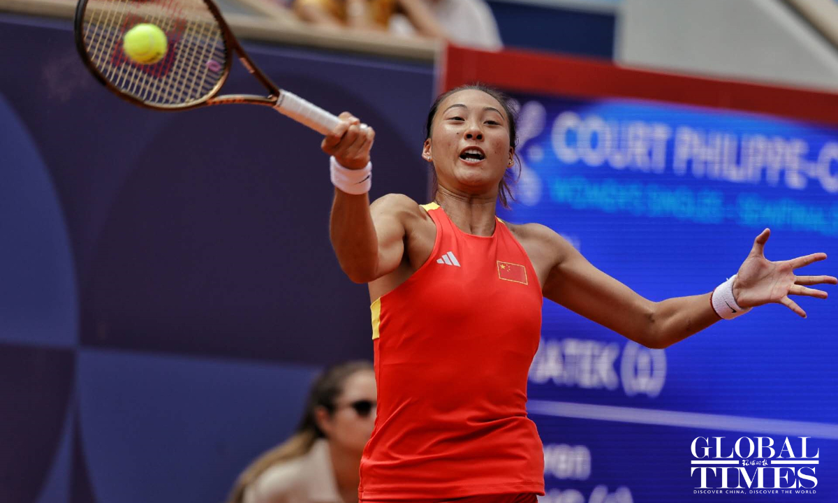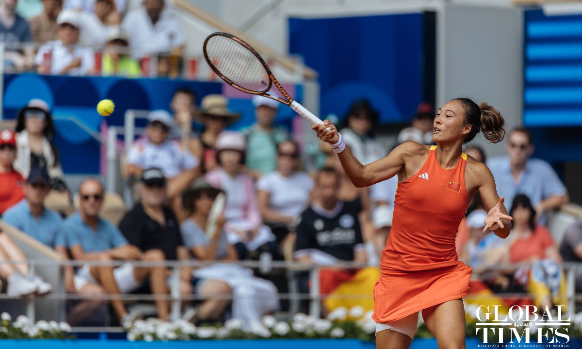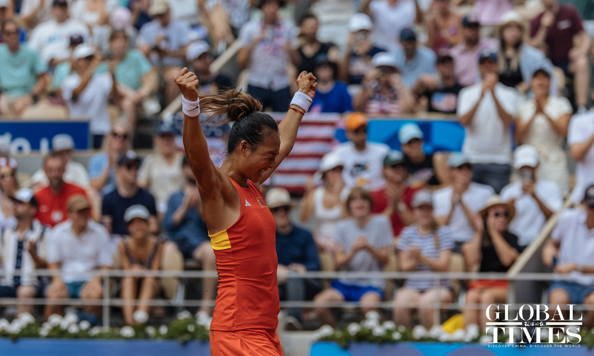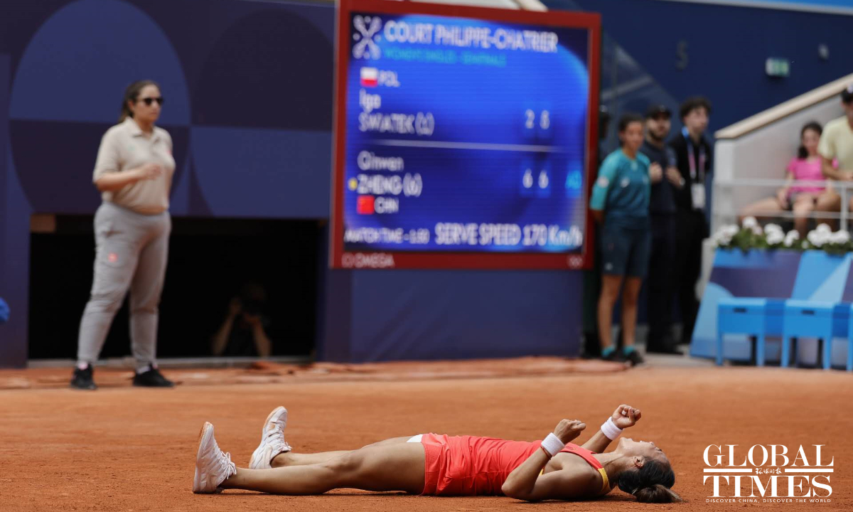 On Thursday, China's tennis sensation Zheng Qinwen made history by becoming the first Asian-born player to reach a singles final in tennis at the Olympics. The sixth seed delivered a stunning performance, defeating world No.1 Iga Swiatek of Poland in the semifinals at the Paris Olympics. (Photos: Li Hao/GT)