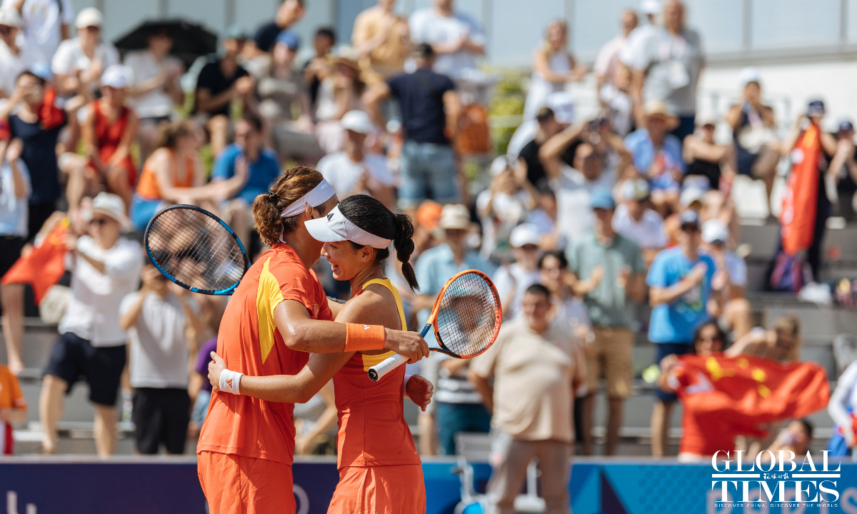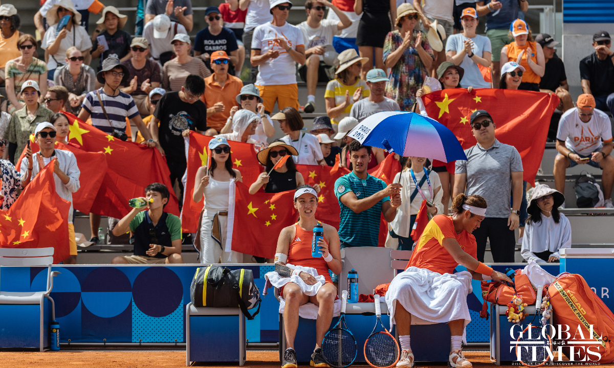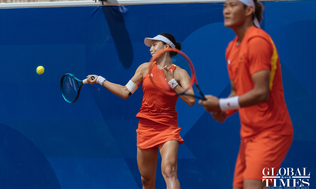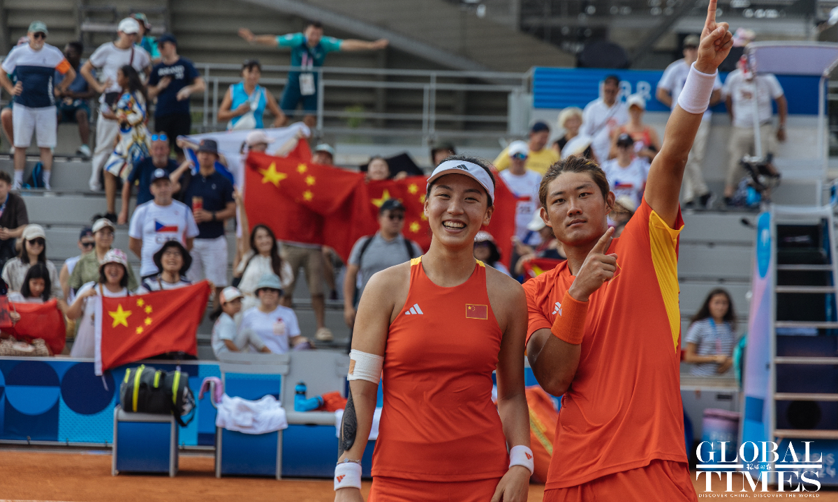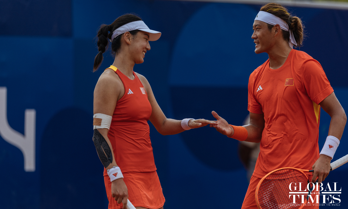 On Thursday, Chinese pair Wang Xinyu and Zhang Zhizhen made history by coming from behind to beat Demi Schuurs and Wesley Koolhof of the Netherlands, securing their spot in the Paris Olympics tennis mixed doubles final. (Photos: Li Hao/GT)