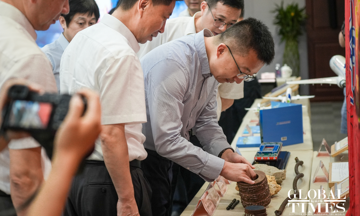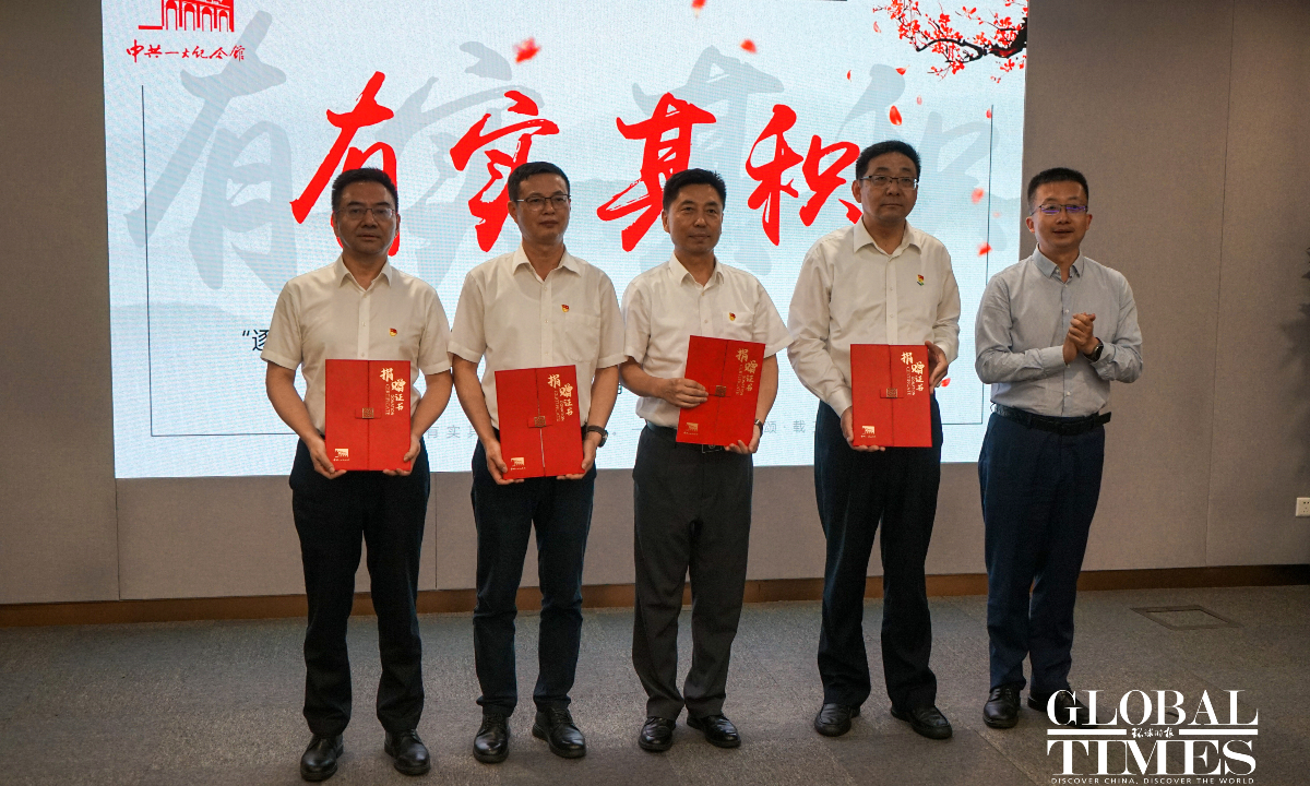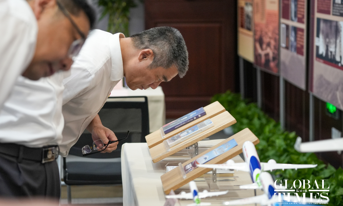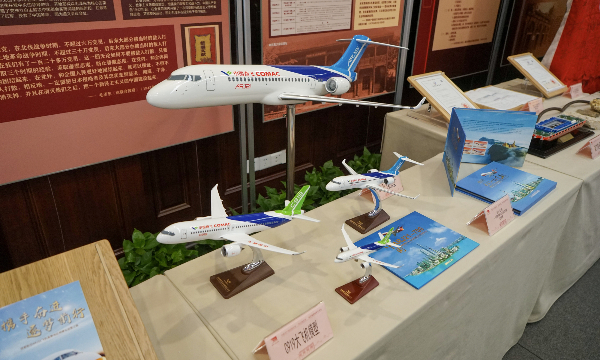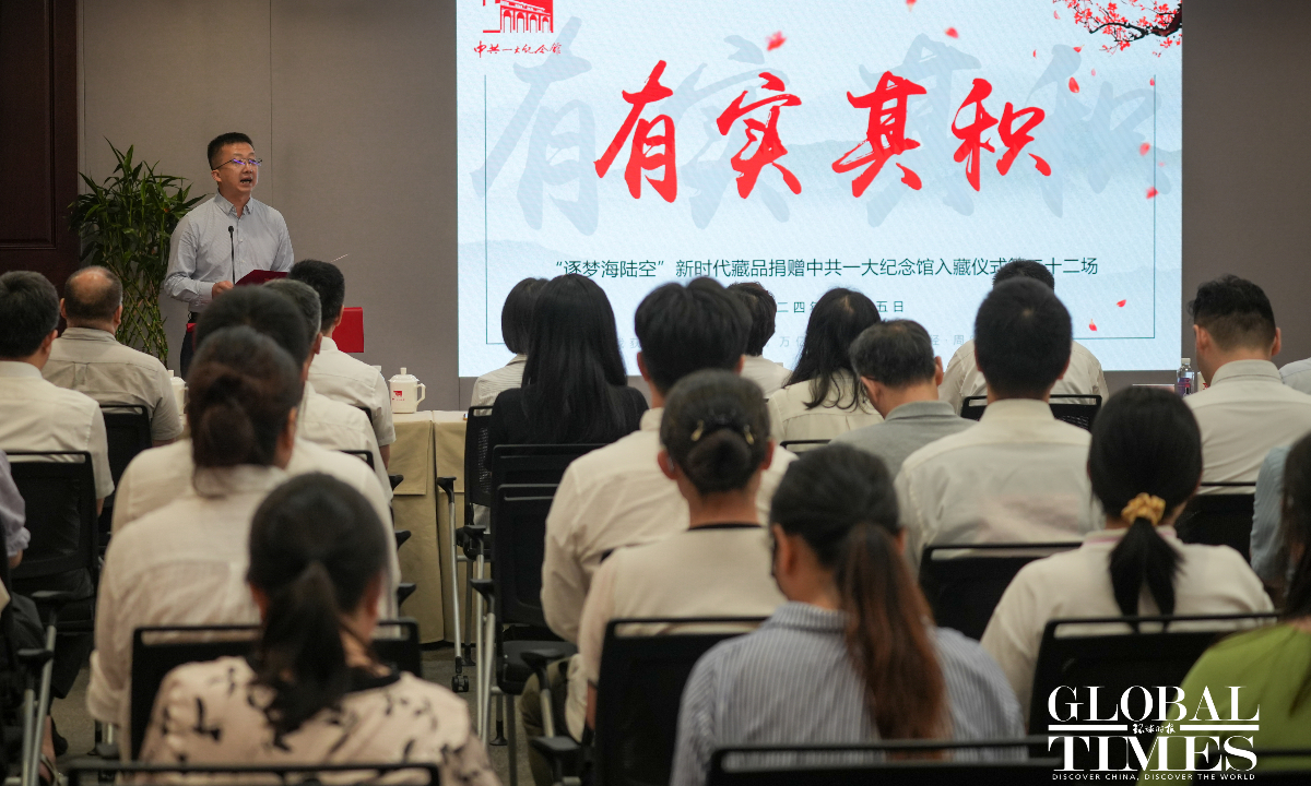 A donation ceremony was held at the Memorial Hall of the First National Congress of the Communist Party of China on Thursday in Shanghai. The donated collections include the model of C919, China's self-developed large passenger aircraft, the model Fenli, specially designed and built for the salvage operation of the Yangtze River Estuary No 2 ancient vessel, and the flag signed by the 27th Antarctic expedition team, which has witnessed the development of China's polar research efforts. (Photos:Lu Ting/GT)