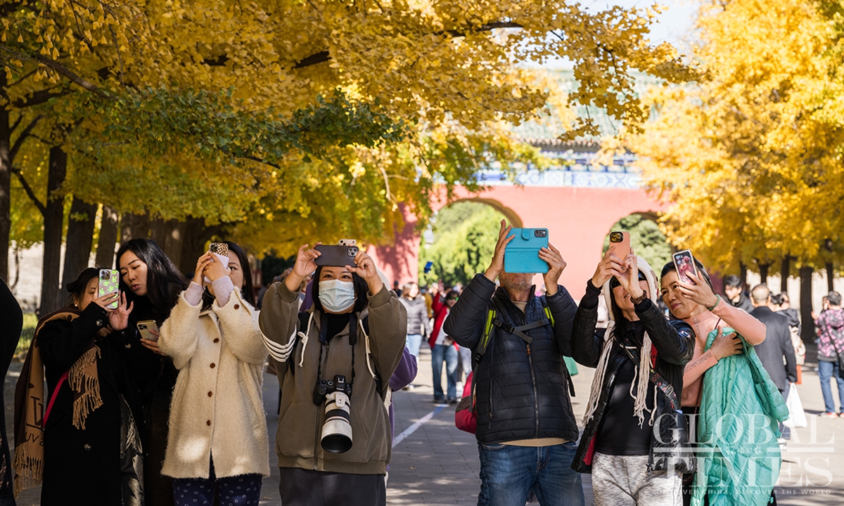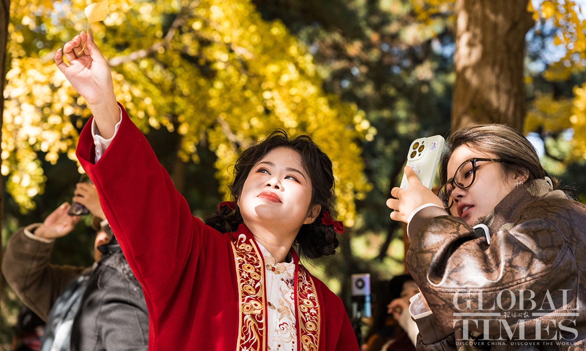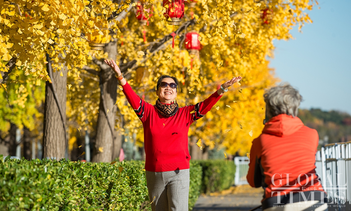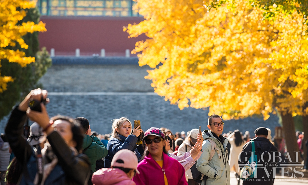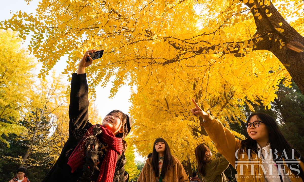 On this day, the golden hues of ginkgo leaves in Beijing's parks, green spaces, and along the roadsides reach their peak. A romantic early winter landscape unfolds, attracting residents and tourists alike to capture its poetic beauty.(Photo: Chen Tao/GT)
