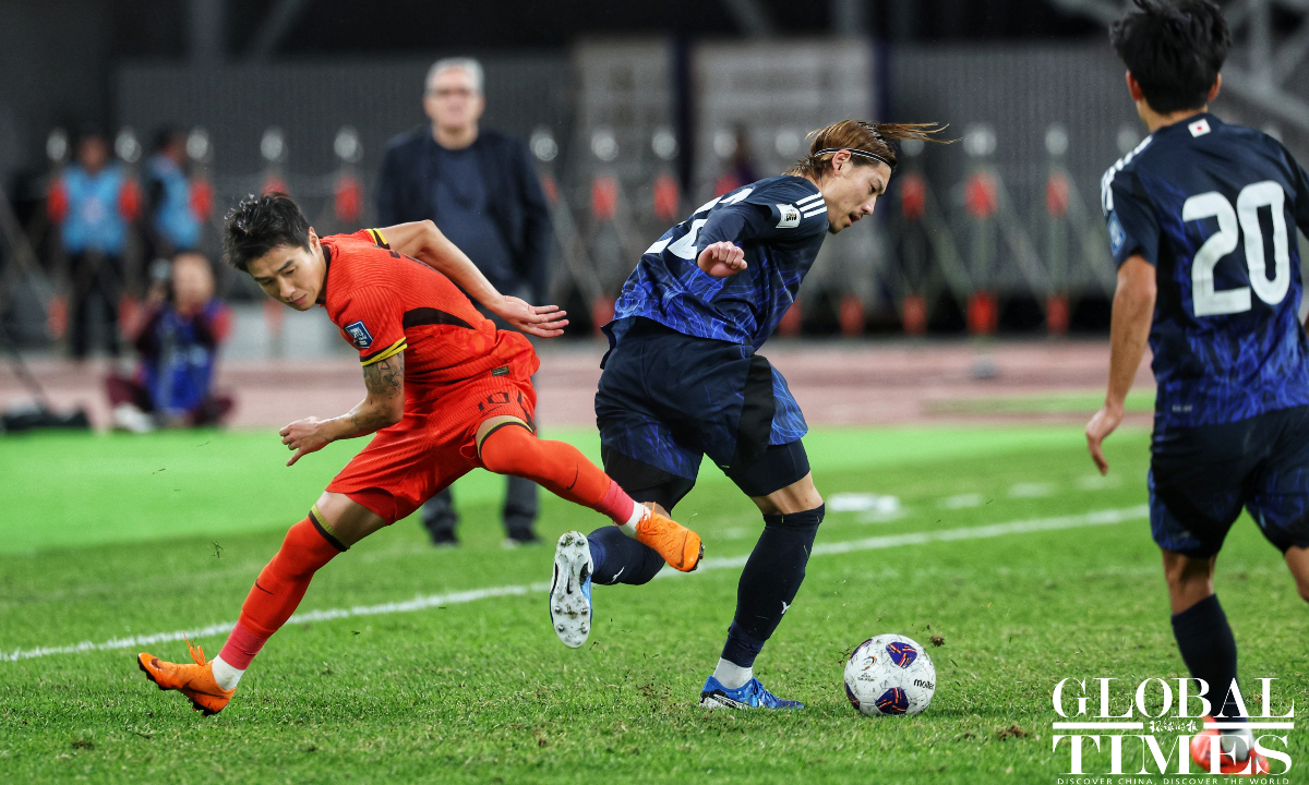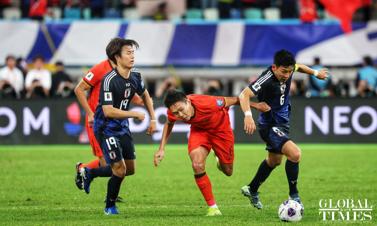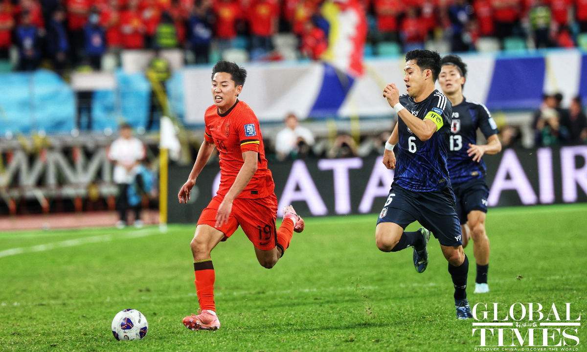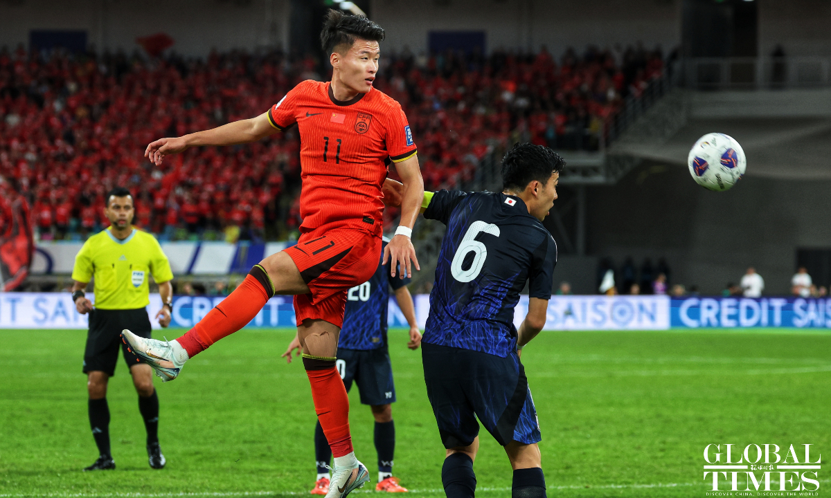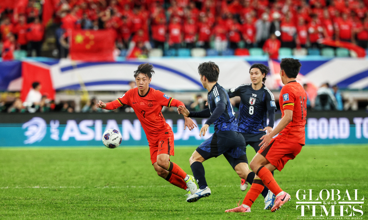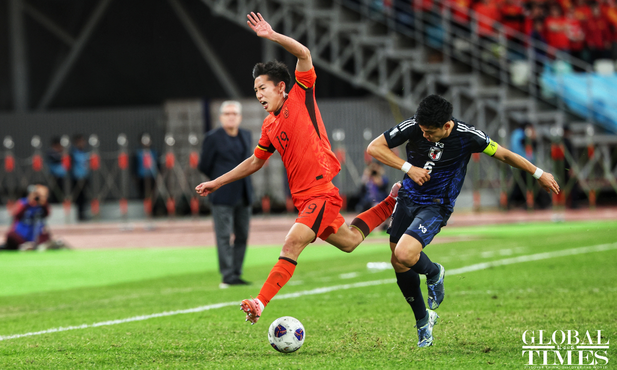 On November 19, during the sixth round of Group C of the third stage of the FIFA World Cup Asian Qualifier, China hosted Japan at Xiamen’s Egret Stadium. After a fierce battle, the Chinese team ultimately lost 1-3 to Japan. Three minutes into the second half, China's Xie Wenneng dribbled past two defenders, and Wei Shihao assisted Lin Liangming in scoring. (Photos: Cui Meng/GT)