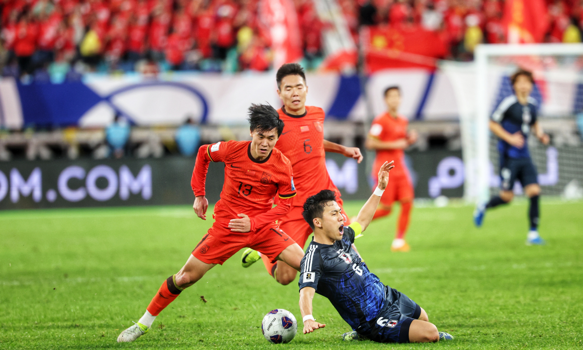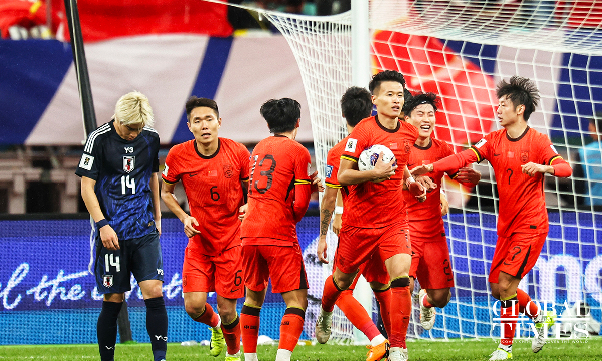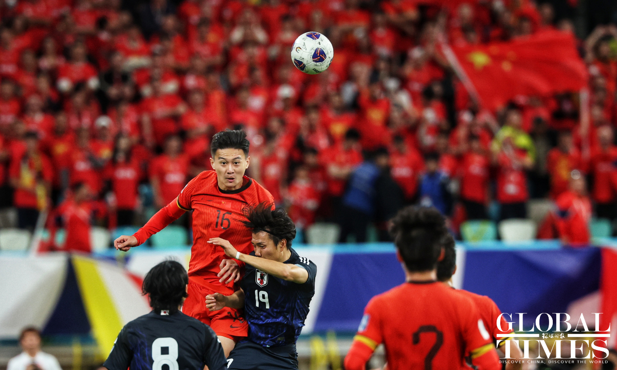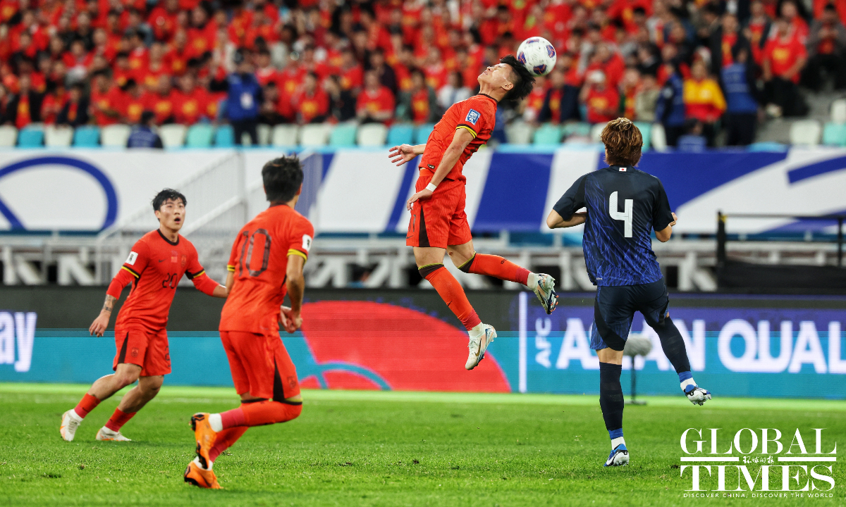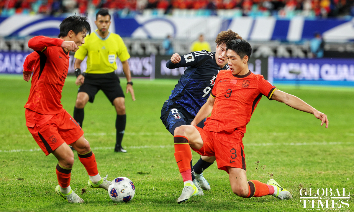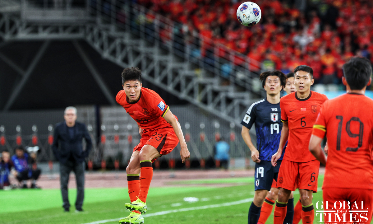 On November 19, during the sixth round of Group C of the third stage of the FIFA World Cup Asian Qualifier, China hosted Japan at Xiamen’s Egret Stadium. After a fierce battle, the Chinese team ultimately lost 1-3 to Japan. Three minutes into the second half, China's Xie Wenneng dribbled past two defenders, and Wei Shihao assisted Lin Liangming in scoring. (Photos: Cui Meng/GT)